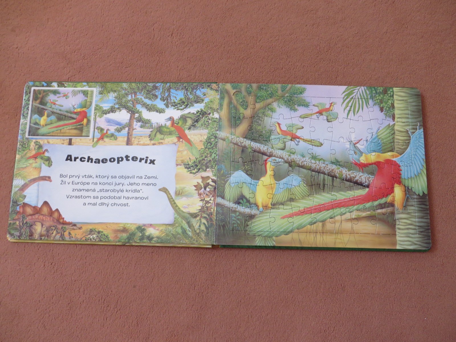 Predám krásnu, veľkú knižku (niečo viac ako A4) o dinosauroch a ich živote, spolu s puzzlami. Každá dvojstrana obsahuje aj vpravo krátky popis a na ľavej strane puzzle. Je tam 5 dvojstrán, takže 5x dinosarových puzzle. Puzzle sa dobre skladajú. pretože je ten istý obrázok ako podklad a vkladajú sa puzzle naň. Žiaľ, na prvom obrázku nám jedno puzzle chýba, nevieme ho nájsť. Ale ako je vidno na fotke, neprekáža to ani skladaniu ani vizuálne veľmi, keďže pod puzzlami sú tie obrázky.