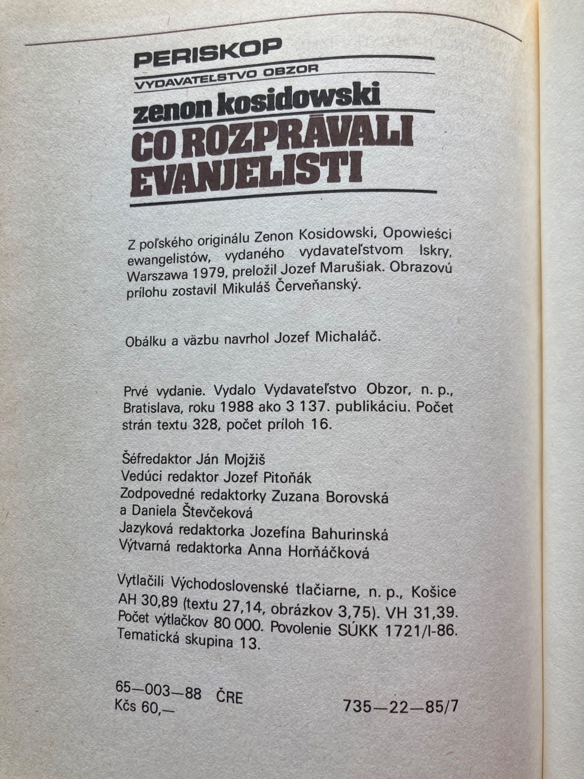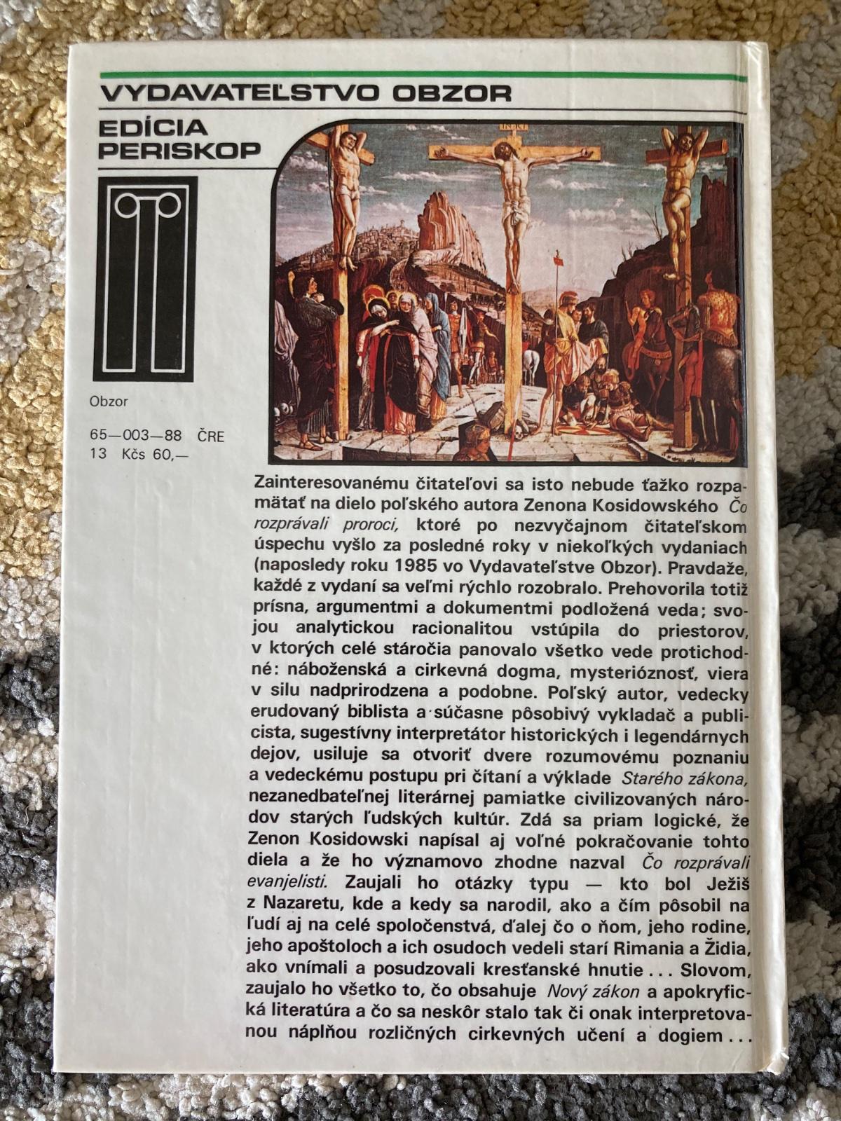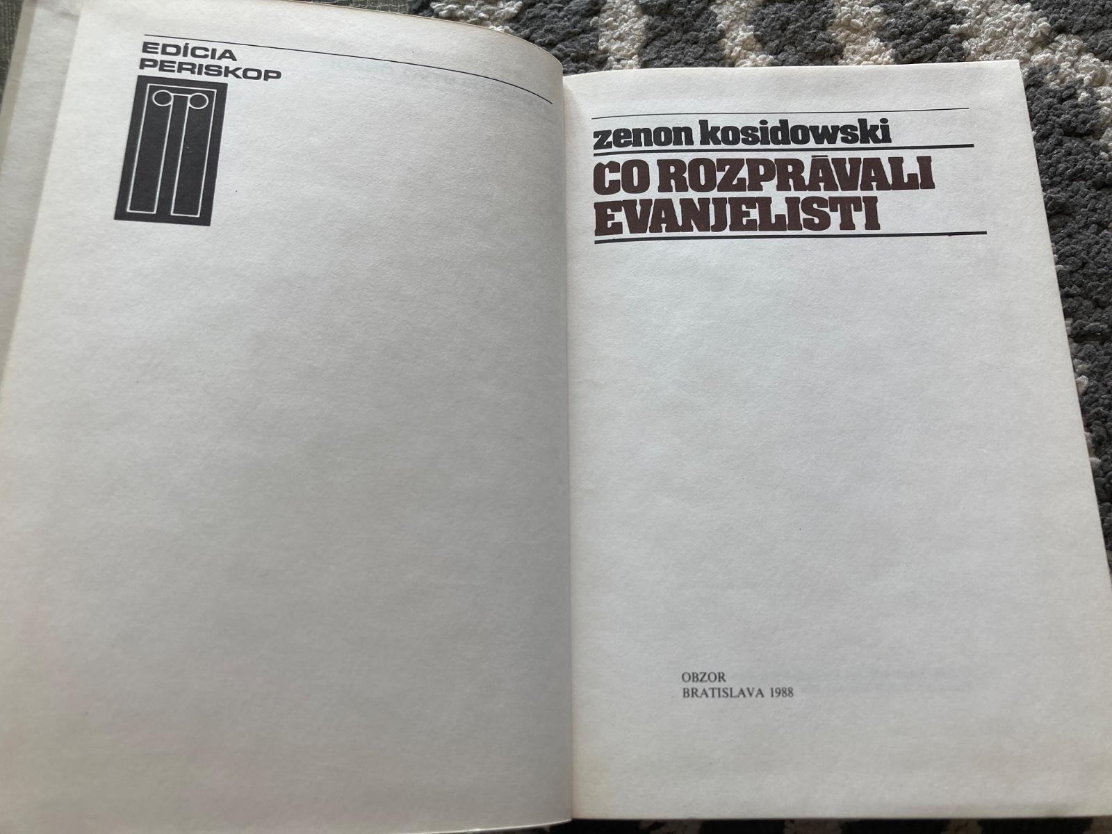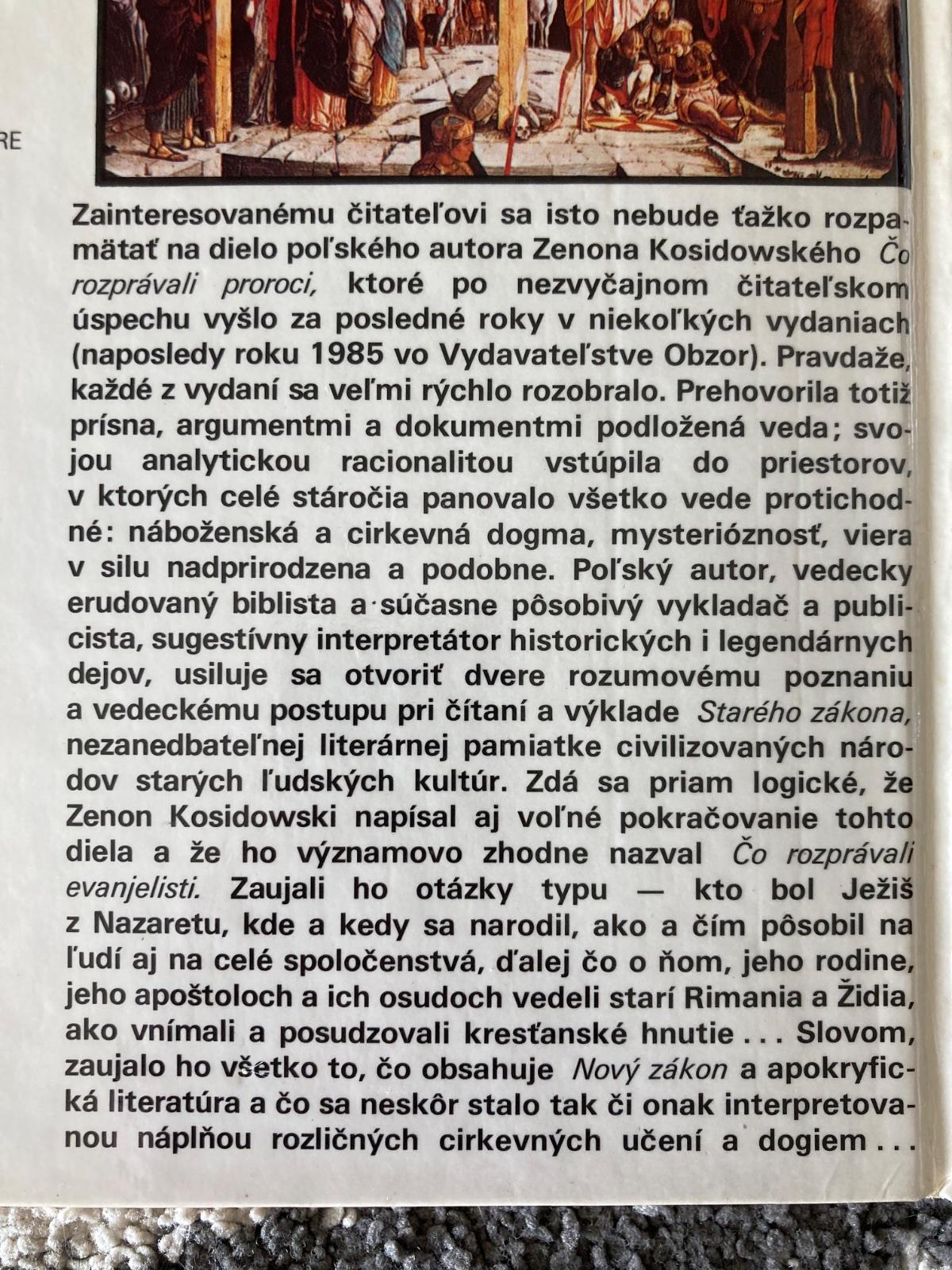 📌Zainteresovanému čitateľovi sa isto nebude ťažko rozpamätať na dielo poľského autora Zenona Kosidowského Čo rozprávali proroci, ktoré po nezvyčajnom čitateľskom úspechu vyšlo za posledné roky v niekoľkých vydaniach (naposledy roku 1985 vo Vydavateľstve Obzor). Zdá sa priam logické, že Zenon Kosidowski napísal aj voľné pokračovanie tohto diela a že ho významovo zhodne nazval Čo rozprávali evanjelisti. Zaujali ho otázky typu kto bol Ježiš z Nazaretu, kde a kedy sa narodil, ako a čím pôsobil na ľudí aj na celé spoločenstvá, ďalej čo o ňom, jeho rodine, jeho apoštoloch a ich osudoch vedeli starí Rimania a Židia, ako vnímali a posudzovali kresťanské hnutie... Slovom, zaujalo ho všetko to, čo obsahuje Nový zákon a apokryfická literatúra a čo sa neskôr stalo tak či onak interpretovanou náplňou rozličných cirkevných učení a dogiem