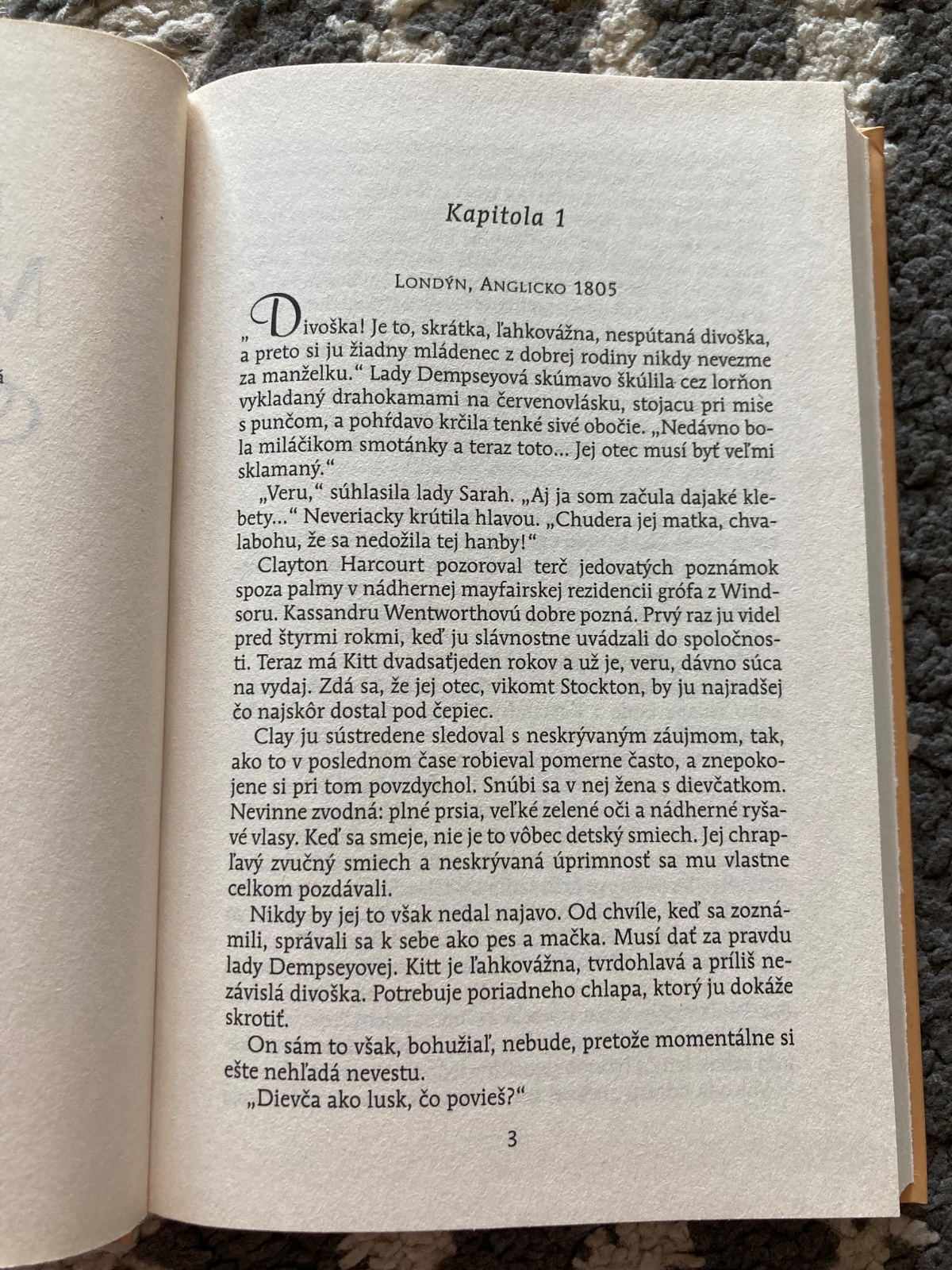 🎀 Krásna a temperamentná Kassandra Wentworthová nemá najmenšiu chuť poslúchať žiadneho muža. V detstve to dokazovala svojmu otcovi, v dospelosti sa o tom presvedčil nejeden nápadník. Ohnivý temperament ryšavej krásky pritiahol ako svetlo v tme aj Claytona Harcourta, ktorý počul o Kassandre len nepekné klebety. Na hazardného hráča a vychýreného zvodcu žien však majú opačný účinok...