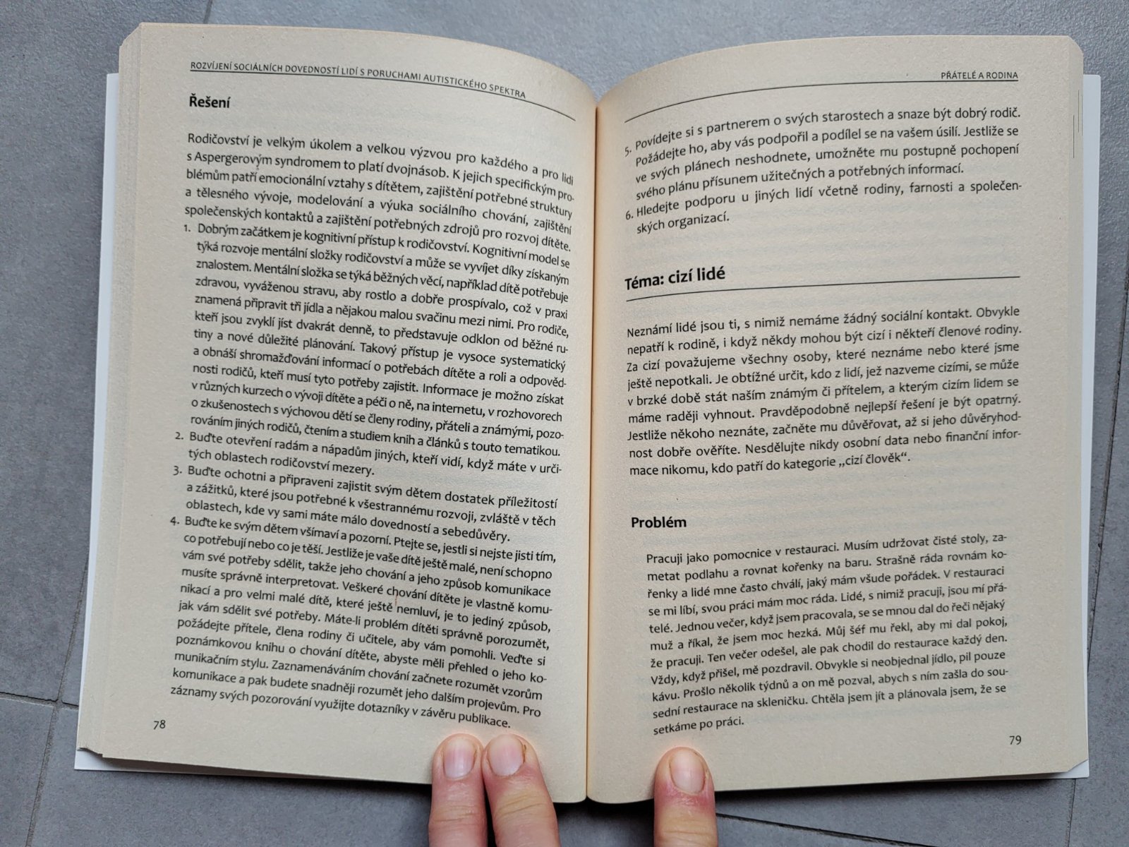 (PAS) výrazně ovlivňují zvládání běžných sociálních situací, do kterých se lidé dostávají. Nedorozumění vedou ke konfliktům a desinterpretacím, případně k izolaci člověka s PAS. Autorka nabízí tipy a strategie pro zvládání běžných situací, kterými jsou např. návštěva lékaře, hledání vhodného zaměstnání, cestování městskou hromadnou dopravou, i pro navazování přátelských a důvěrných vztahů.