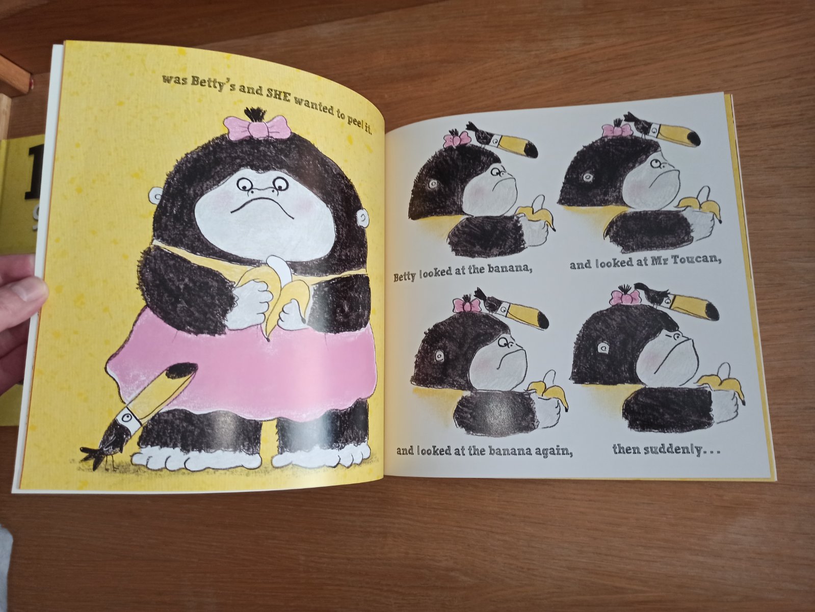 Vresk, krik, hadzanie sa o zem - Betty chce sama otvorit banan. Tukan ju ukludni, ze nabuduce si moze sama otvorit banan. Betty zacne jest banan.