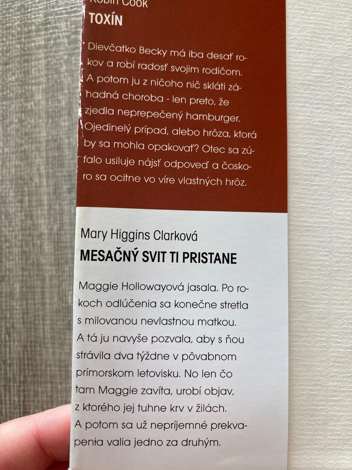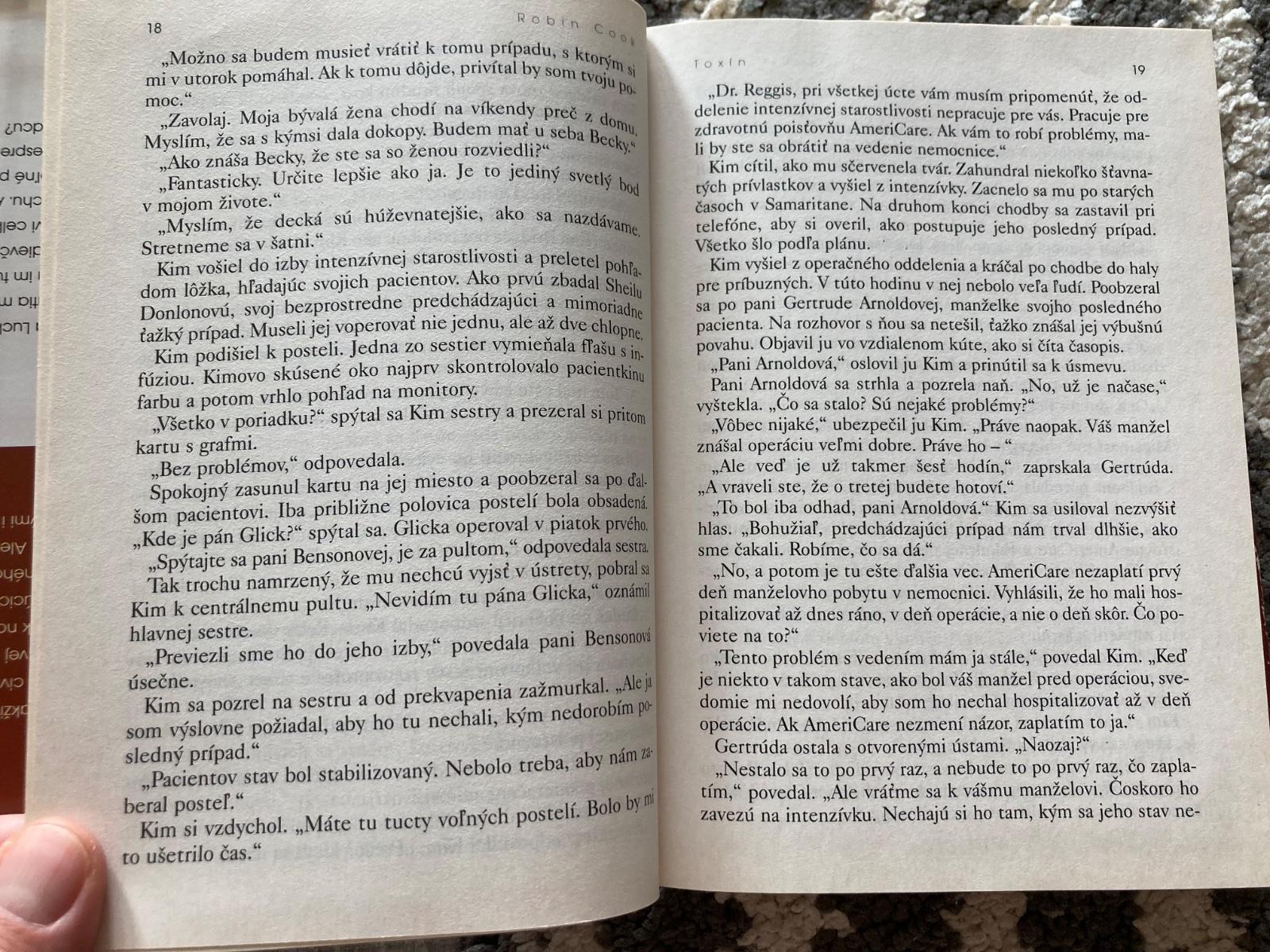 TOXÍN /Robin Cook/ - 10-ročná Becky si nevedela predstaviť väčšie potešenie ako návštevu v miestnej jedálni. Veľmi jej tu chutilo, no nemohol nikto tušiť, že to ohrozí jej zdravie.