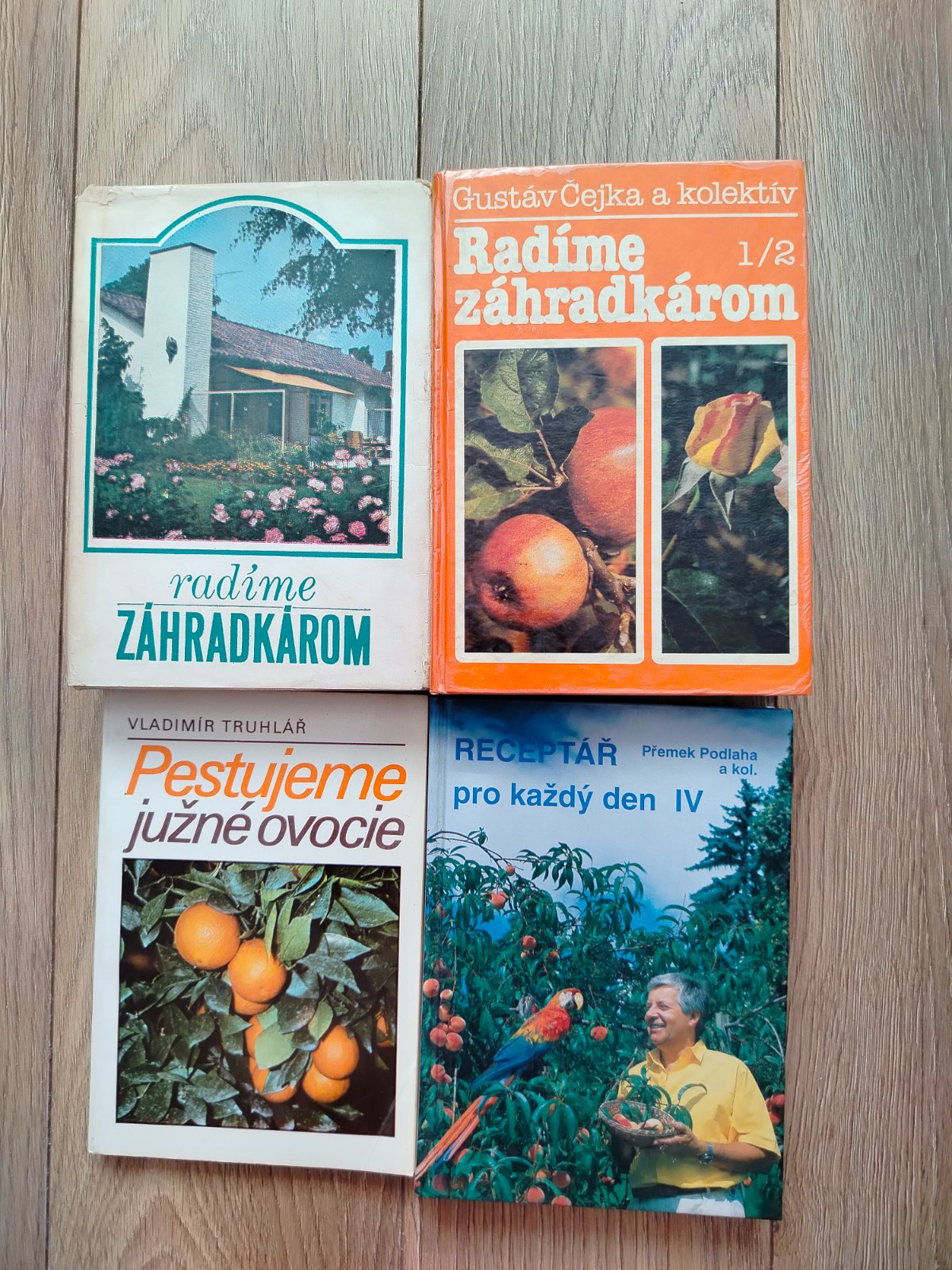1. Radíme záhradkárom (Gustáv Čejka a kolektív, vyd. Príroda, rok 1975). Toto je staršie vydanie s bielou obálkou (papierový prebal s motívom domu, záhrady a kvetov – prvá zľava na fotke).Stav:vnútro knihy čisté, bez poškodenia, bez popisovania či žltých škvŕn, stránky pekné,papierový prebal trošku ošúchaný (drobné odery, rožky, typické pre 50-ročnú knihu), ale stále celistvý a pekný. Obsah: komplexné rady pre záhradkárov – zakladanie záhrady, ovocie, zelenina, okrasné rastliny, kalendár prác, škodcovia atď. Veľmi obľúbená retro kniha, stále aktuálna pre hobby záhradkárov.Cena: 4 €