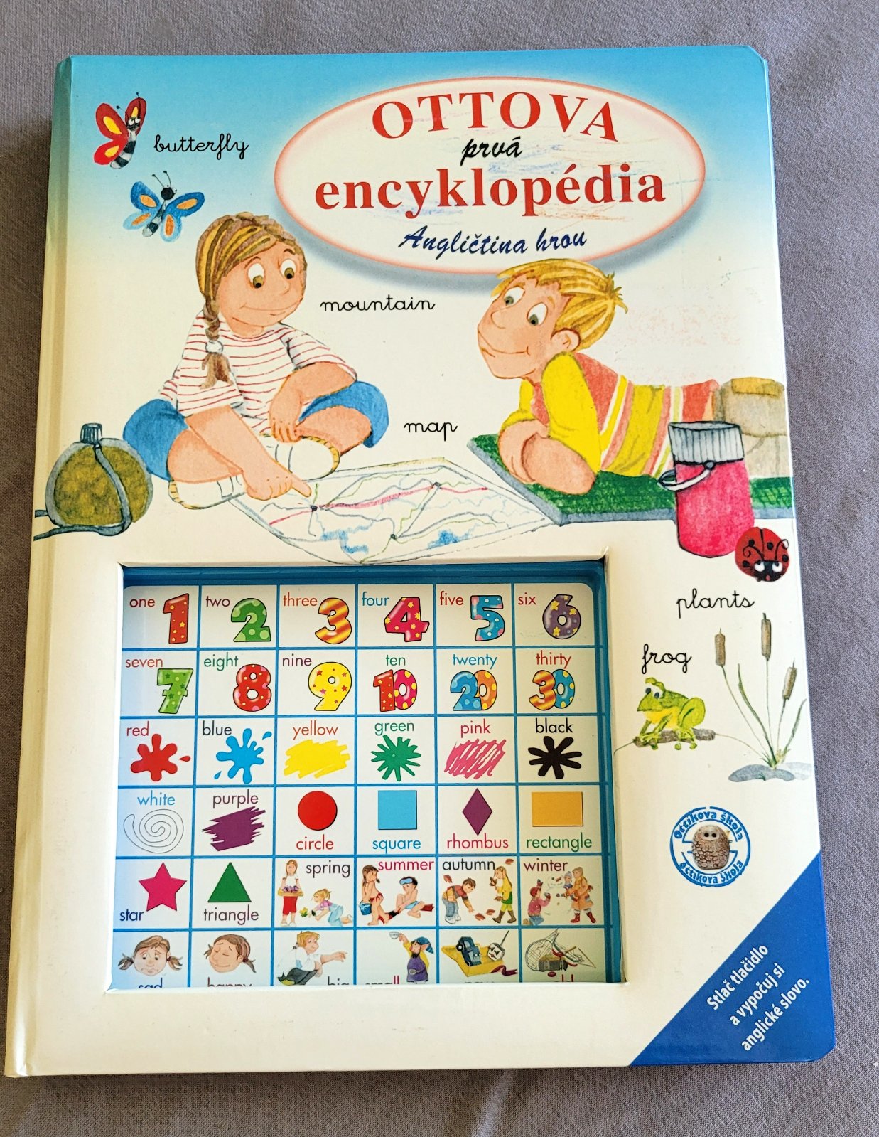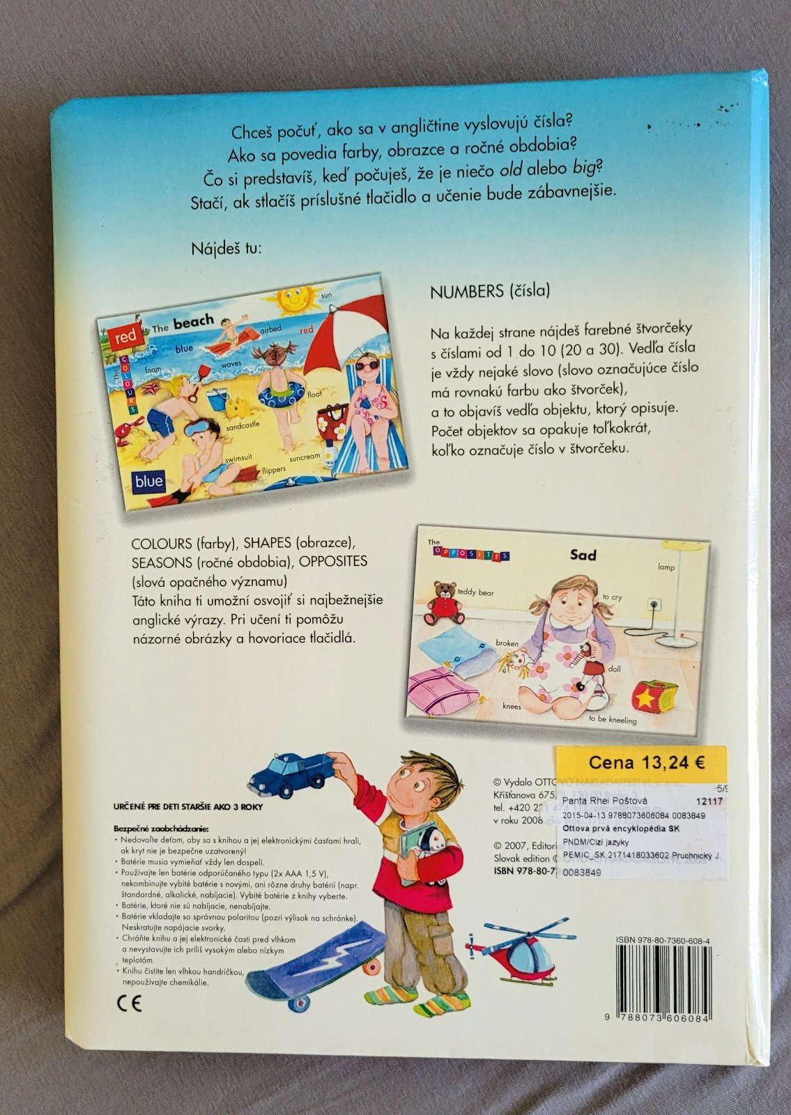 Predám detskú knihu Ottova prvá encklopédia. Má formu leporela, po stlačení tlačidiel vydáva zvuky anglických slovíčiek. Chceš počuť, ako sa v angličtine vyslovujú čísla? Ako sa povedia farby, obrazce a ročné obdobia? Čo si predstavíš, keď počuješ, že je niečo old alebo big? Stačí, ak stlačíš príslušné tlačidlo a učenie bude zábavnejšie.
