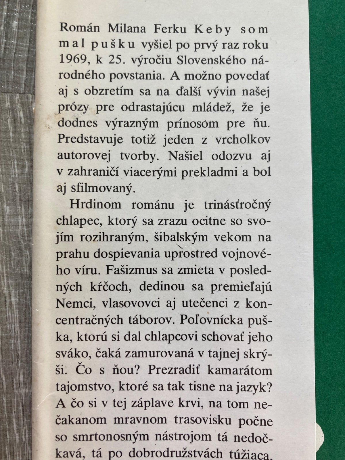 📌Hrdinom románu je 13-ročný chlapec, ktorý sa zrazu ocitne so svojím šibalským vekom na prahu dospievania uprostred vojnového víru. Dedinou sa premieľajú Nemci, vlasovovci aj utečenci z koncentračných táborov. Poľovnícka puška, ktorú si dal k chlapcovi schovať jeho sváko, čaká v tajnej skrýši. Čo s ňou? Čo si počne s týmto smrtonosným nástrojom tá nedočkavá, po dobrodružstve túžiaca detská ruka?...