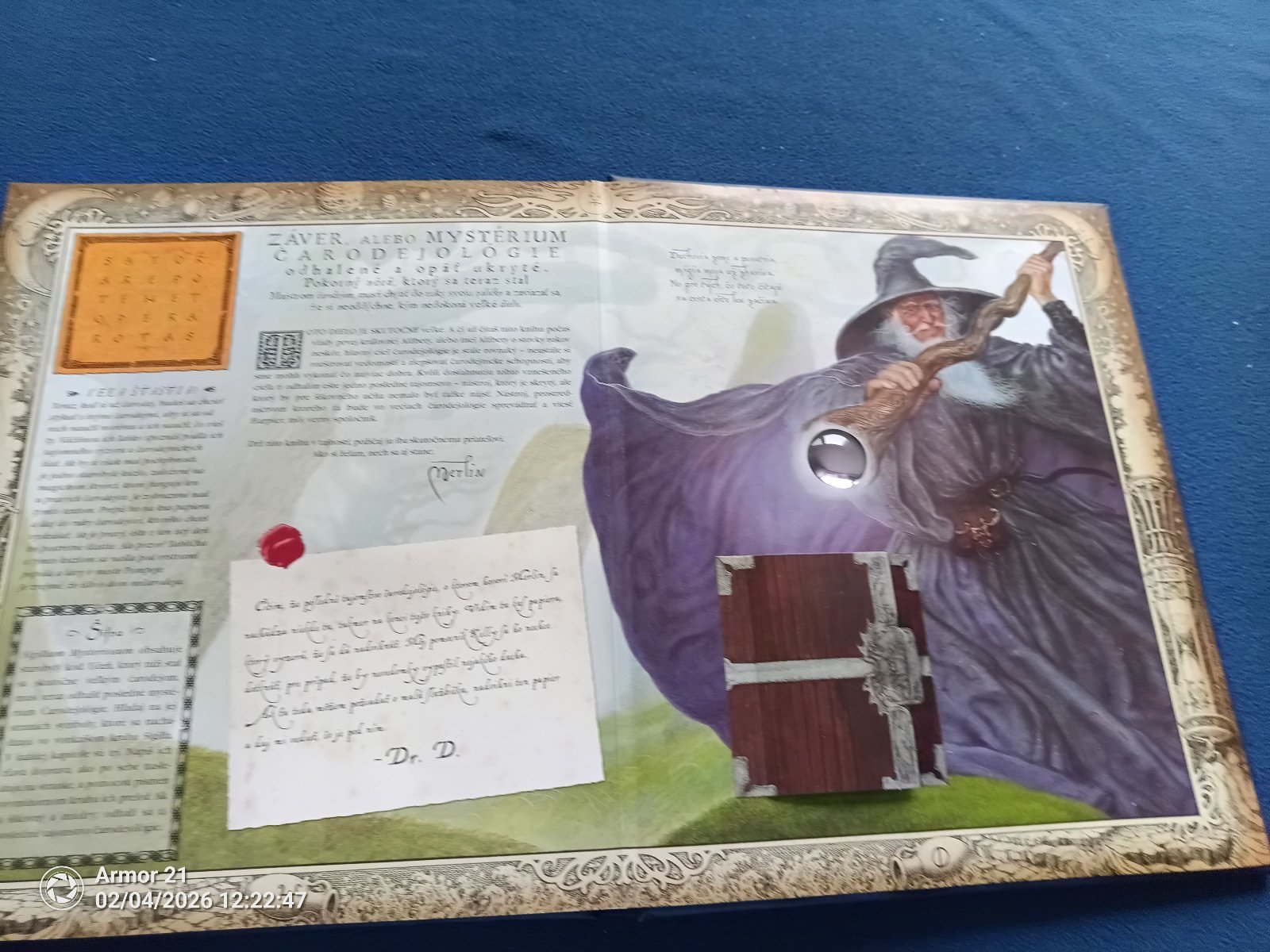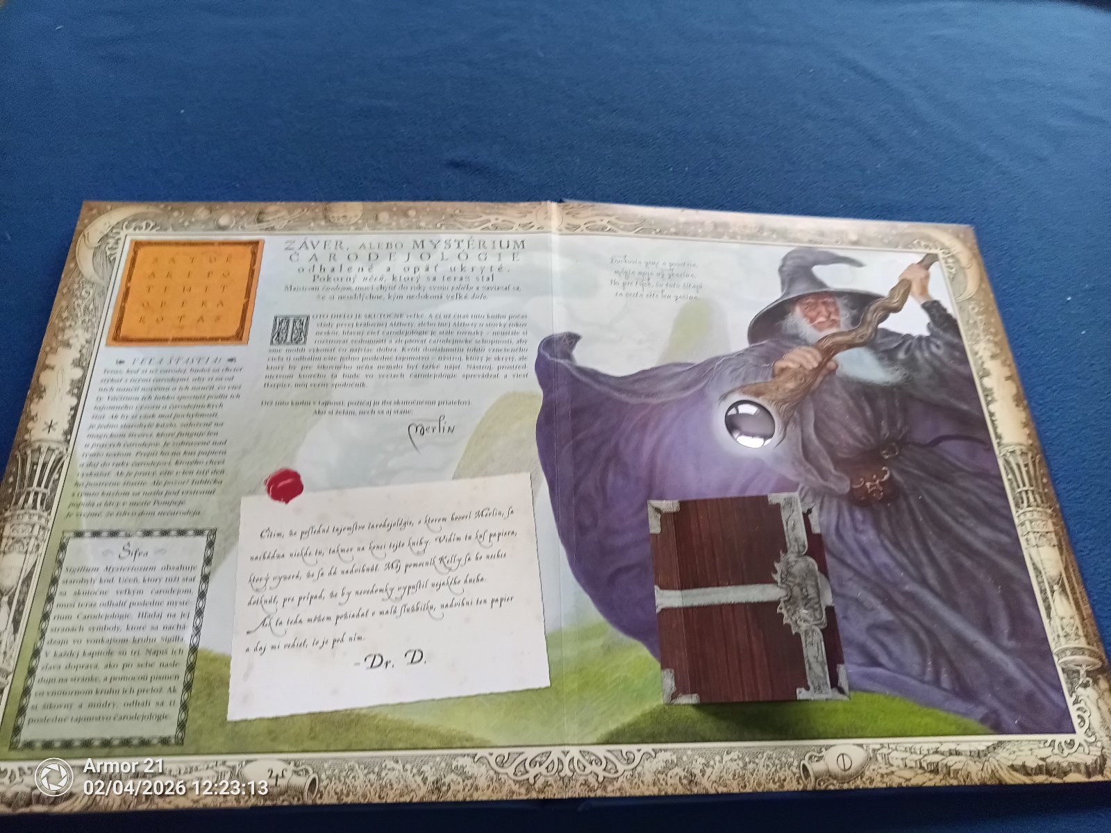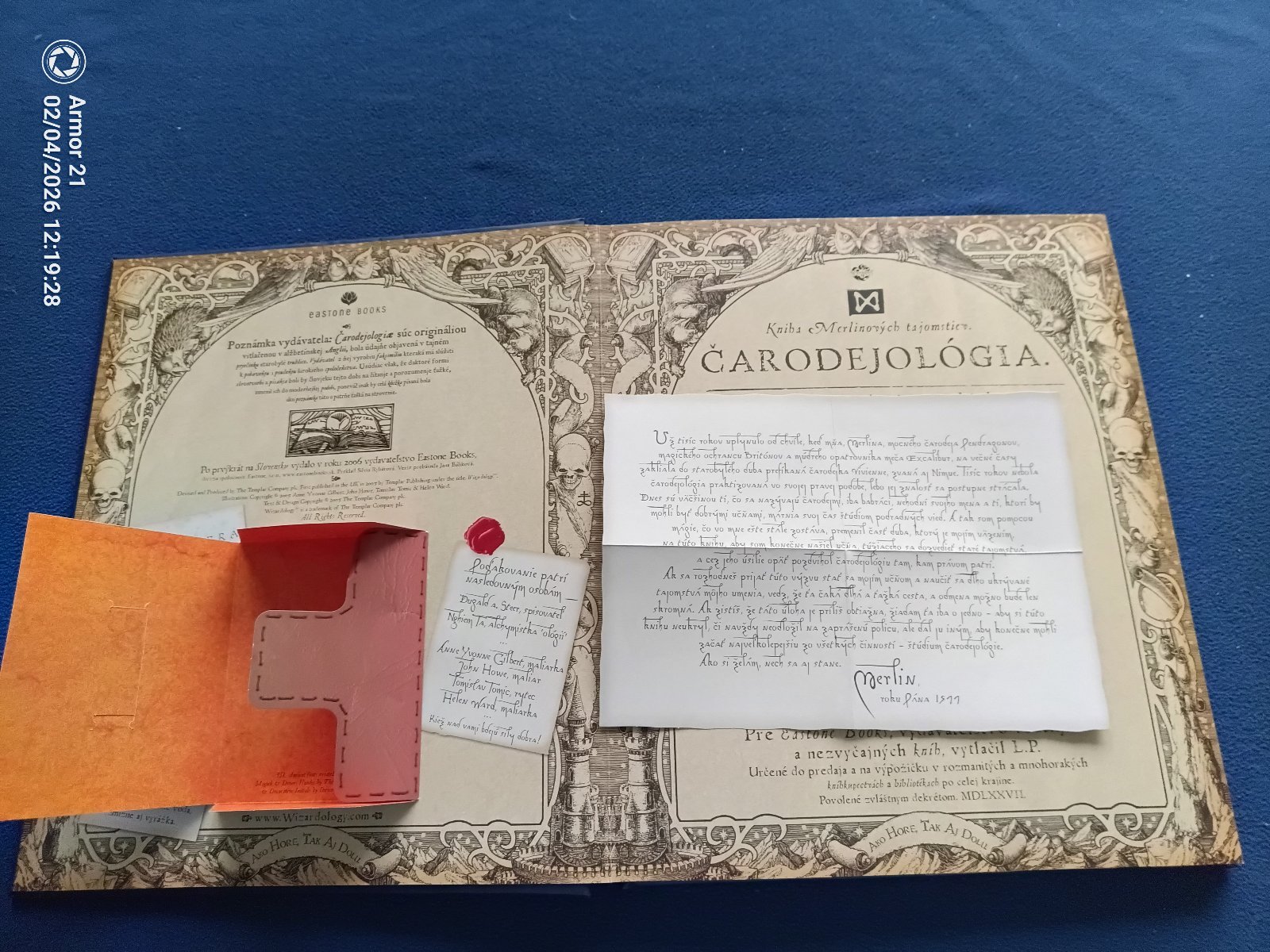 Druhá zo série výpravných publikácií vydavateľstva Eastone Books tentoraz o čarodejníckej vede. Dovoľte Merlinovi, aby vás ako svojich učňov sprevádzal po magickom svete čarodejov a starobylej vedy, ktorej štúdiom sa tak usilovne zaoberajú – čarodejológie. Kniha obsahuje množstvo ručne vlepovaných doplnkov, sadu základných veštiacich kariet a dokonca v sebe ukrýva ešte jednu miniknižôčku, ktorú musí čitateľ sám nájsť...