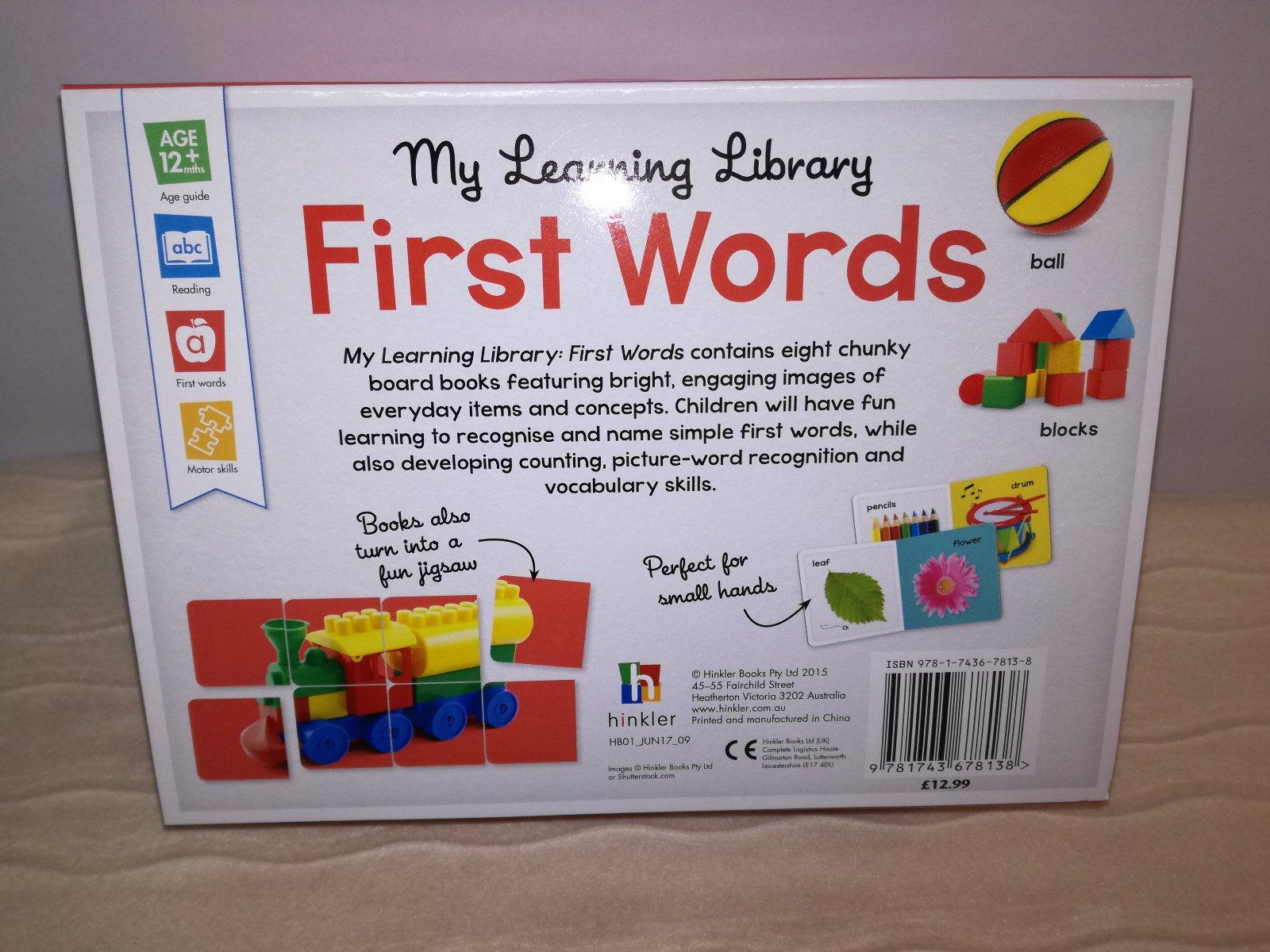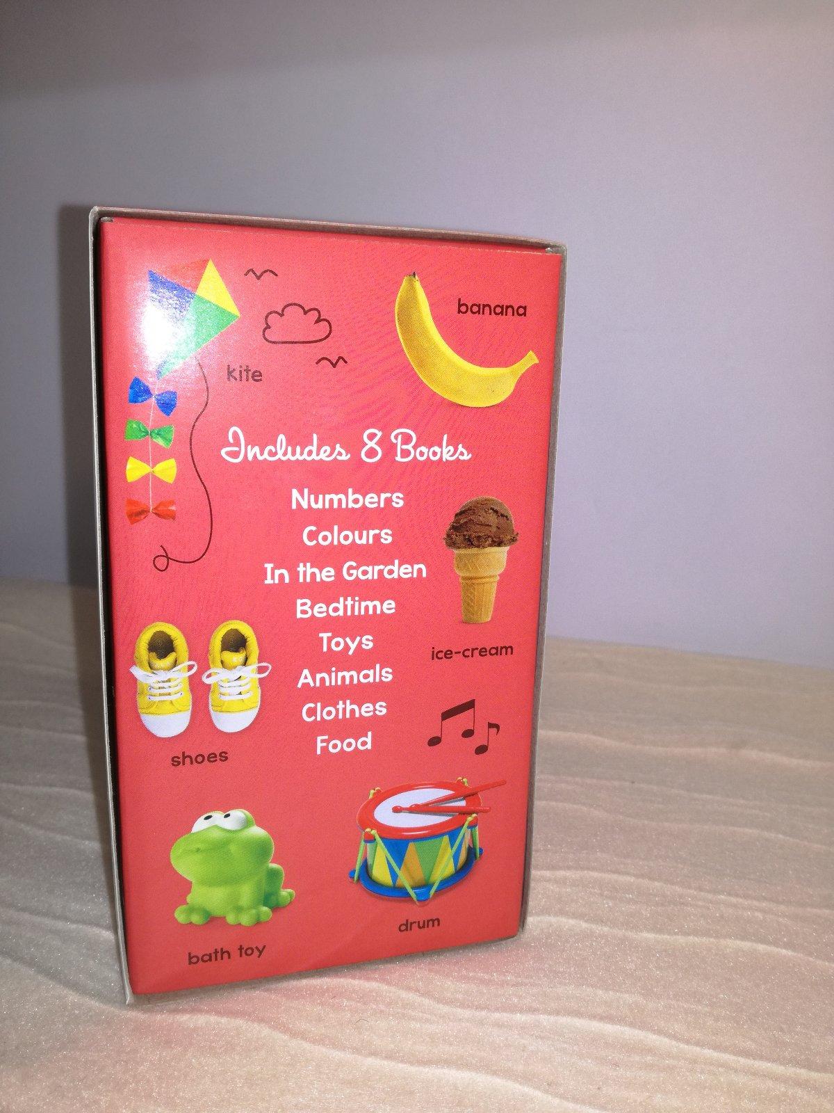 Kartonova kazeta s plastovou ruckou na prenasanie, vnutri 8 mensich tvrdych leporel.