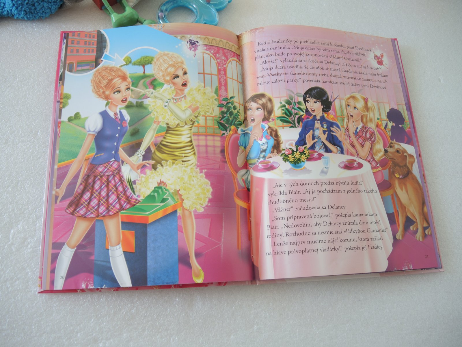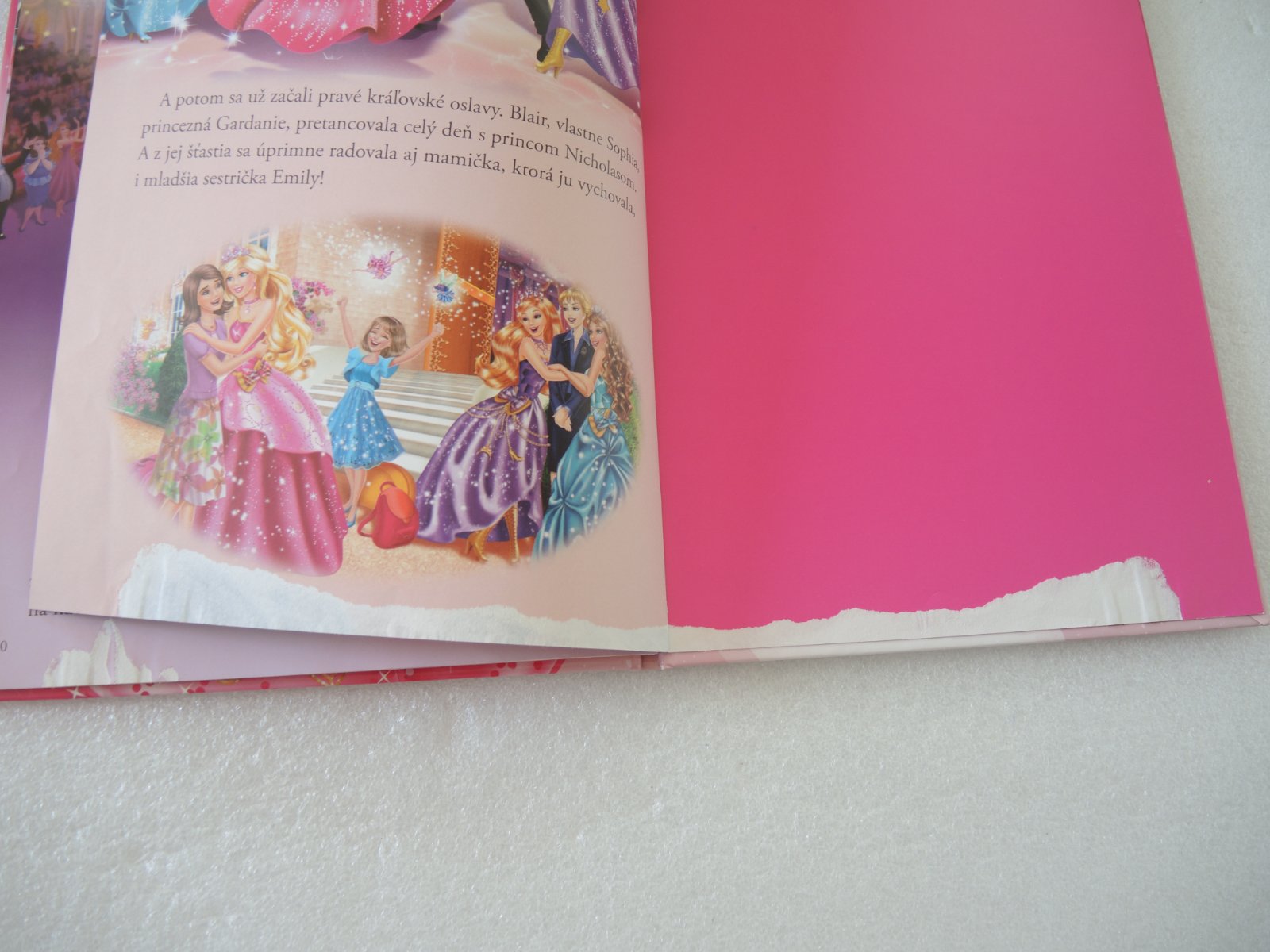 Predám krásnu knižku Barbie a škola pre princezné vydavateľstvo Egmont. Čítali sme ju len raz, kupovaná bola nová, len žiaľ mi na ňu nedopatrením malá vyliala vodu a nevšimla som si to a uschla tak a po otvorení sa žiaľ polepili všetky spodné stránky a pri otvorení sa kúsok farby pretlačilo na opačnú stranu a na každej stránke zostalo kúsok bieleho. Ak by to niekomu navadilo, je to iba na spodku knižky, vrch a text sú v poriadku, knižka je krásne ilustrovaná. Možno radosť ešte urobí. Počet strán 32. Dĺžka 29 cm a šírka 21 cm.