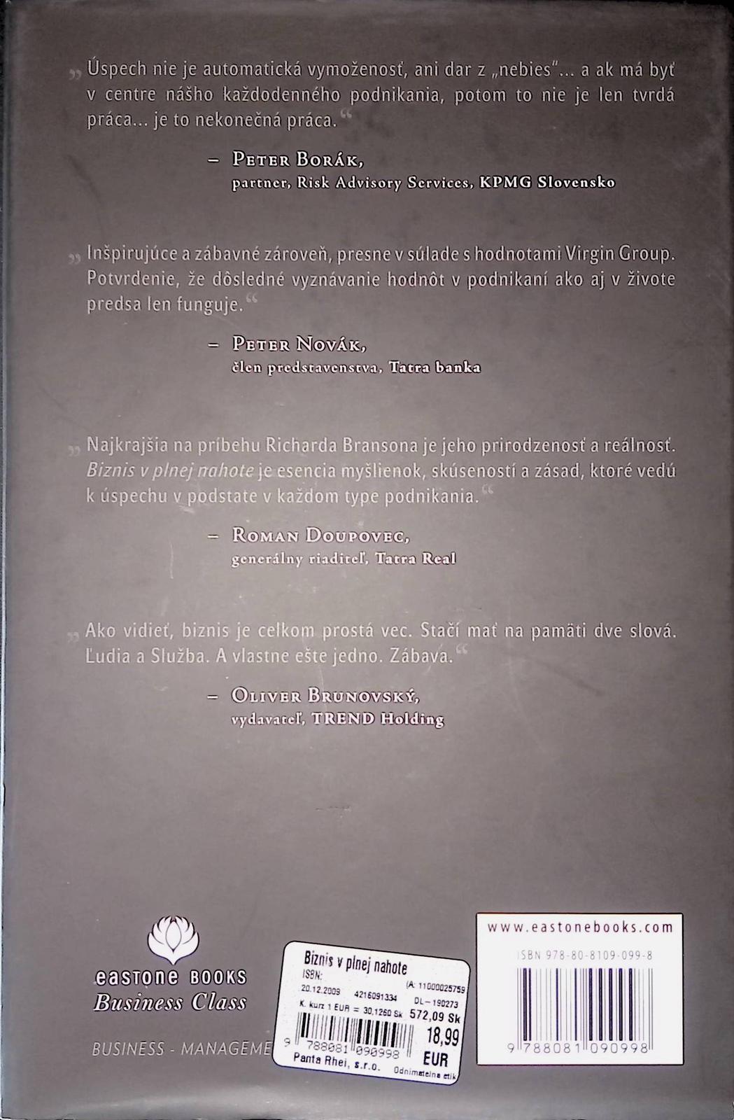 Knižka Biznis v plnej nahote je návod na to, ako prekážky v podnikaní zmeniť na výzvy, problémy na príležitosti, a tie následne na úspech. Dôkazom, že sa to skutočne dá, je úspešný britský podnikateľ a miliardár svetového mena, sir Richard Branson, ktorý v knihe ponúka vlastný pohľad na svoje dlhoročné pôsobenie v biznise a odhaľuje skutočnosti v pozadí svojich najriskantnejších, najbrilatrnejších a najtrúfalejších podnikateľských aktivít.