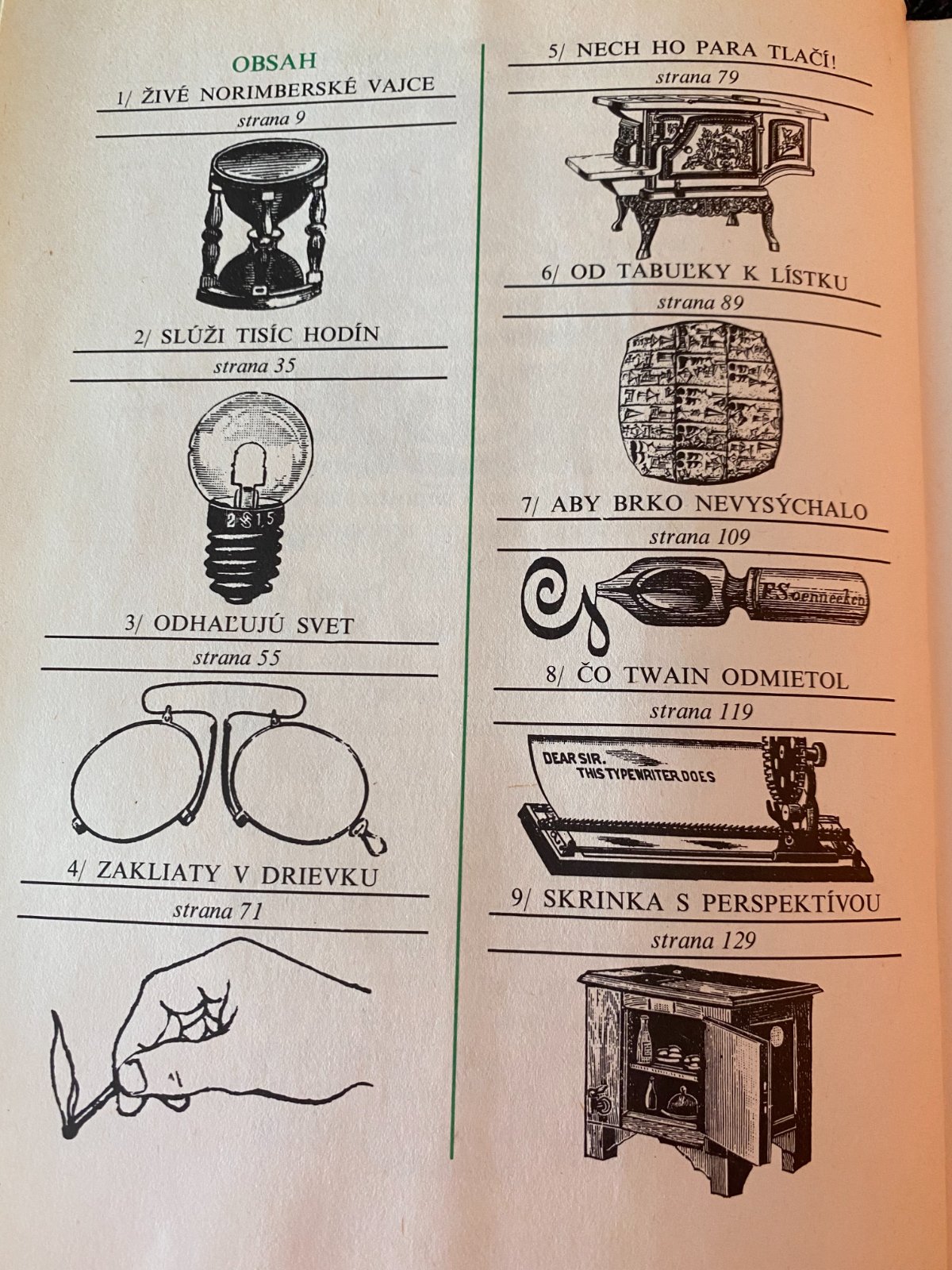 Rozprávanie o rôznych vynálezoch. Kapitoly: Merač času, Slnko v banke, Druhý pár očí, Zakliaty v drievku, Večné brko, Požierač špiny, Domáca krajčírka, Požierač fúzov, Rýchly posol, Svalosil, Pomocník krásy, Priťahovač blesku, Hltač prachu, Spútaný Prometheus, Strážca dverí, Hlinená tabuľka a mikrokniha. Poštovné podľa cenníka pošty.