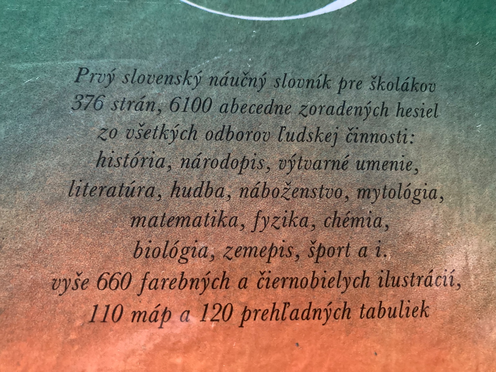 📌Prvý slovensky náučný slovník pre školákov 376 strán, 6100 abecedne zoradených hesiel zo všetkých odborov ľudskej činnosti: história, národopis, výtvarné umenie, literatúra, hudba, náboženstvo, mytológia, matematika, fyzika, chémia, biológia, zemepis, šport a i.