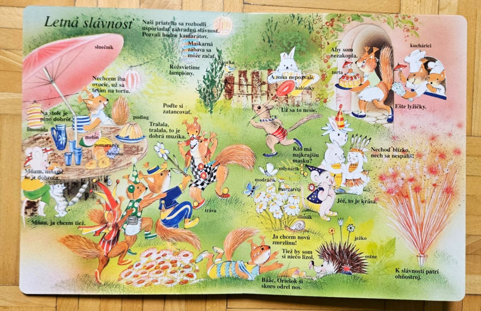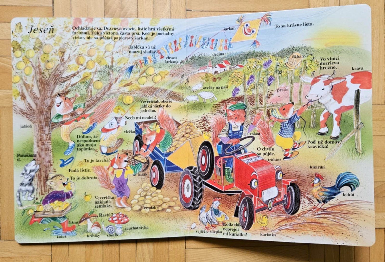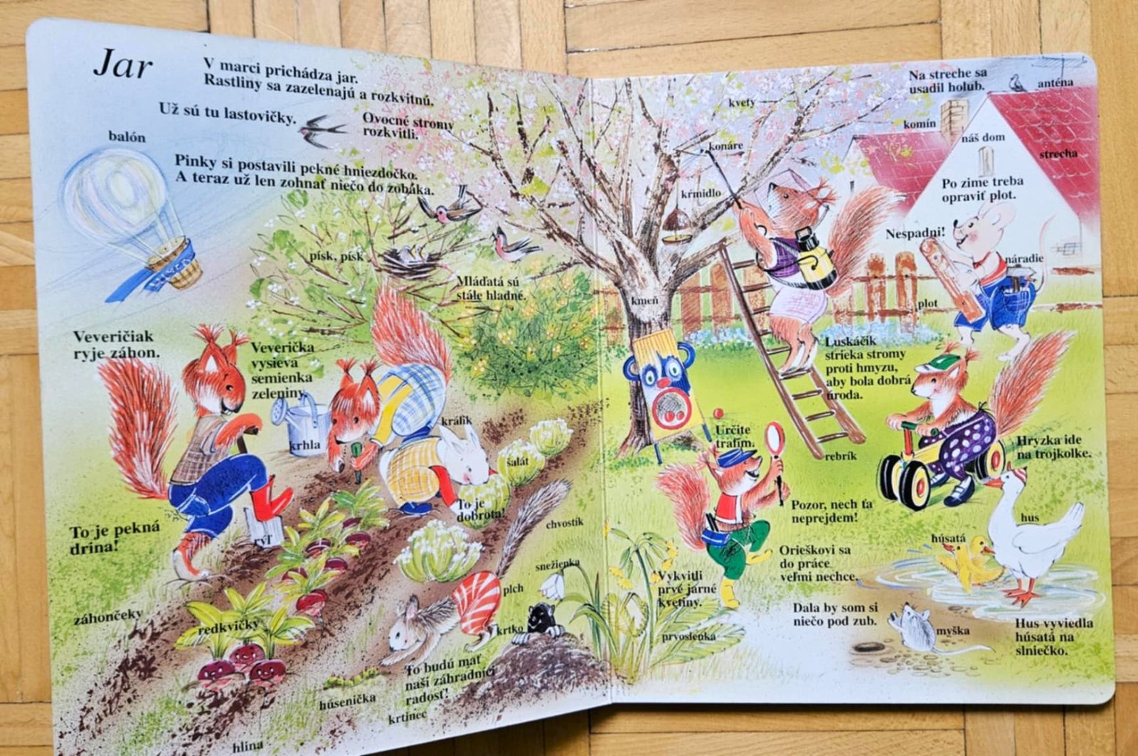 Na jar deti veverička povodí po záhrade, v lete sa pôjdu okúpať na jazero a zabavia sa na letnej slávnosti, na jeseň si budú púšťať šarkana a v zime si užijú sánkovačku a postavia si snehuliaka.