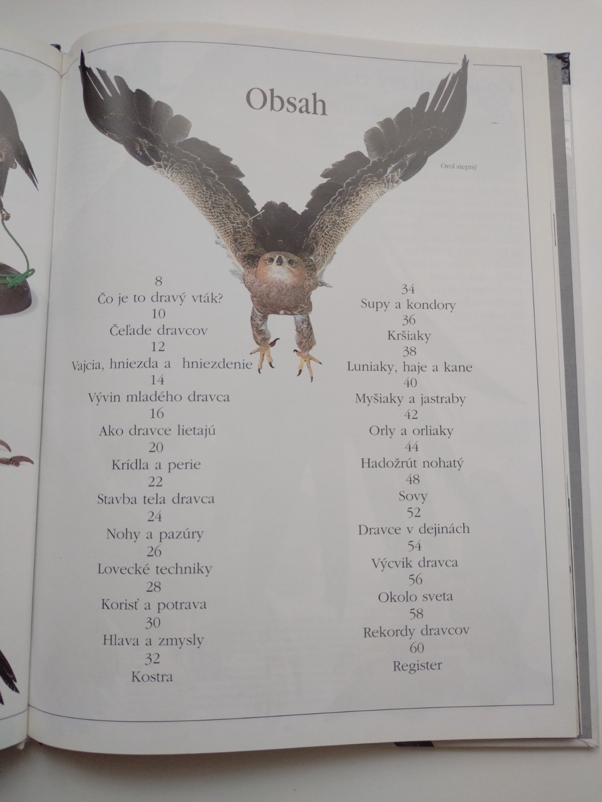 Kniha sa venuje biológii a spôsobu života dravcov. Obsahuje unikátne fotografie orlov, jastrabov, sokolov a sov, pričom detailne rozoberá ich anatómiu, zrak, hniezdenie a techniky lovu.
