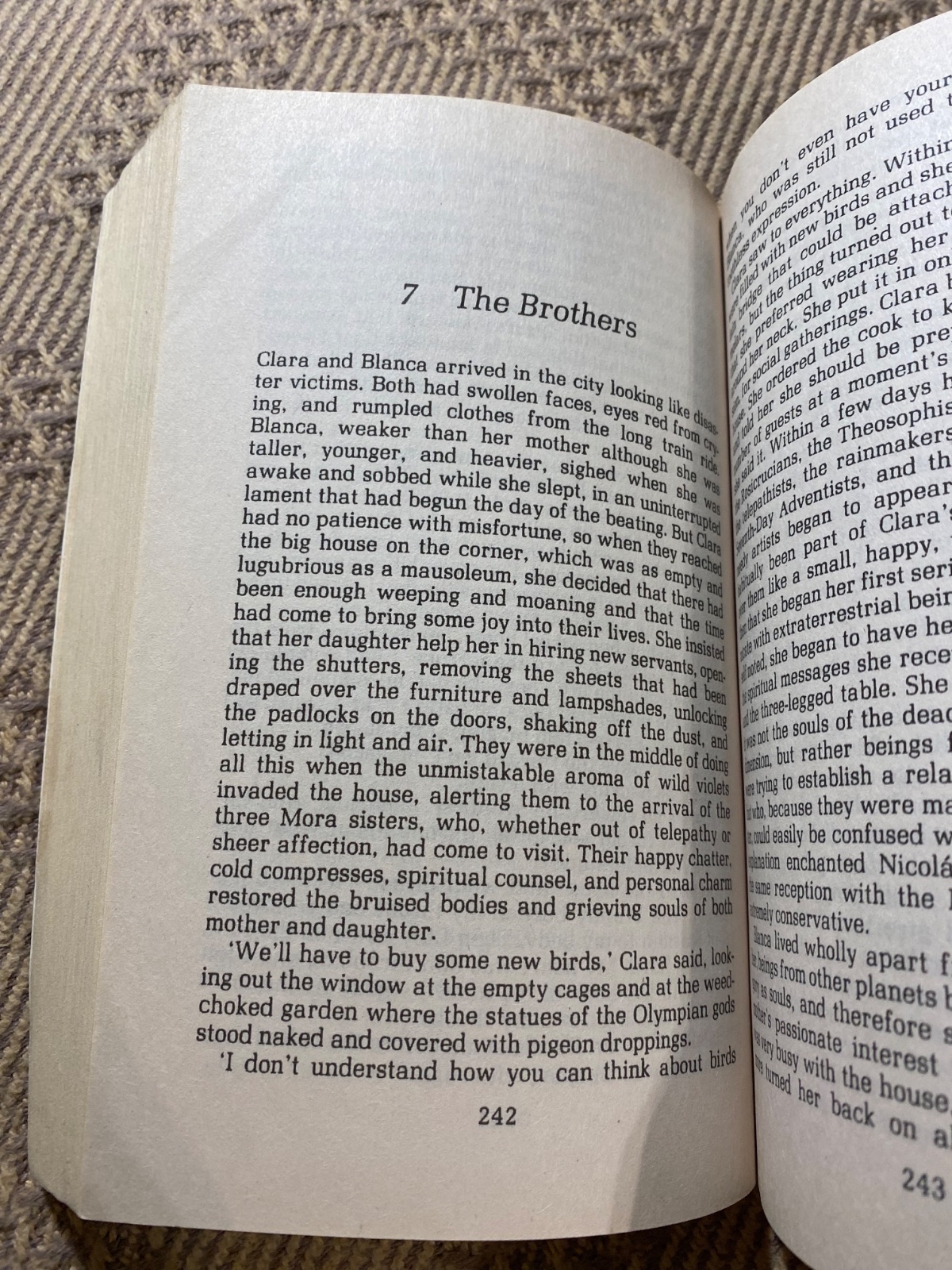 As a girl, Clara del Valle can read fortunes, make objects move as if they had lives of their own, and predict the future. Following the mysterious death of her sister, Rosa the Beautiful, Clara is mute for nine years. When she breaks her silence, it is to announce that she will be married soon to the stern and volatile landowner Esteban Trueba.