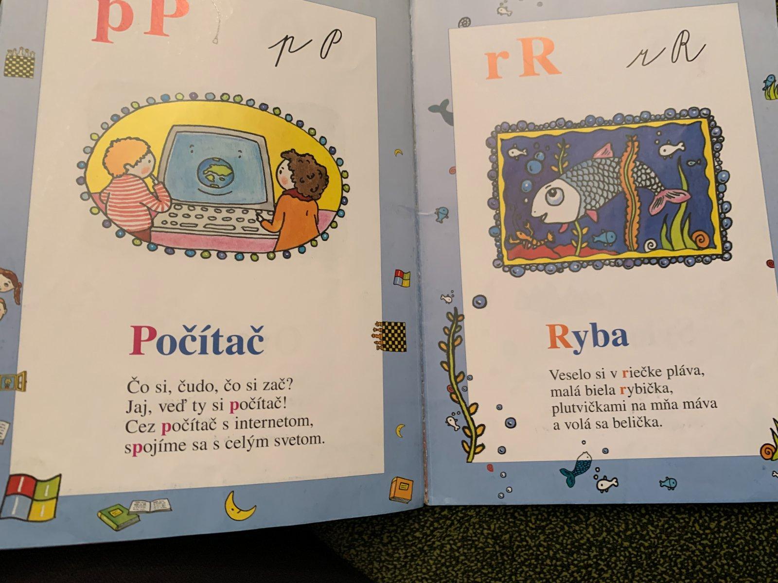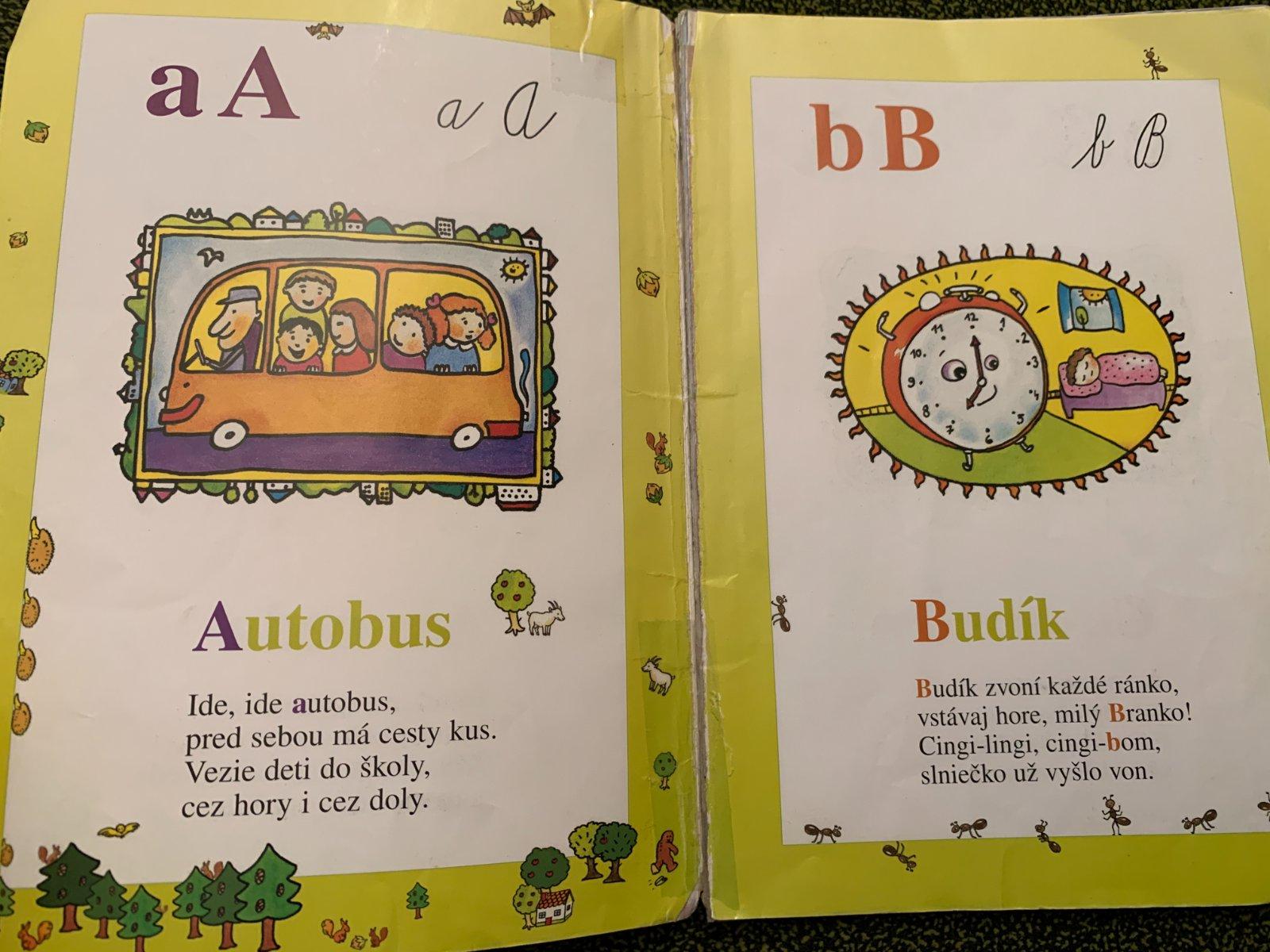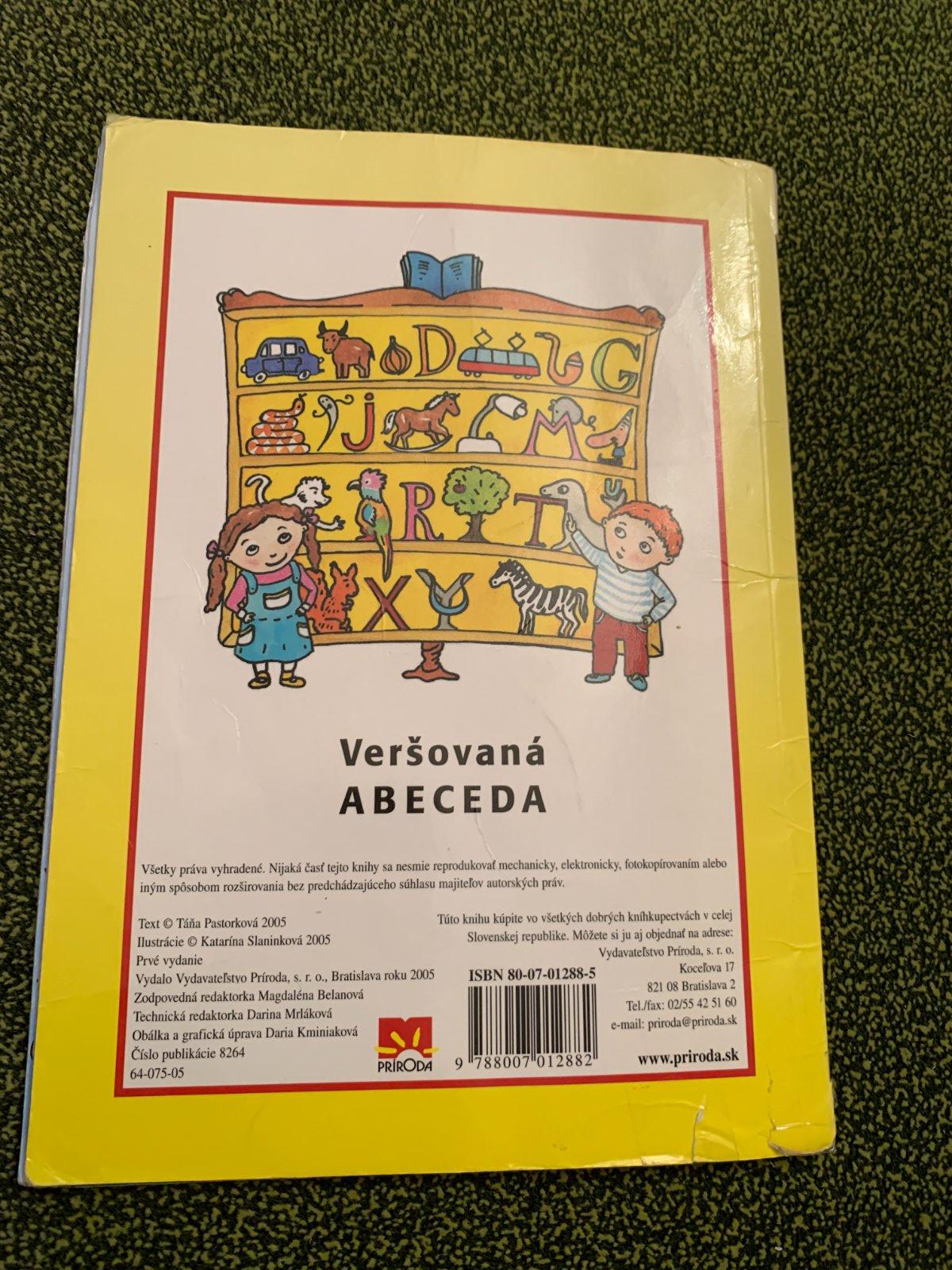 Básničky spojené s písmenami abecedy a farebné ilustrácie. Písmená sú uvedené v tlačenej aj písanej forme. Stav viď. foto.