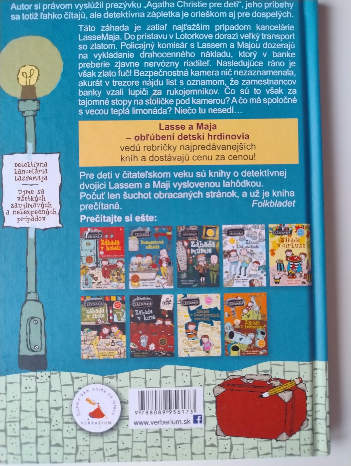 Táto záhada je zatiaľ najťažším prípadom kancelárie LasseMaja. Do prístavu v Lotorkove dorazí veľký transport so zlatom. Policajný komisár s Lassem a Majou dozerajú na vykladanie drahocenného nákladu, ktorý v banke preberie zjavne nervózny riaditeľ. Nasledujúce ráno je však zlato fuč! Bezpečnostná kamera nič nezaznamenala, akurát v trezore nájdu list s oznamom, že zamestnancov banky vzali lupiči za rukojemníkov. Čo sú to však za tajomné stopy na stoličke pod kamerou? A čo má spoločné s vecou teplá limonáda? Niečo tu nesedí…