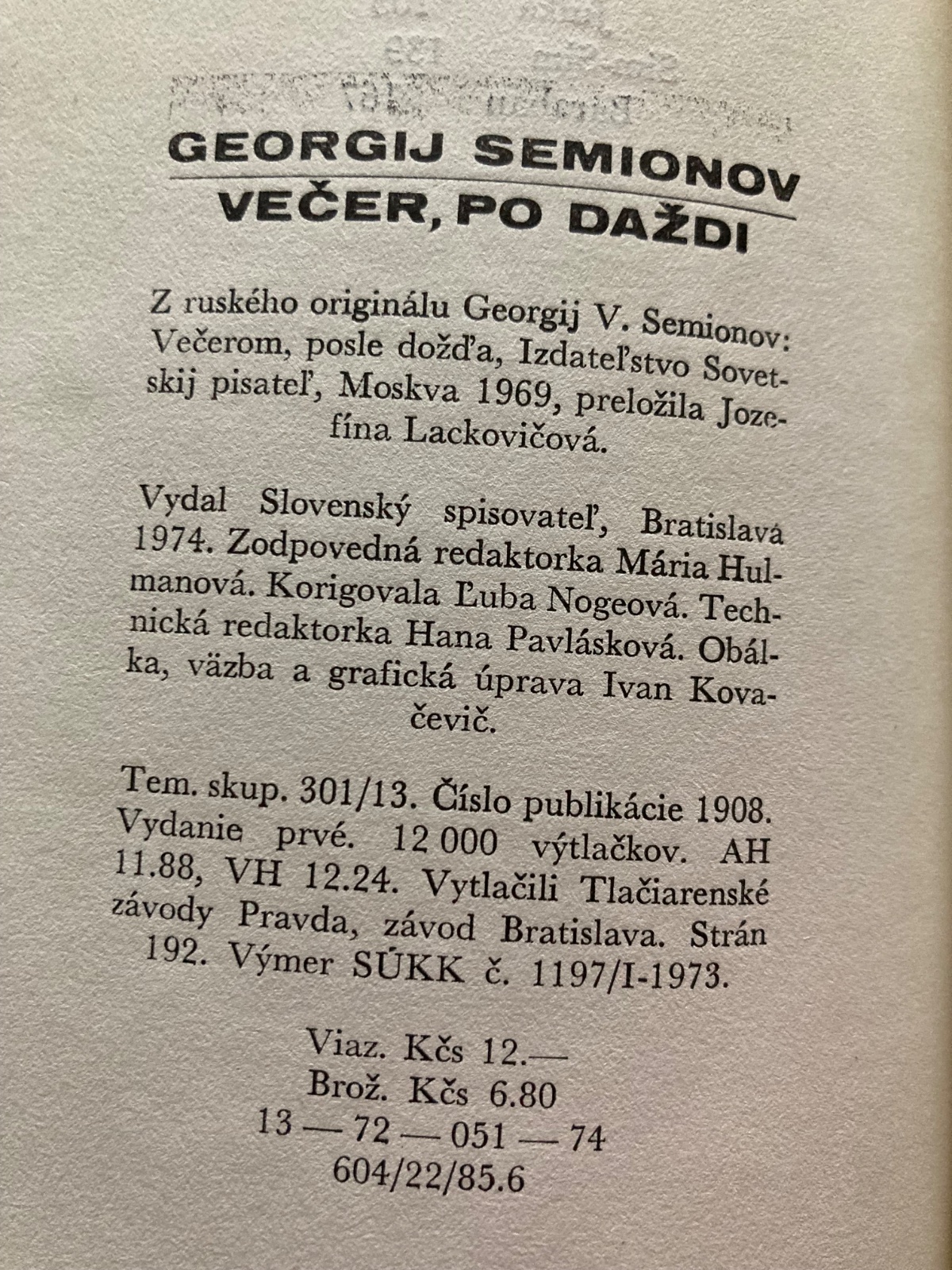 🔹Večer, po daždi je zbierka poviedok od ruského spisovateľa Georgija Semionova, ktorá vyšla v slovenskom preklade v roku 1974 vo vydavateľstve Slovenský spisovateľ.