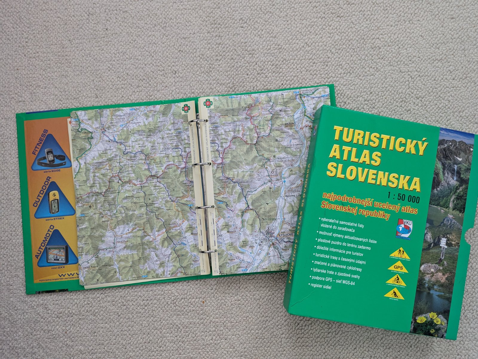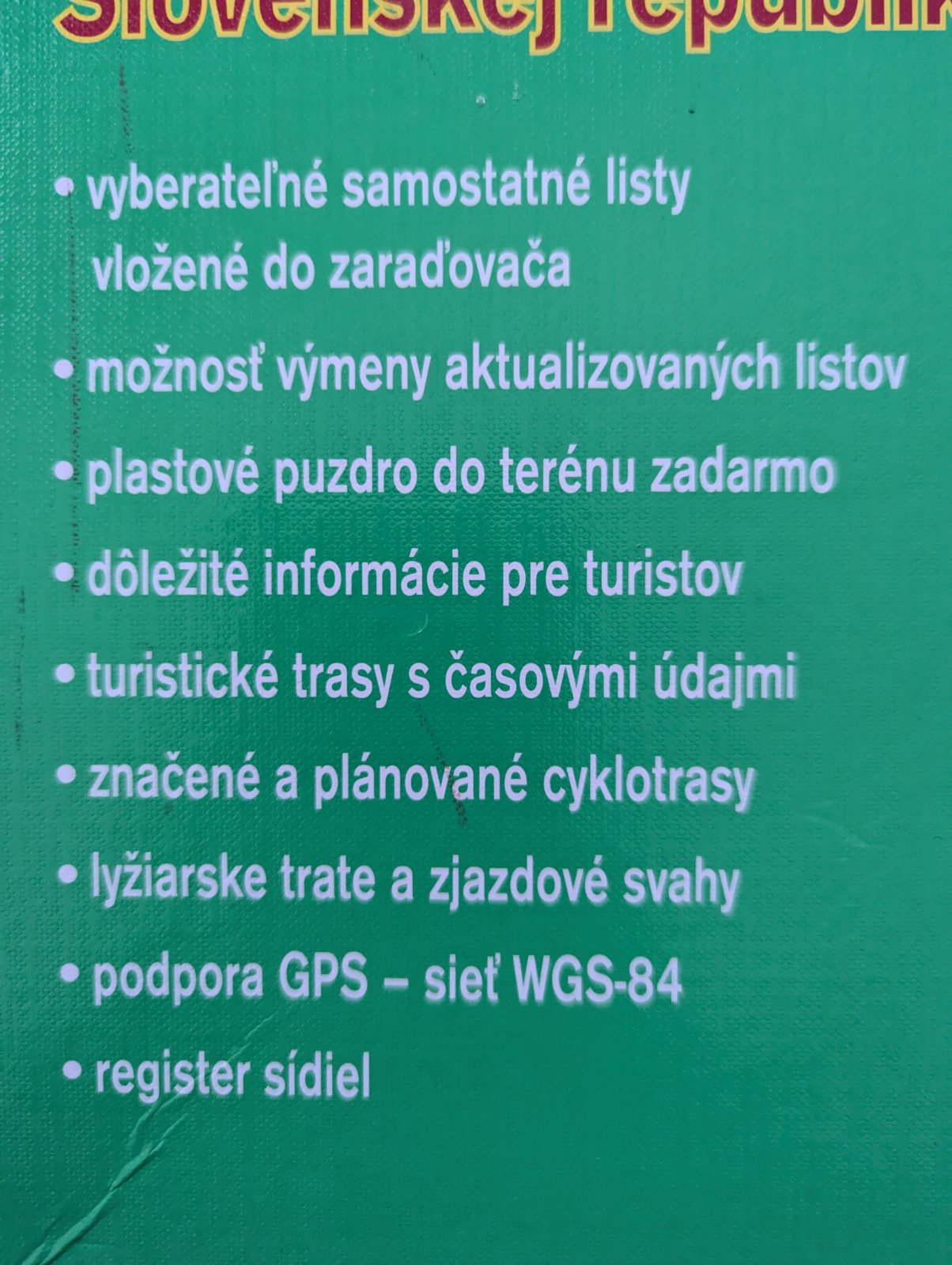 Najpôsobivejší ucelený atlas Slovenskej republiky. Obľúbený turistický atlas Slovenska v mierke 1:50 000 je aktualizovaný. V atlase sa nachádza kompletný súbor turistických máp z celého územia Slovenska. Je na nich kompletné zobrazenie cykloturistických trás, súradnicový systém WGS-84, podpora prístrojov GPS. V atlase sú informácie o turistike a cykloturistike a zimné športy na Slovensku. Pri turistických trasách značené časové údaje. V atlase nájdete samostatné vyberateľné listy. Má 372 strán, ktoré sú A4 formátu. Je nepoužívaný, v pevnom kartónovom obale. Akurát nerozumiem, chýbajú 3 listy, od 155 do 160.