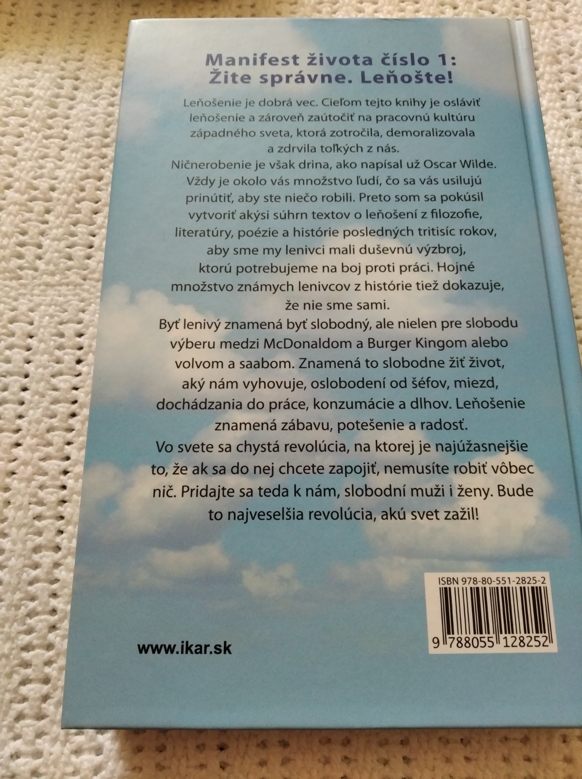 Manifest života číslo 1: Žite správne. Leňošte! Leňošenie je dobrá vec. Cieľom tejto knihy je osláviť leňošenie a zároveň zaútočiť na pracovnú kultúru západného sveta, ktorá zotročila, demoralizovala a zdrvila toľkých z nás. Ničnerobenie je však drina, ako napísal už Oscar Wilde. Vždy je okolo vás množstvo ľudí, čo sa vás usilujú prinútiť, aby ste niečo robili. Preto som sa pokúsil vytvoriť akýsi súhrn textov o leňošení z filozofie, literatúry, poézie a histórie posledných tritisíc rokov, aby sme my lenivci mali duševnú výzbroj, ktorú potrebujeme na boj proti práci. Hojné množstvo známych lenivcov z histórie tiež dokazuje, že nie sme sami. Byť lenivý znamená byť slobodný, ale nielen pre slobodu výberu medzi McDonaldom a Burger Kingom alebo Volvom a Saabom. Znamená to slobodne žiť život, aký nám vyhovuje, oslobodení od šéfov, miezd, dochádzania do práce, konzumácie a dlhov. Leňošenie znamená zábavu, potešenie a radosť. Vo svete sa chystá revolúcia, na ktorej je najúžasnejšie to, že ak sa do nej chcete zapojiť, nemusíte robiť vôbec nič. Pridajte sa teda k nám, slobodní muži i ženy. Bude to najveselšia revolúcia, akú svet zažil!