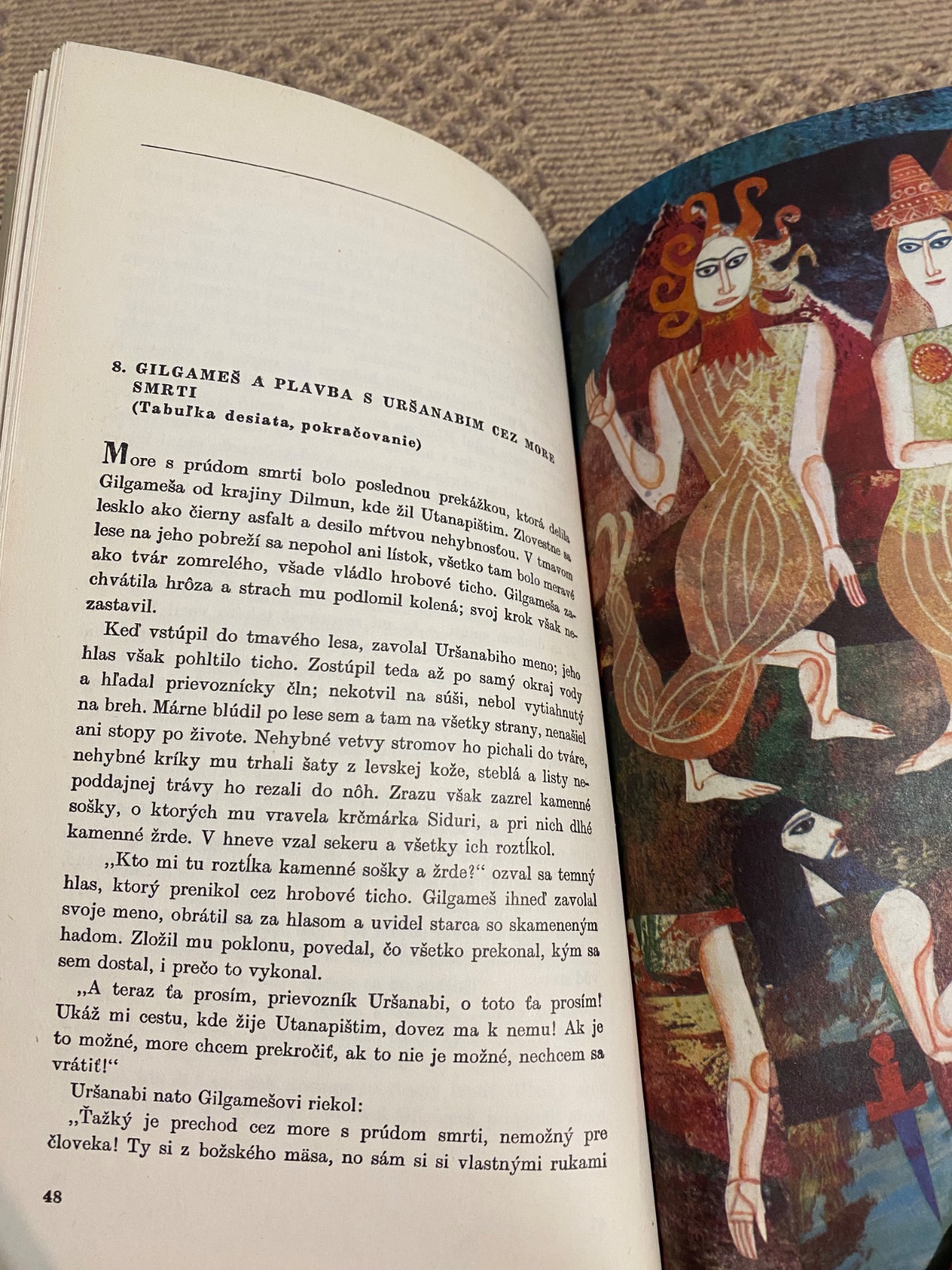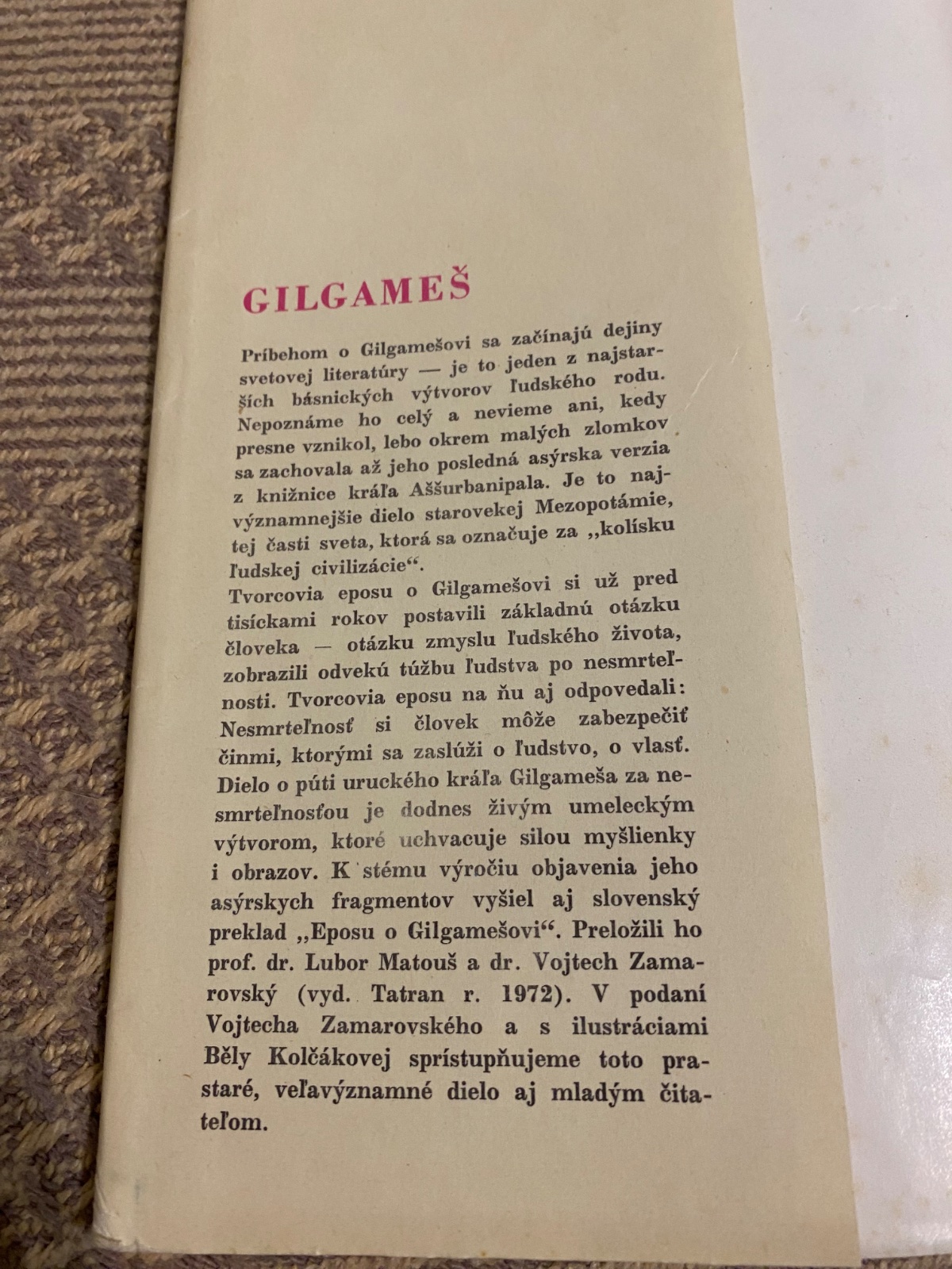 Tvorcovia eposu o Gilgamešovi si už pred tisíckami rokov postavili základnú otázku človeka otázku zmyslu ľudského života, zobrazili odvekú túžbu ľudstva po nesmrteľnosti. Tvorcovia eposu na ňu aj odpovedali: Nesmrteľnosť si človek môže zabezpečiť činmi, ktorými sa zaslúži o ľudstvo, o vlasť. Dielo o púti uruckého kráľa Gilgameša za nesmrteľnosťou je dodnes živým umeleckým výtvorom, ktoré uchvacuje silou myšlienky i obrazov. K stému výročiu objavenia jeho asýrskych fragmentov vyšiel aj slovenský preklad,, Eposu o Gilgamešovi". Preložili ho prof. dr. Lubor Matouš a dr. Vojtech Zama- rovský (vyd. Tatran r. 1972). V podaní Vojtecha Zamarovského a s ilustráciami Běly Kolčákovej sprístupňujeme toto prastaré, veľavýznamné dielo aj mladým čitateľom.