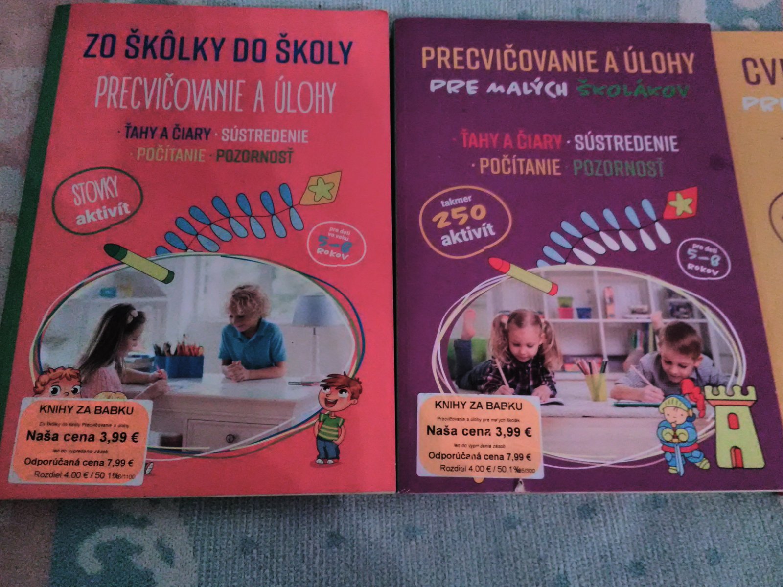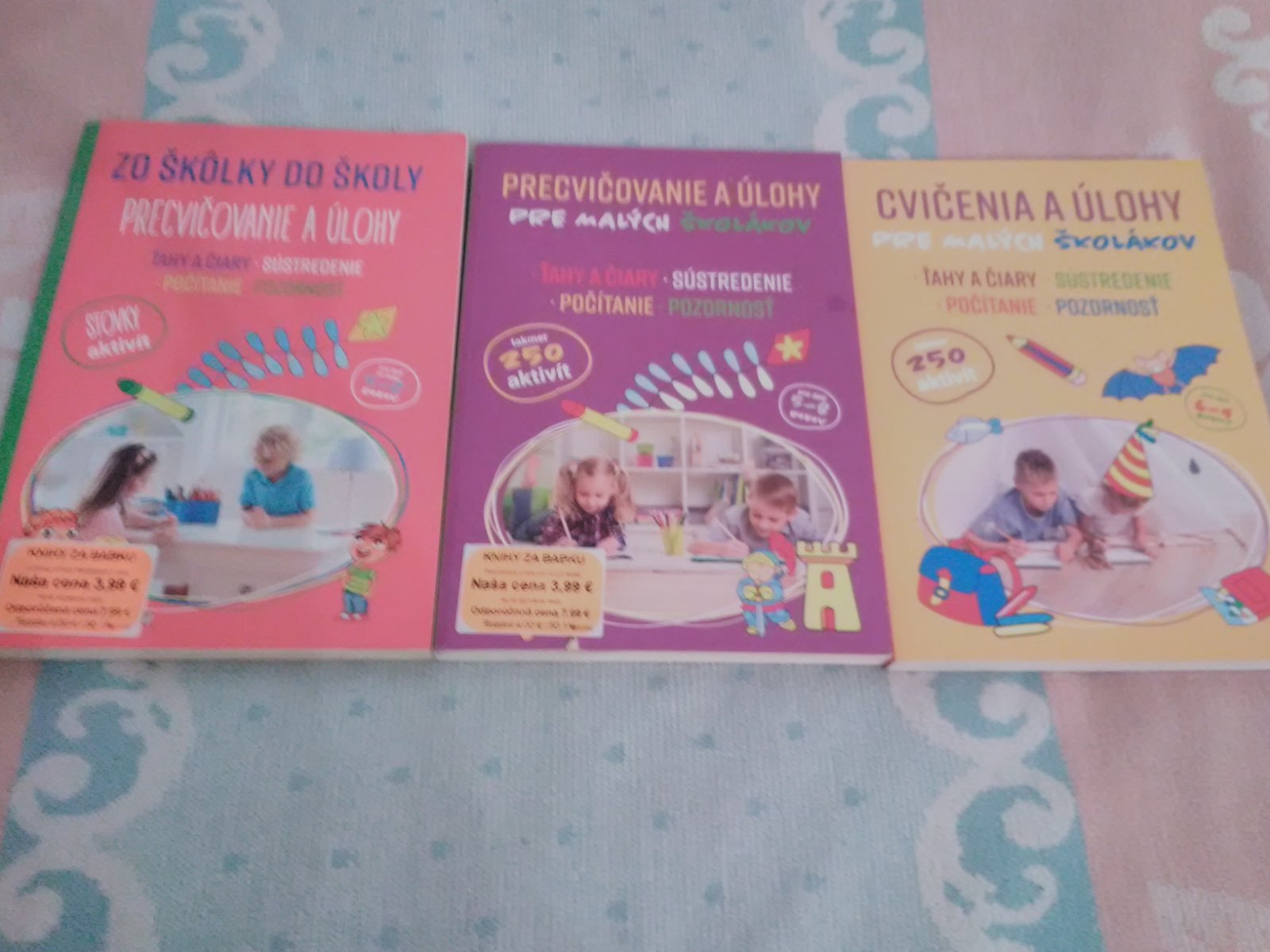 Predávam žltú knihu cvičenia a úlohy pre malých školákov ktora je nepoužíta a k tomu zadarmo dve knihy pre škôlkarov a prípravkov ktoré boli čiastočne použité ale len zopár strán a väčšinou len ceruzkou urobené takže sa dajú vygumovat.