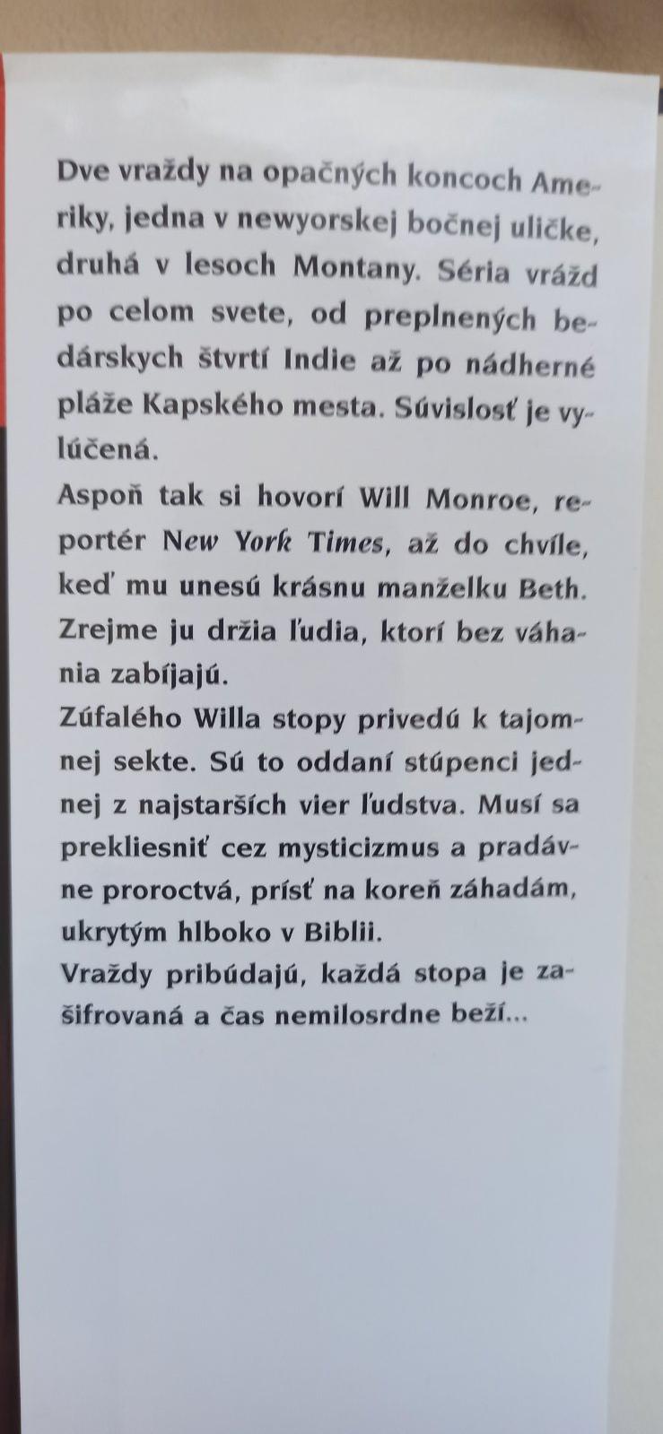 Séria vrážd po celom svete, od preplnených bedárskych štvrtí Indie až po nádherné pláže Kapského mesta. Súvislosť je vylúčená. Aspoň tak si hovorí Will Monroe, mladý Angličan, reportér New York Times až do chvíle, keď mu unesú krásnu manželku Beth. Zrejme ju držia ľudia, ktorí bez váhania zabíjajú. Zúfalého Willa stopy privedú k tajomnej sekte....