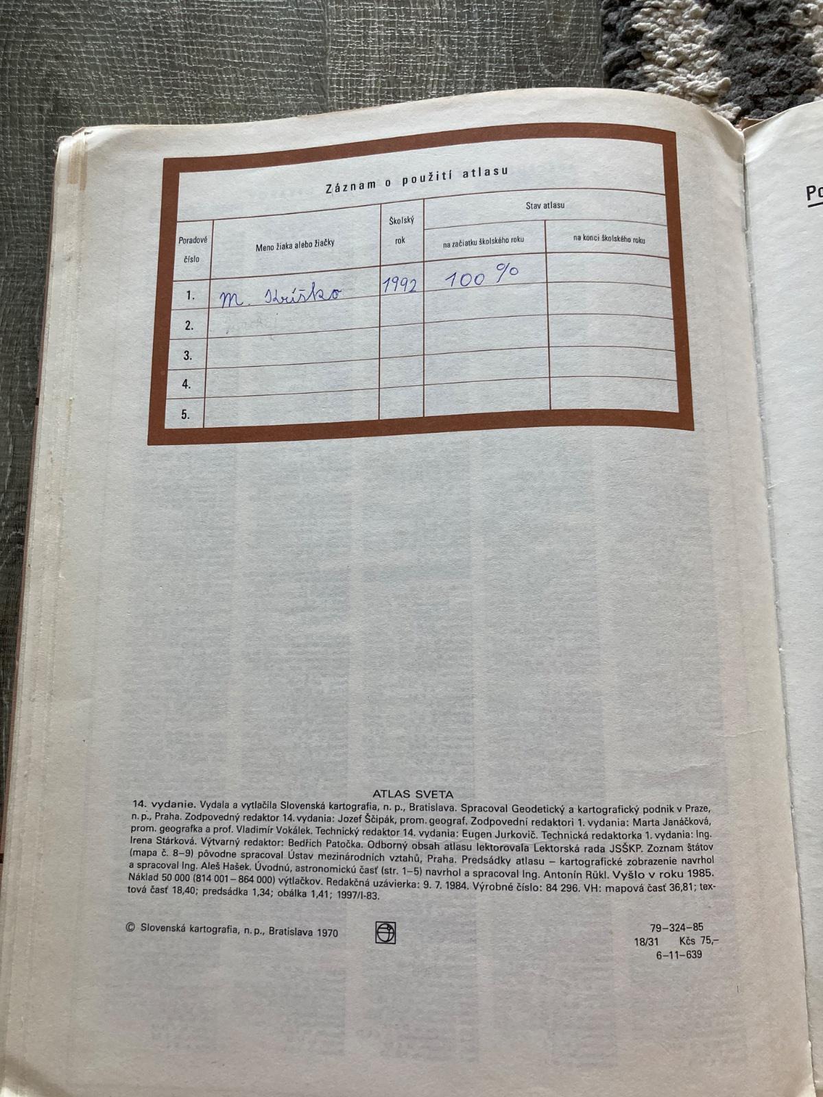 pekný stav, krásny atlas, zachovalý, pekné strany, prebal mierne opotrebovaný, na chrbáte prelepený páskou, obsahuje pečiatky, vzadu podpísaný, inak bez dalších vpisov