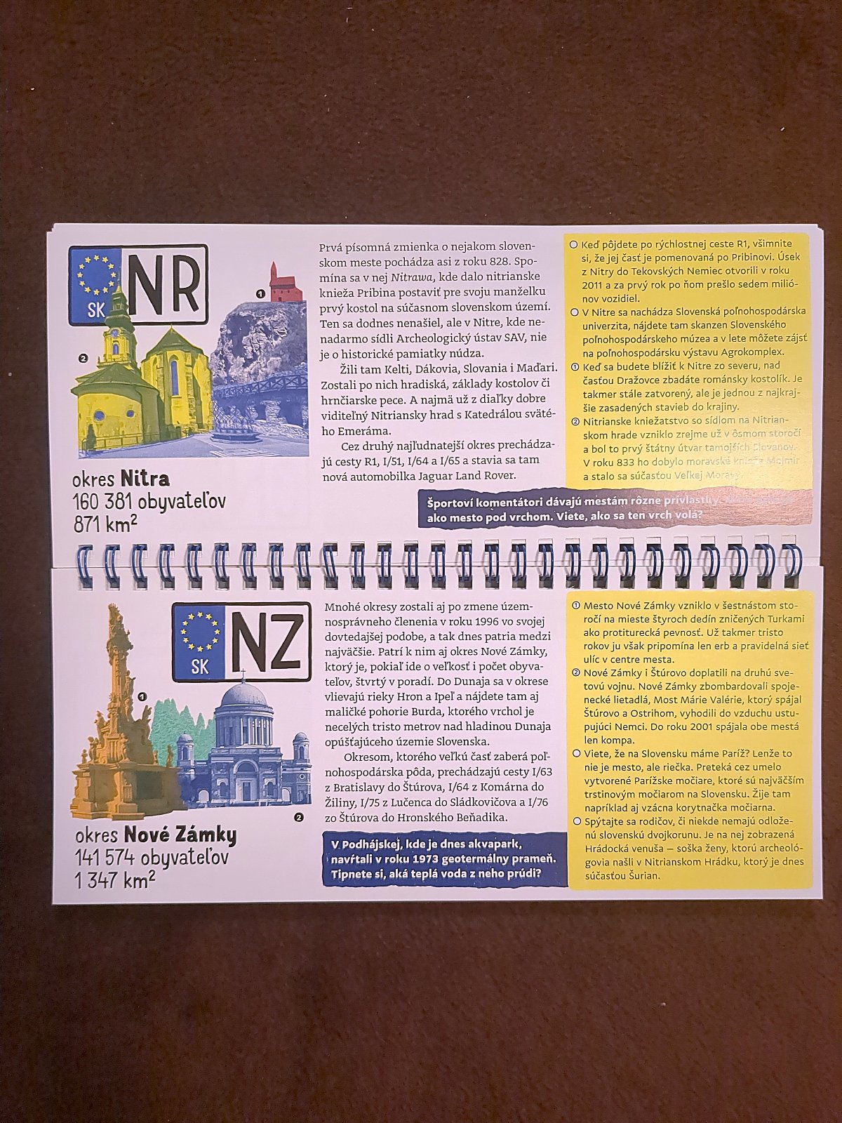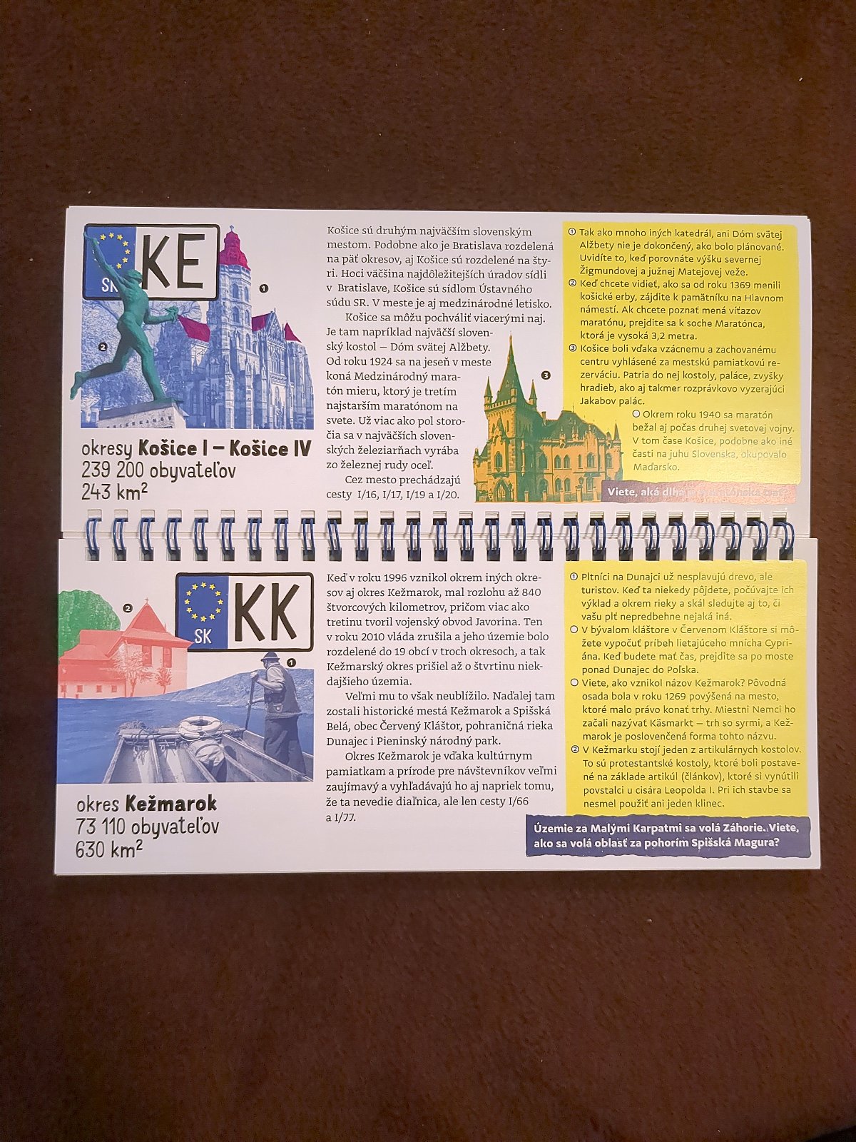 Brožovaná knižočka na cesty, naučí malých aj veľkých, ktoré okresy sa skrývajú pod jednotlivými značkami – skratkami na okoloidúcich autách. Upozorní, čo sa tam oplatí vidieť, aké prírodné zaujímavosti či umelecké pamiatky sa v nich nachádzajú alebo ktoré historické udalosti sa k nim viažu. Krátke texty dopĺňajú fotografie a kvíz. 88 strán, rozmer 11 x 24 cm. Ako nová, bez poškodení.