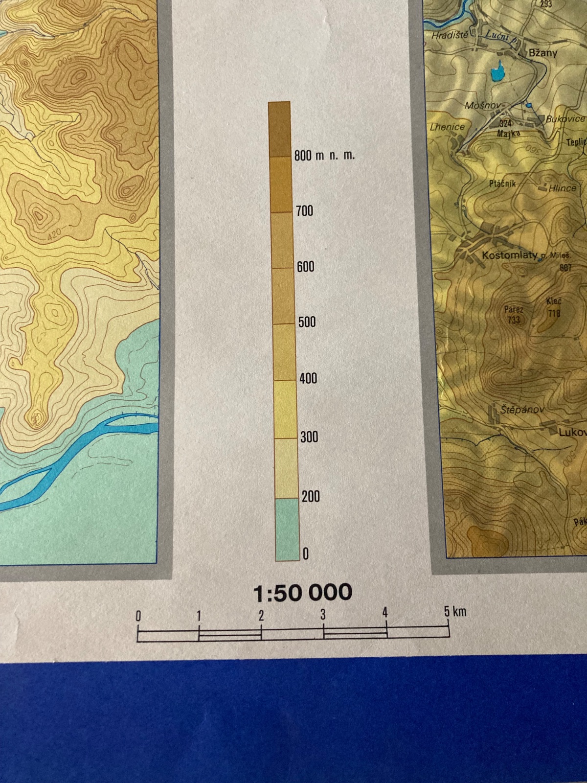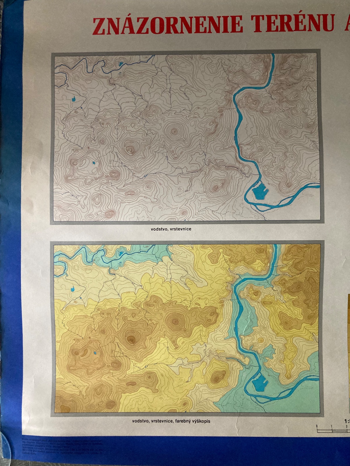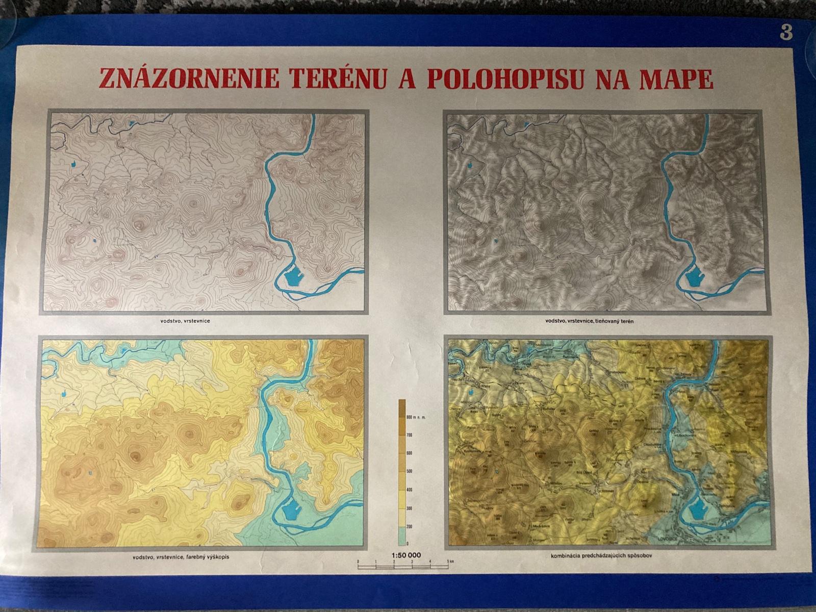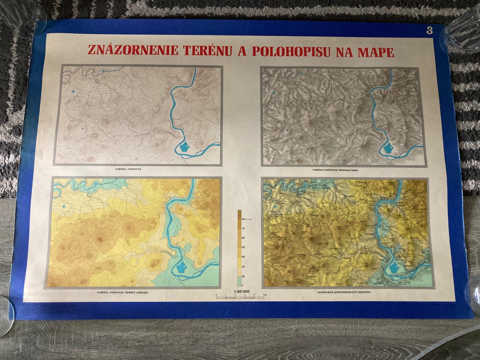 pekný stav, staršia nástenná učebná pomôcka - Znázornenie terénu a polohopisu na mape, základy kartografie