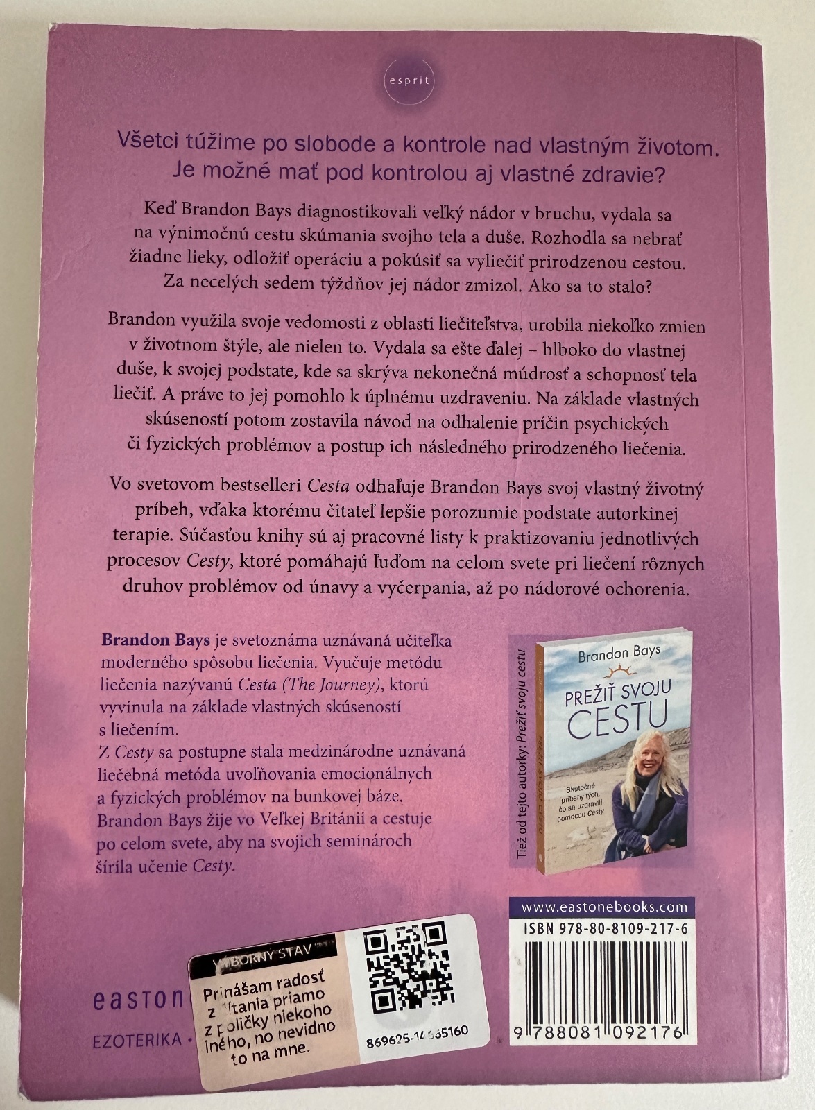 ❤️❤️Kniha Cesta/Praktický návod na ozdravenie a oslobodenie sa/ od Brandon Bays. Kniha citana, stav vynikajuci skoro ako nova az na sem tam jemne oznacene odstavce.Keď Brandon Bays našli veľký nádor, vydala sa na výnimočnú cestu skúmania svojho tela a duše. Rozhodla sa odložiť operáciu a pokúsiť sa vyliečiť prirodzenou cestou. Do siedmich týždňov jej nádor zmizol.Brandon využila svoje vedomosti z oblasti liečiteľstva a vydala sa ešte ďalej – hlboko do vlastnej duše, k svojej podstate, kde sa skrýva nekonečná múdrosť a schopnosť tela liečiť. Na základe vlastných skúseností potom zostavila návod na zistenie príčin psychických či fyzických problémov a postup ich následného prirodzeného liečenia. Vo svetovom bestselleri Cesta odhaľuje Brandon celý tento príbeh, vďaka čomu čitateľ lepšie porozumie podstate jej terapie. Súčasťou knihy sú aj pracovné listy k praktizovaniu jednotlivých procesov Cesty, ktoré pomáhajú ľuďom na celom svete pri liečení rôznych druhov problémov.POČET STRÁN:200,VÄZBA:brožovaná väzba,ROZMER:145×207 mm,HMOTNOSŤ:263 g,JAZYK:slovenčina,VYDAVATEĽSTVO:Eastone Books❤️❤️