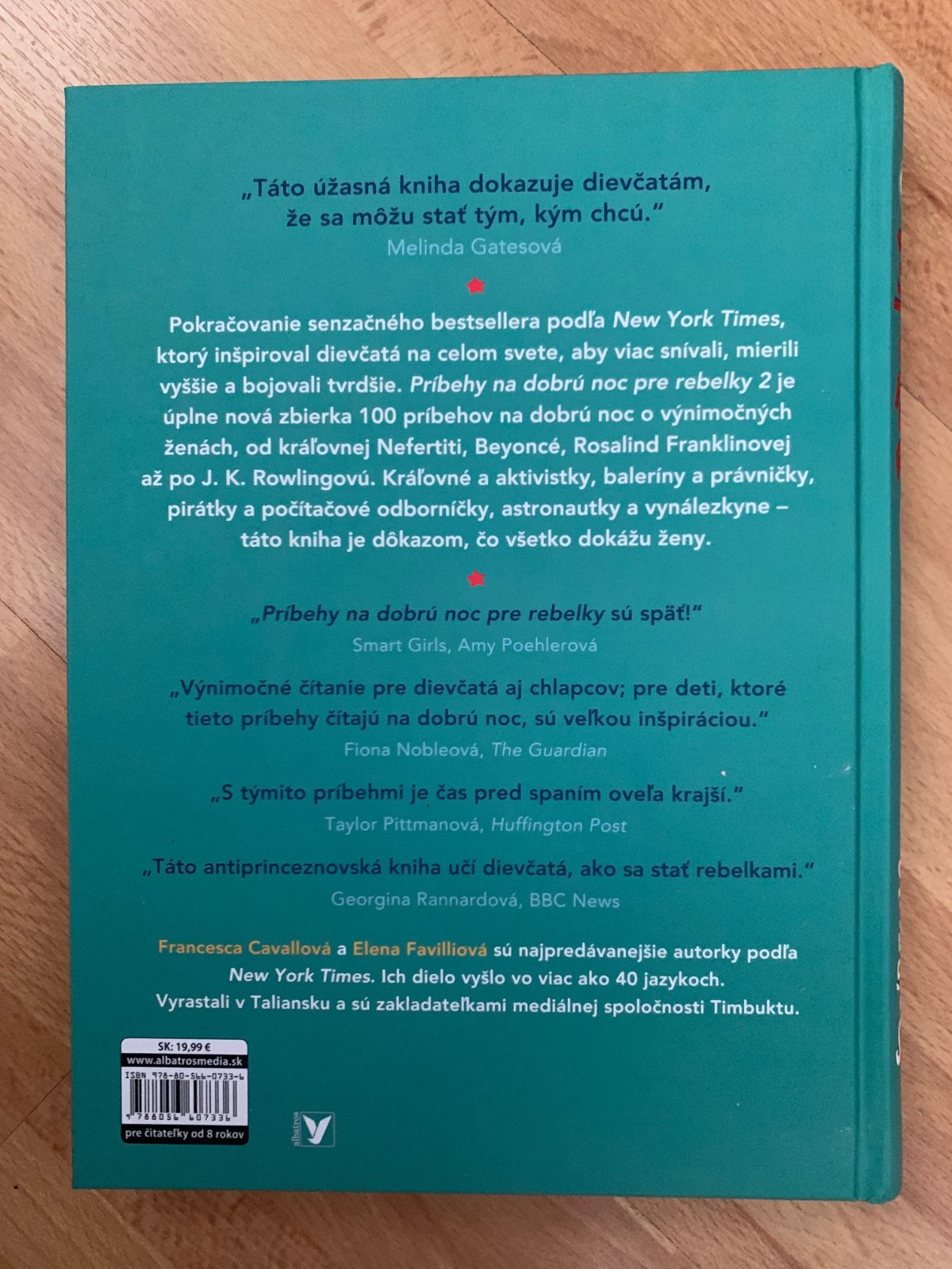 Príbehy na dobrú noc pre rebelky 2 je úplne nová zbierka 100 príbehov na dobrú noc o výnimočných ženách, od kráľovnej Nefertiti, Beyoncé, Rosalind Franklinovej až po J. K. Rowlingovú. Kráľovné a aktivistky, baleríny a právničky, pirátky a počítačové odborníčky, astronautky a vynálezkyne – táto kniha je dôkazom, čo všetko dokážu ženy.