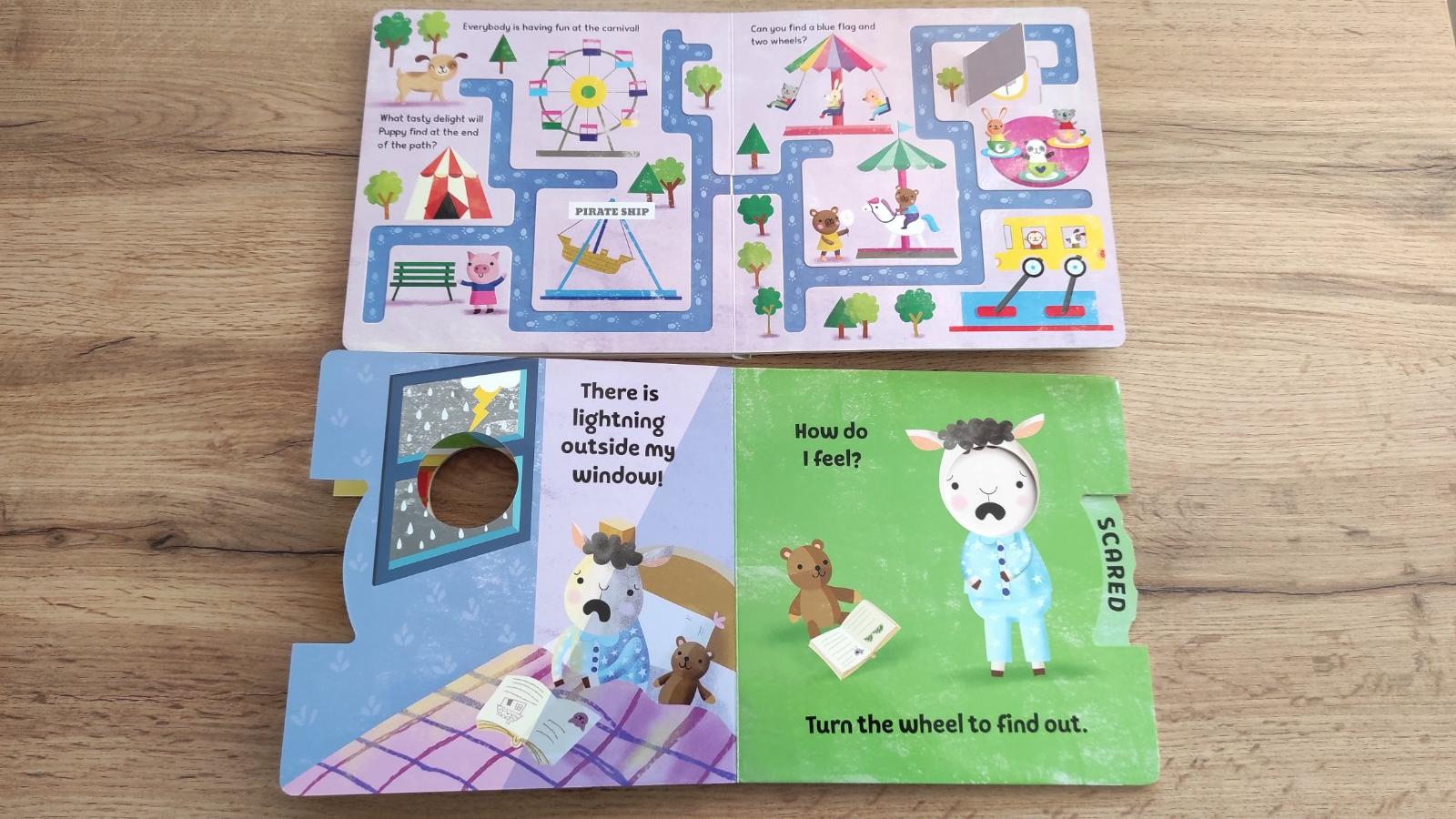 Ponúkam na predaj krásne knižky v bezchybnom stave. Knihy boli cítané ale vždy len v mojej prítomnosti dávala som na nej pozor, tak sú stále ako nove. V knižke o pocitoch sa krúti kolieskom aby sa vybrala vhodná tvárička k danej situácii. V druhej knižke sa dieťa prstekom musí dostať po cestičke do cieľa, obsahuje otváracie okienka. Text je v Anglickom jazyku, boli kupované v IE, ale je to jednoduchá angličtina, prípadne si vymyslite slovenský popis obrázkov aj samy. Ponúkam za cenu 8 eur.