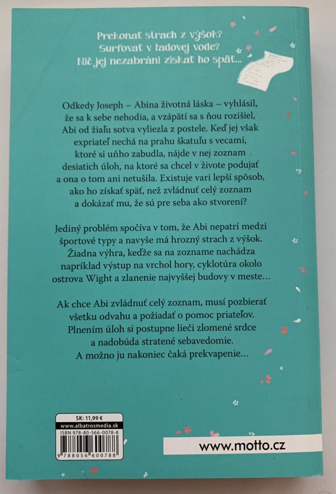 Odkedy Joseph – Abina životná láska – vyhlásil, že sa k sebe nehodia, a vzápätí sa s ňou rozišiel, Abi od žiaľu sotva vyliezla z postele. Keď jej však expriateľ nechá na prahu škatuľu s vecami, ktoré si uňho zabudla, nájde v nej zoznam desiatich úloh, na ktoré sa chcel v živote podujať. Existuje vari lepší spôsob, ako ho získať späť, než zvládnuť všetky výzvy a dokázať mu, že sú pre seba ako stvorení? Hoci je zoznam pre Abi extrémne náročný, zdá sa, že tá najväčšia výzva je počúvať svoje srdce...