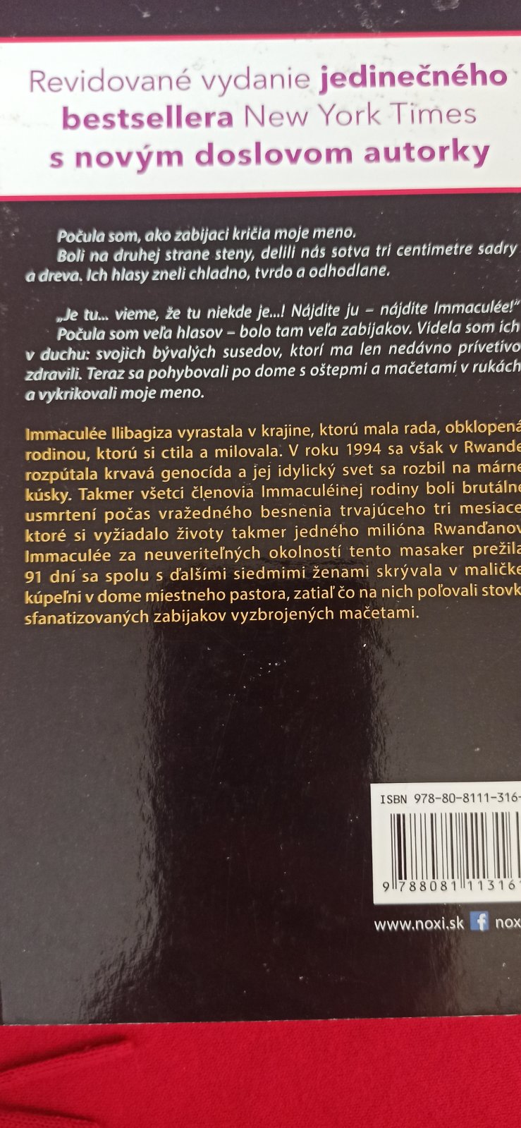 Neuveriteľne dramatický ale SKUTOČNÝ príbeh...Immaculée Ilibagiza vyrastala v krajine, ktorú mala rada, s milovanou rodinou. V roku 1994 sa však v Rwande rozpútala krvavá genocída a Immaculéin dovtedajší život sa rozbil na márne kúsky. Takmer všetci členovia Immaculéinej rodiny boli brutálne zavraždení počas trojmesačného besnenia, ktoré si vyžiadalo životy asi milióna Rwanďanov. Immaculée tento masaker prežila za neuveriteľných okolností. 91 dní sa spolu s ďalšími siedmimi ženami skrývala v maličkej kúpeľni v dome miestneho pastora, zatiaľ čo na nich poľovali stovky sfanatizovaných zabijakov vyzbrojených mačetami...