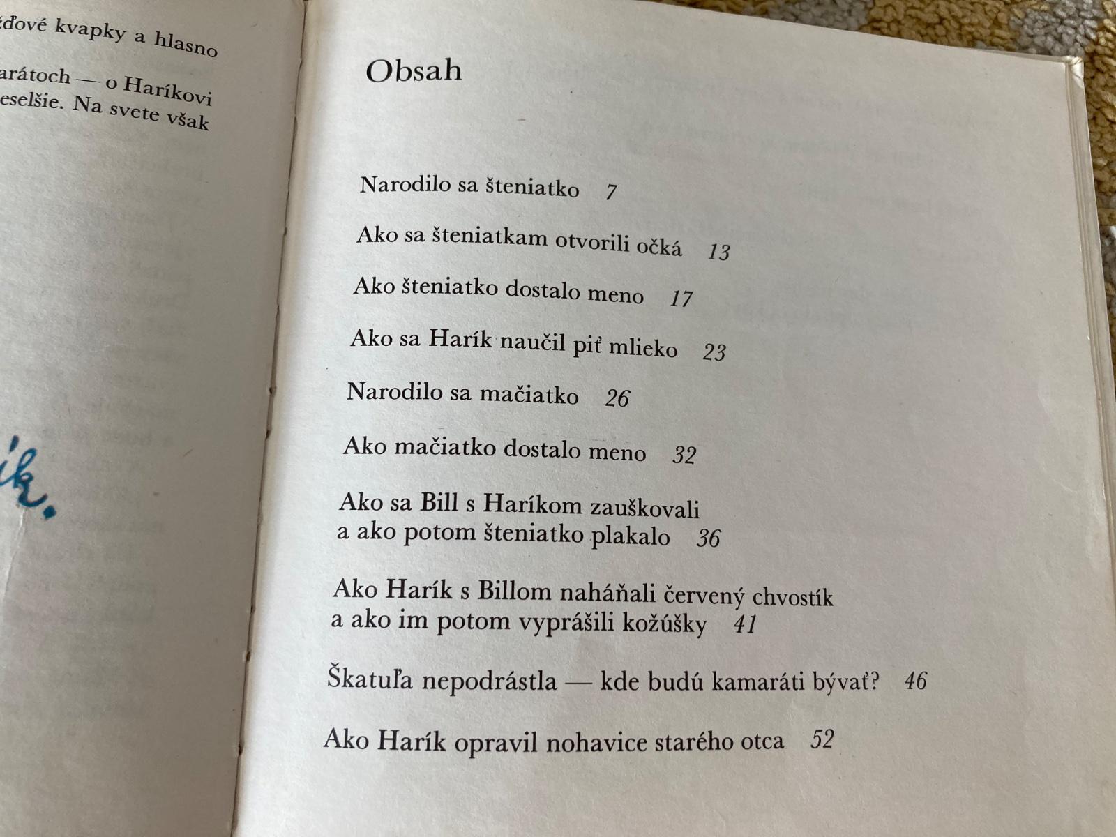 Z obsahu: Narodilo sa šteniatko, Ako sa Harík naučil piť mlieko, Narodilo sa mačiatko, Ako Harík opravil nohavice starého otca, Ako Bill spadol do smotany, čo pálila ani oheň…