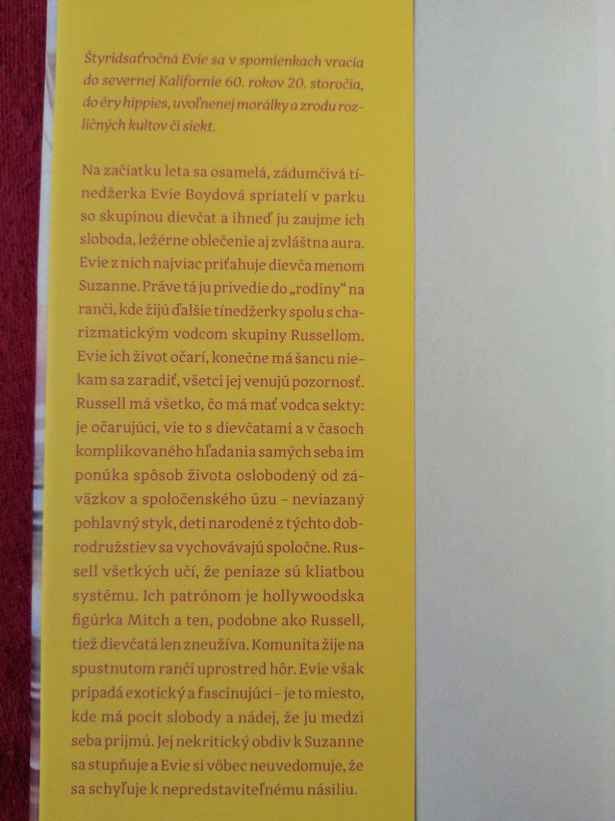 Štyridsaťročná Evie sa v spomienkach vracia do severnej Kalifornie 60. rokov 20. storočia, do éry hippies, uvoľnenej morálky a zrodu rozličných kultov či siekt.