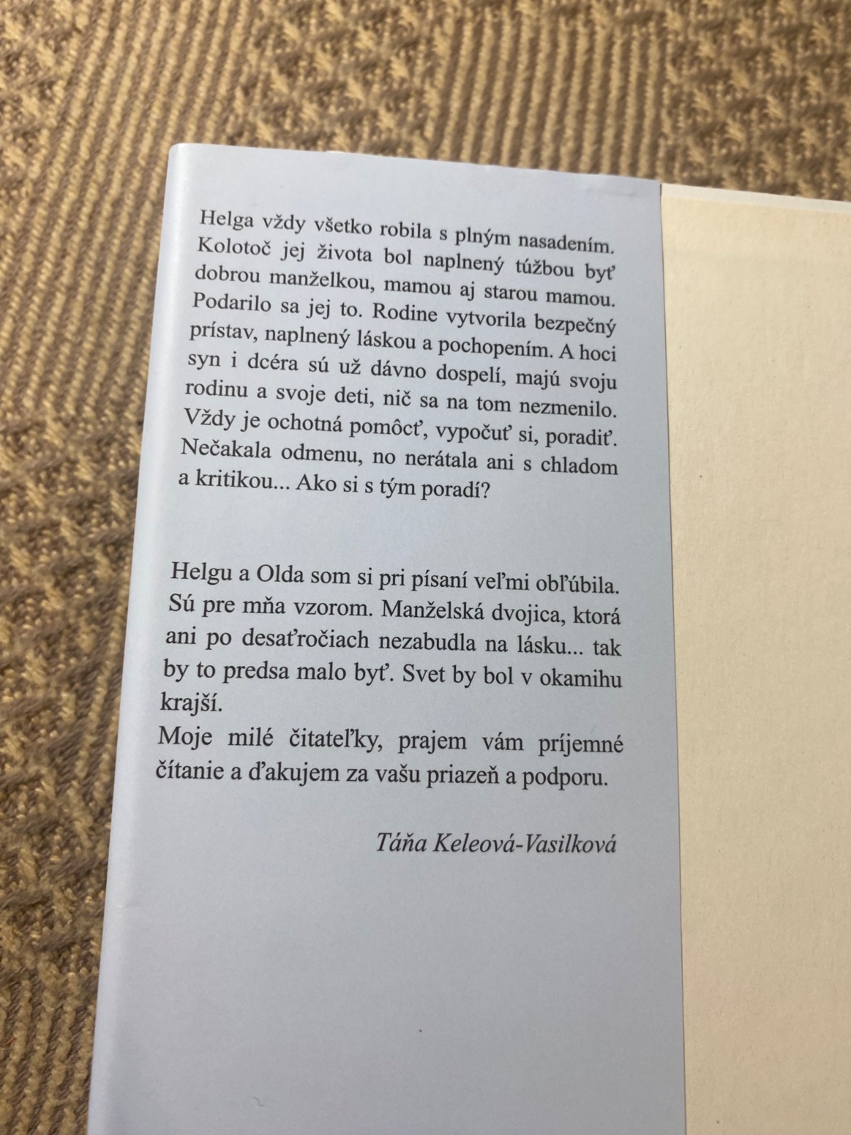 Helga všetko robí s plným nasadením. Kolotoč jej života bol naplnený túžbou byť dobrou manželkou, mamou aj starou mamou. Podarilo sa jej to. Rodine vytvorila bezpečný prístav, naplnený láskou a pochopením. A hoci syn i dcéra sú už dávno dospelí, majú svoju rodinu a svoje deti, nič sa na tom nezmenilo. Vždy je ochotná pomôcť, vypočuť si, poradiť. Nečakala odmenu, no nerátala ani s chladom a kritikou...