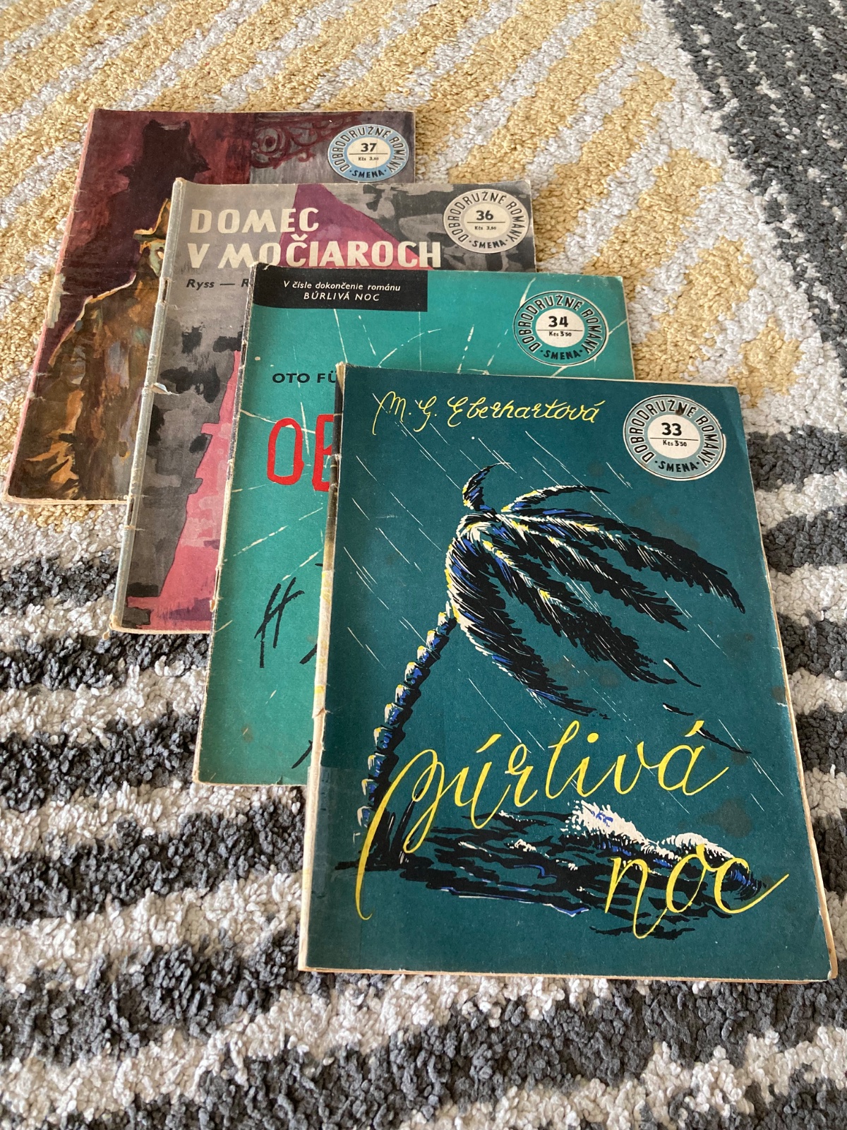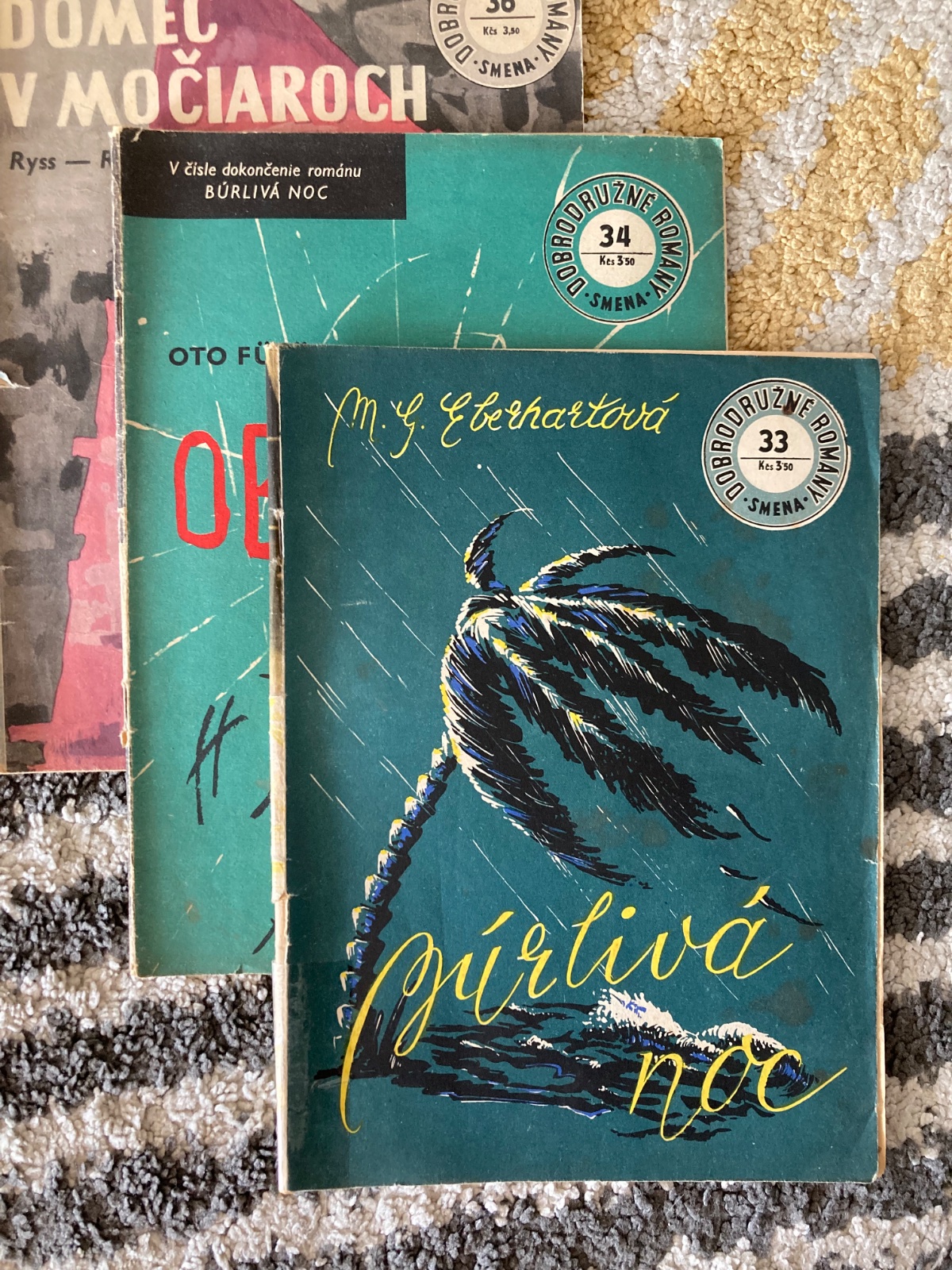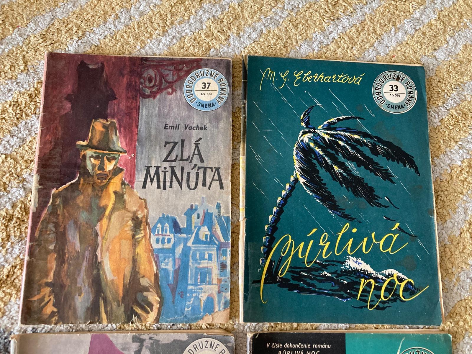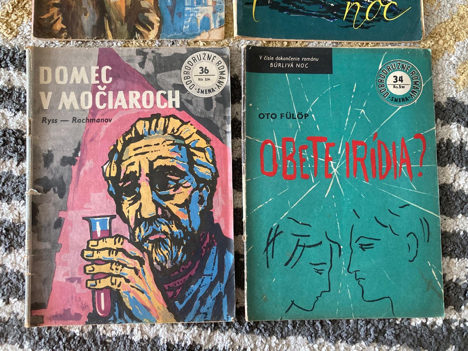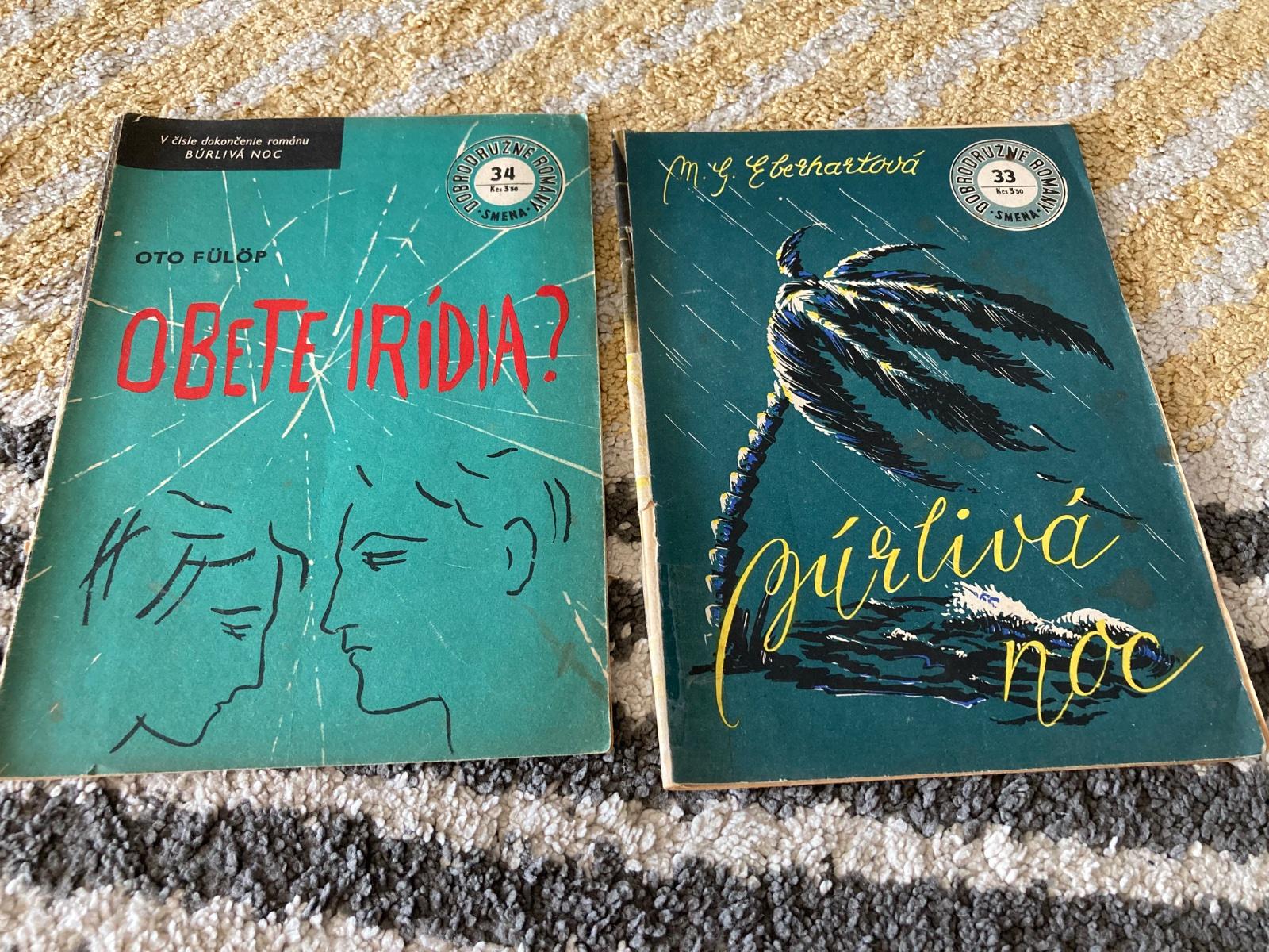 Pekný stav, krásne staré retro dobrodružné romány, vydania z roku 1959, zachovalé, žltšie opotrebovanejšie strany, bez pečiatok, bez vpisov, obaly sú viac opotrebované, Zlá minúta má odtrhnutý kúsok rohu prednej strany a zalepený chrbát obalu, Búrlivá noc má prelepený kúsok chrbta prebalu páskou, Obete irídia majú vpis perom