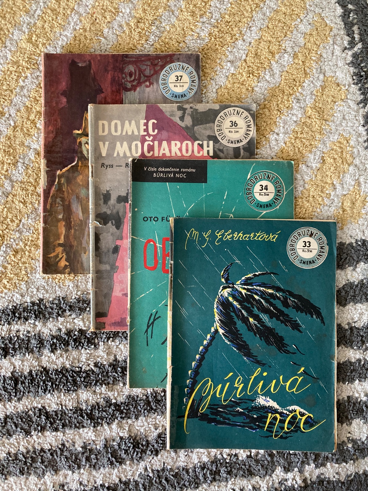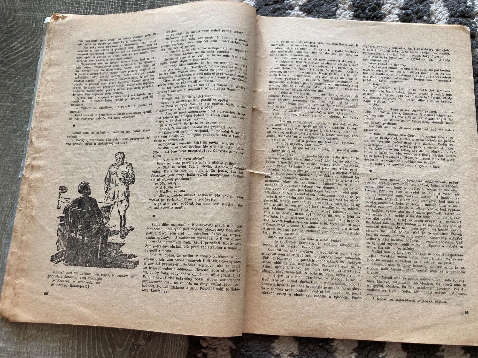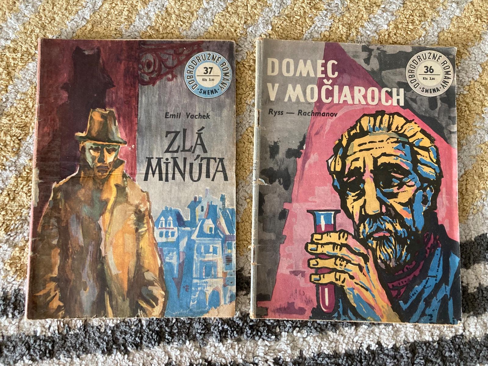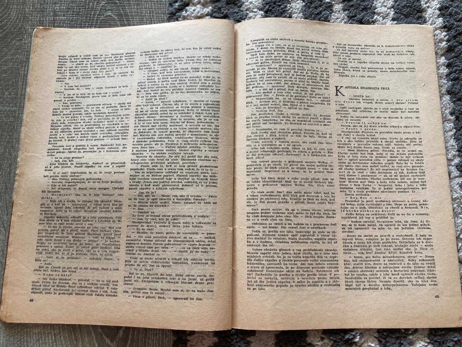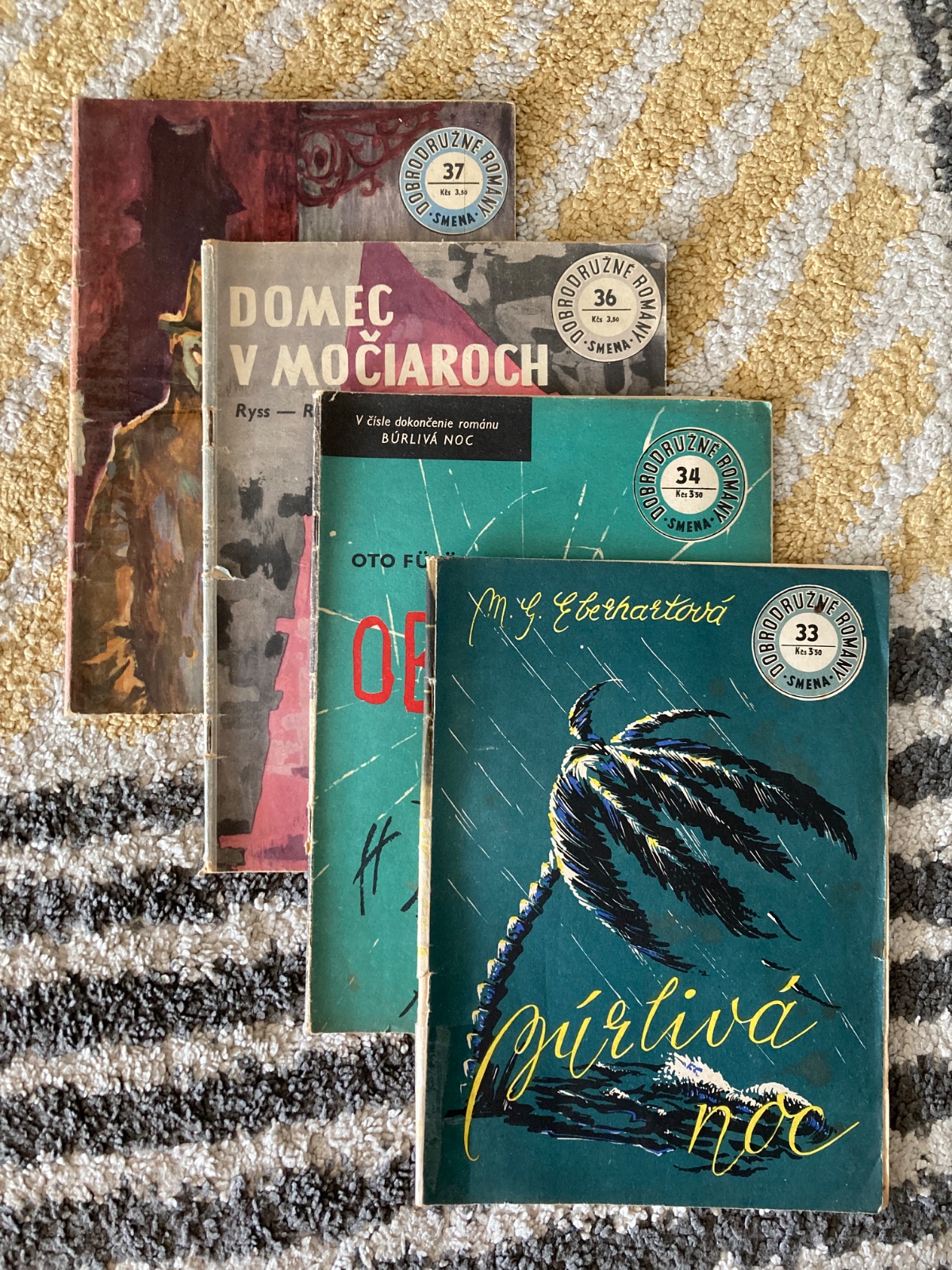 Pekný stav, krásne staré retro dobrodružné romány, vydania z roku 1959, zachovalé, žltšie opotrebovanejšie strany, bez pečiatok, bez vpisov, obaly sú viac opotrebované, Zlá minúta má odtrhnutý kúsok rohu prednej strany a zalepený chrbát obalu, Búrlivá noc má prelepený kúsok chrbta prebalu páskou, Obete irídia majú vpis perom