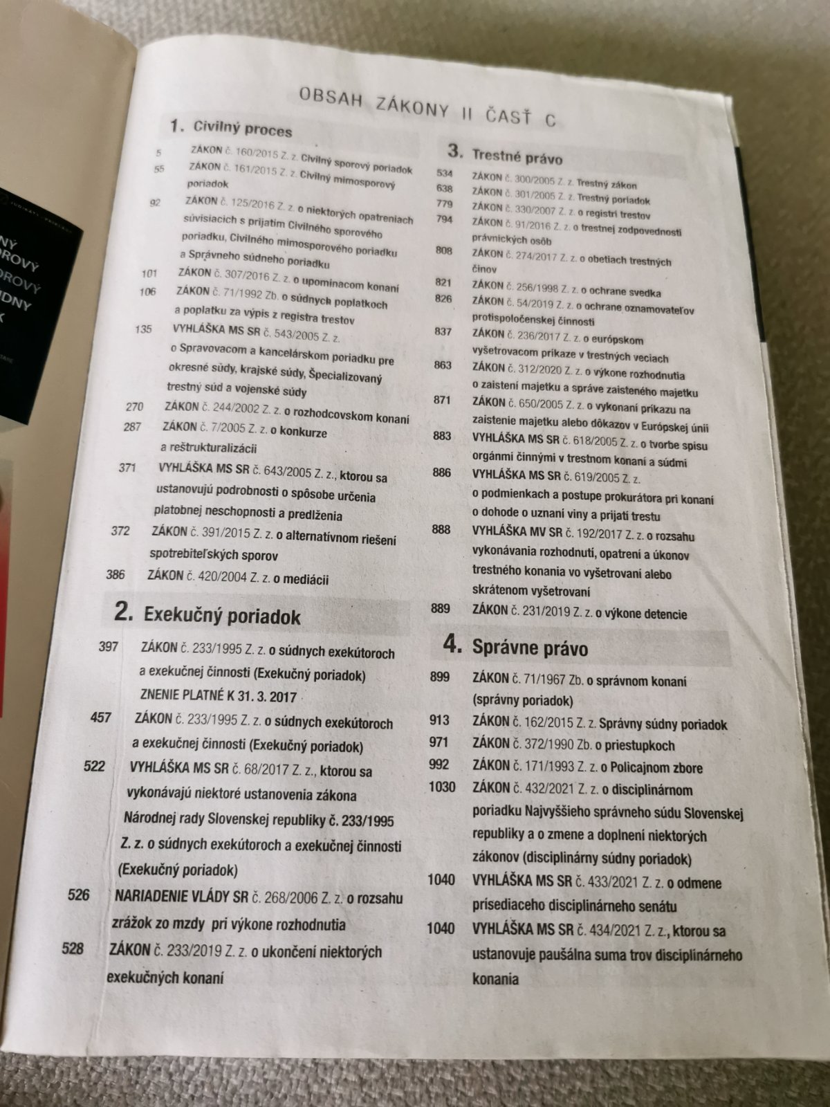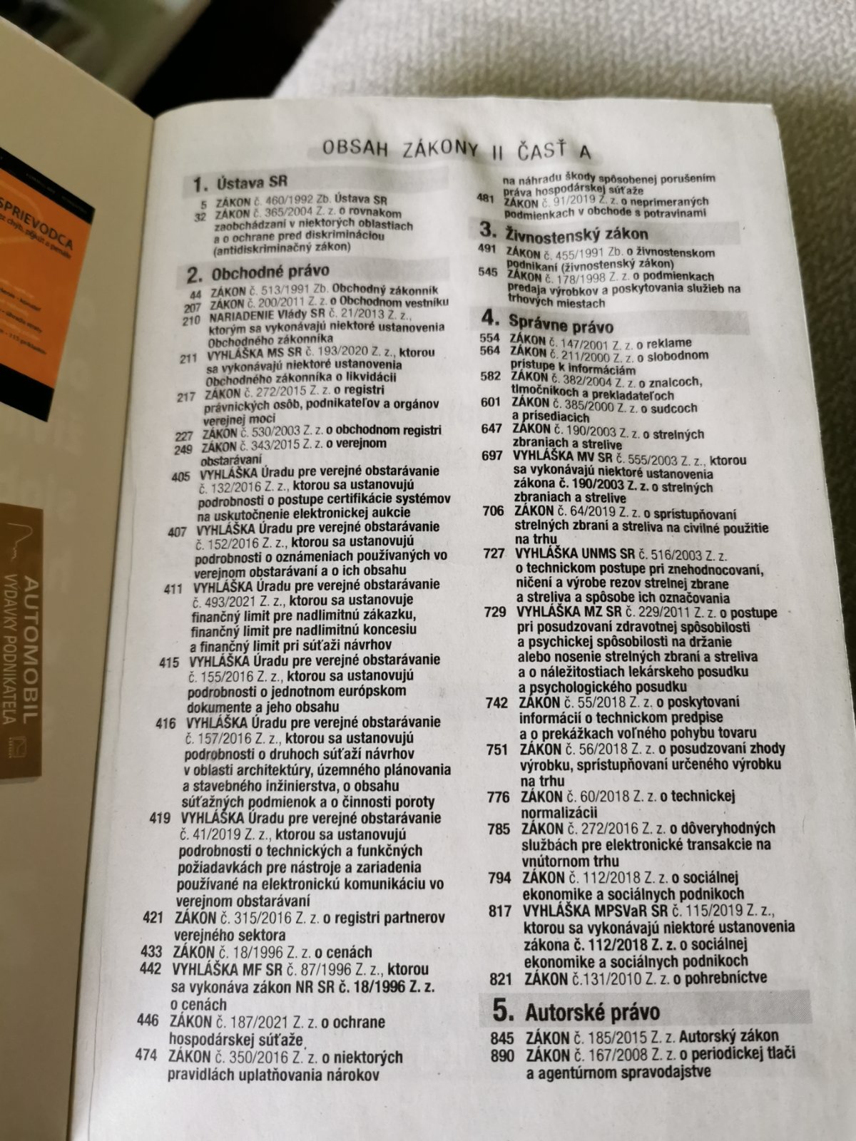 Ústava, Obchodný zákonník, Živnostenský zákon a iné k podnikaniu, Zákon o strelných zbraniach, Autorský zákon, Občiansky zákonník, Zákon o rodine, ochrana spotrebiteľov, zákony k prokuratúre, advokátom, notárom, SBS, Civilné konanie, Exekučný poriadok, Trestný zákon a Trestný poriadok, Správny poriadok, Zákon o priestupkoch... A mnohé ďalšie..