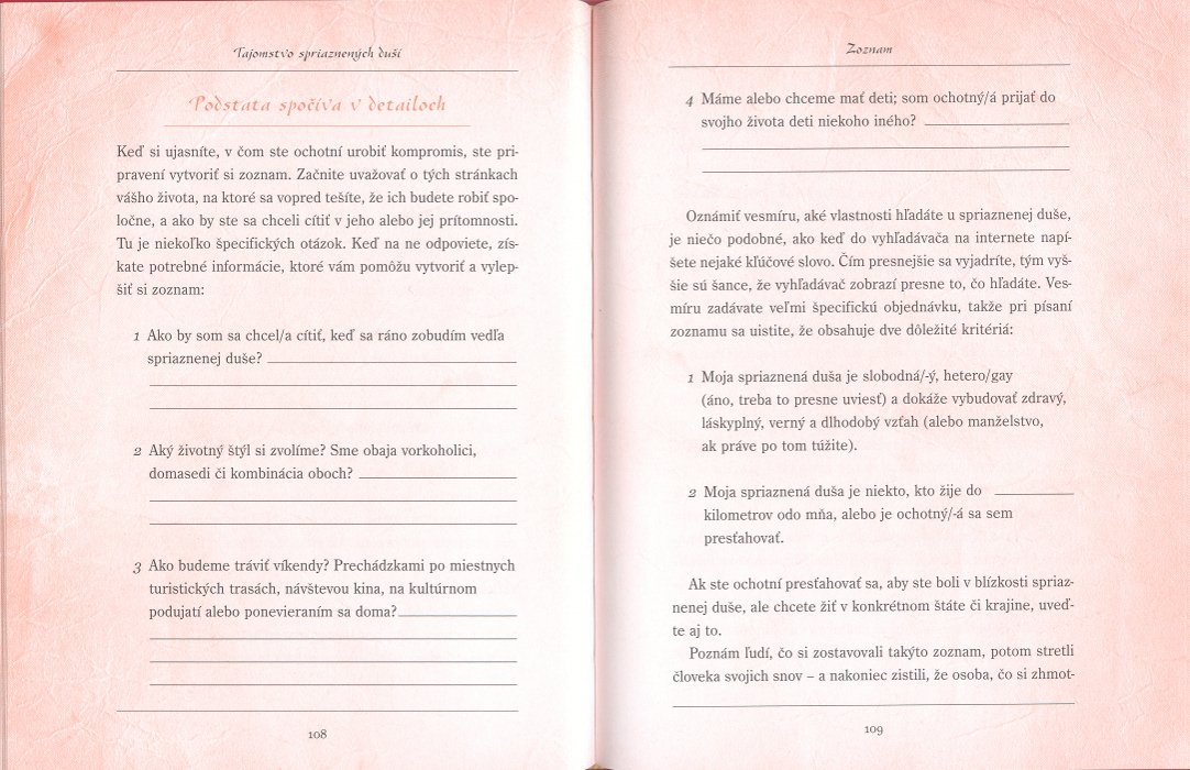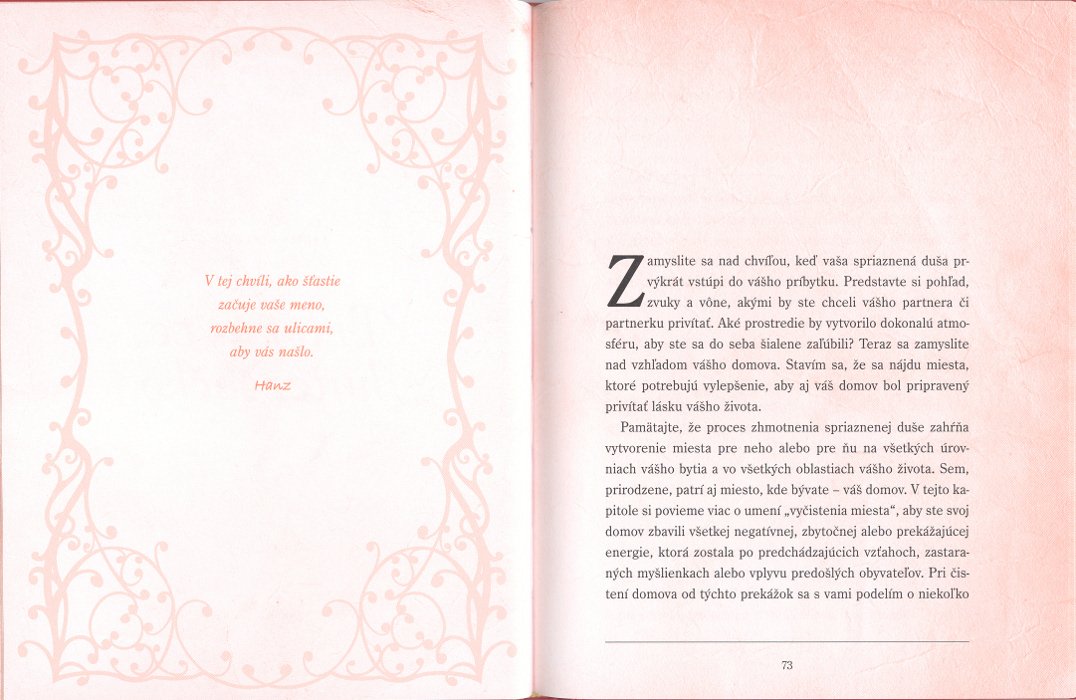 Premýšľali ste niekedy nad tím, čo znamená najst lásku svojho života? Je vaším snom najst si partnera, Ktorý vás bude ľúbiť, tešiť a obdivovať? Tajomstvo spriaznených duší vám ukáže, ako vziať kontrolu nad romantickým osudom do vlastných rúk a ako pri tom využiť zákon príťažlivosti. Každý si v živote mozem najst pravej lásky, ak sa na to dôkladne pripraví. Arielle Fordovej to vie z vlastnej skusenosti. Techník a metód, Ktory použila v tejto knihe, hľa ho pomohli vniesť lásku do svojho života. Autorka používa niekolko krokové - napríklad proces nazvaný precítenie -, aby sme každú bunku svojho tela cítili to, čo chceme zhmotniť. Okrem toho odhaľuje, ako zhmotniť muža sa alebo ženu svojich ložísk snov. Rituály a projekty, ktore nájde na Následujúca stránkach, vám umožníme pripraviť svoju domov, telo, myseľ a dušujú na lásku, po ktorej tuží vaše srdce.