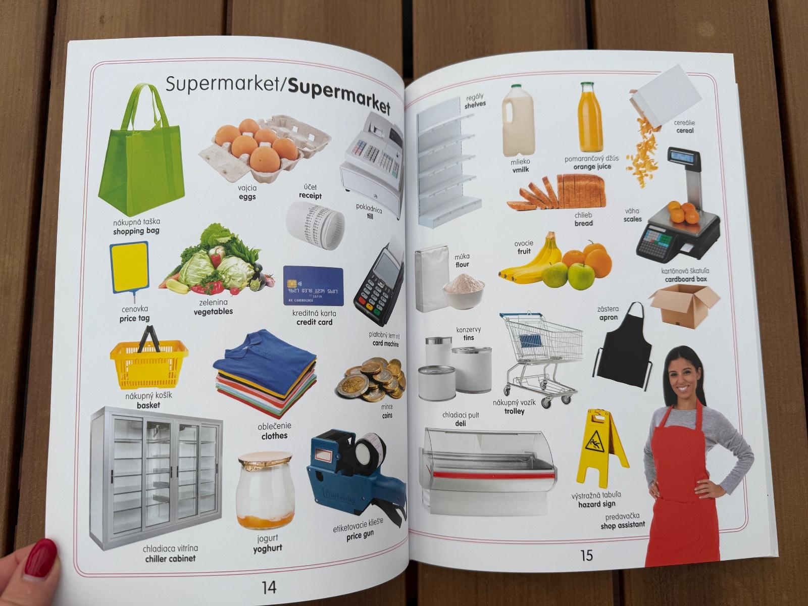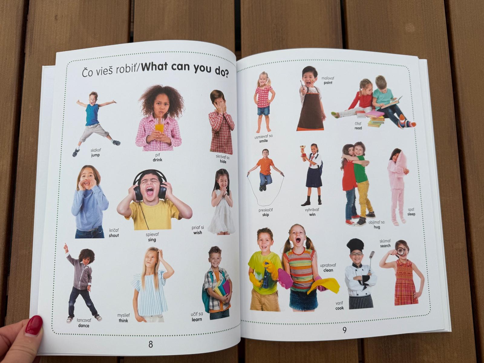Malé deti spoznávajú svet pozorovaním vecí okolo seba, ktoré sa následne učia pomenúvať. V dnešnom modernom svete však dosť skoro prichádzajú do kontaktu aj s cudzími jazykmi. Tento obrázkový anglicko-slovenský slovník plný farebných fotografií prináša slová z každodenného života aj s ich anglickými ekvivalentmi. Deti si tak osvoja slovíčka z prostredia domu, škôlky či prírody, ale aj slová, ktorými pomenúvame zvieratá a ich mláďatá, časti tela, základné tvary, veci každodennej potreby či športové vybavenie. Vďaka tejto knihe si môžu rozšíriť svoju slovnú zásobu tak v rodnom, ako aj v anglickom jazyku.