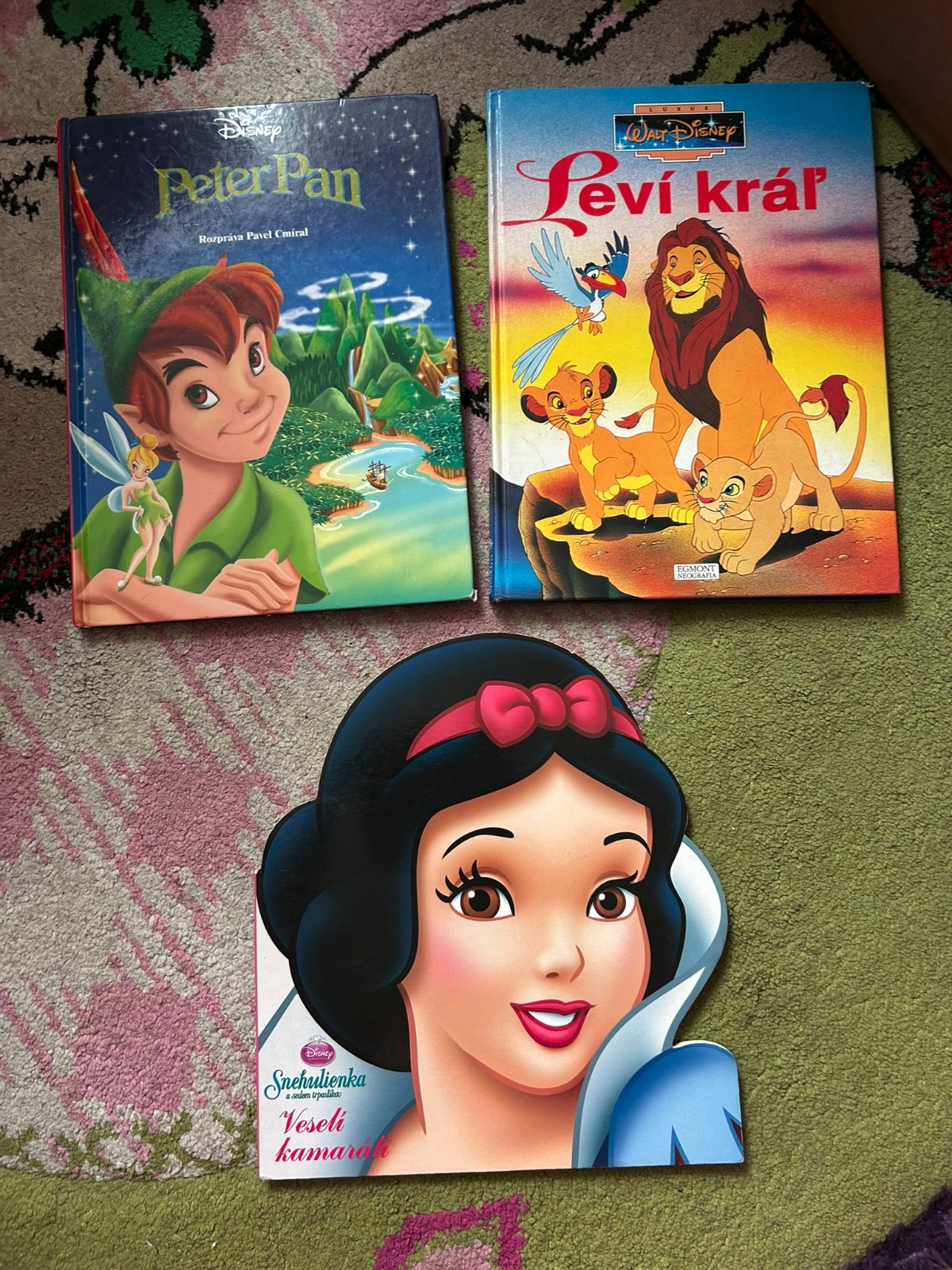 Snehulienka bez poškodení, Peter Pan má trošku poškodený roh na obale, tak isto aj Leví kráľ, ktorý má navyše páskou prelepených zopár stránok. Všetky sú však stále pekné a čitateľné