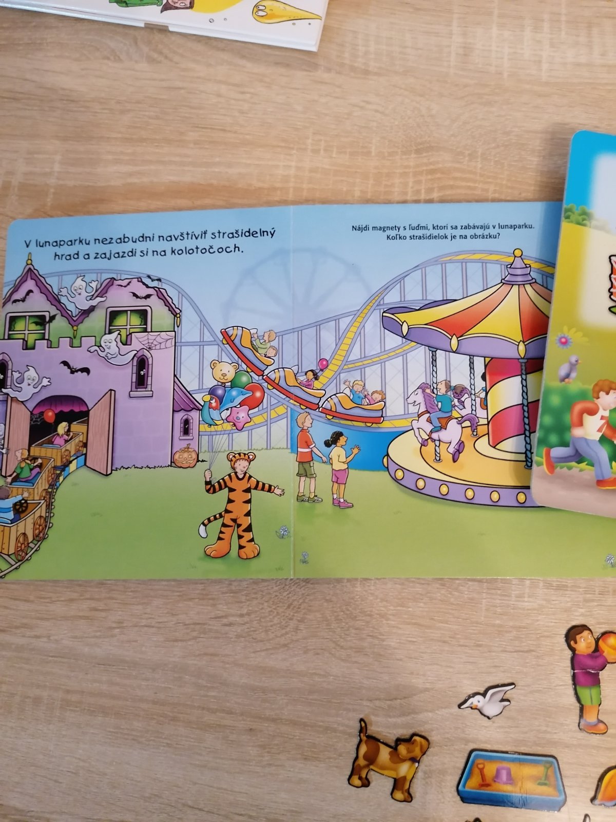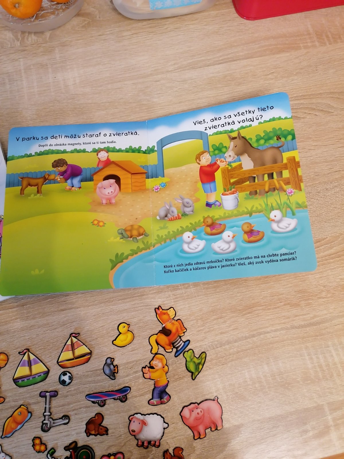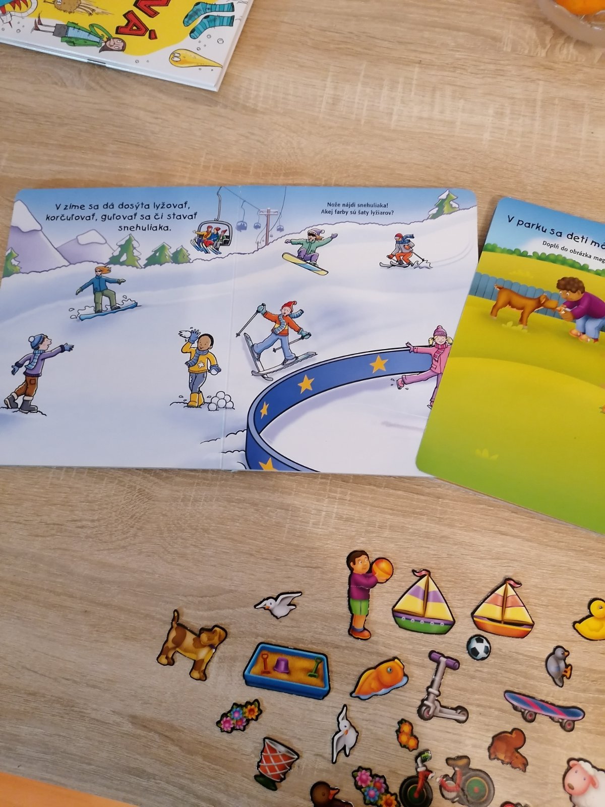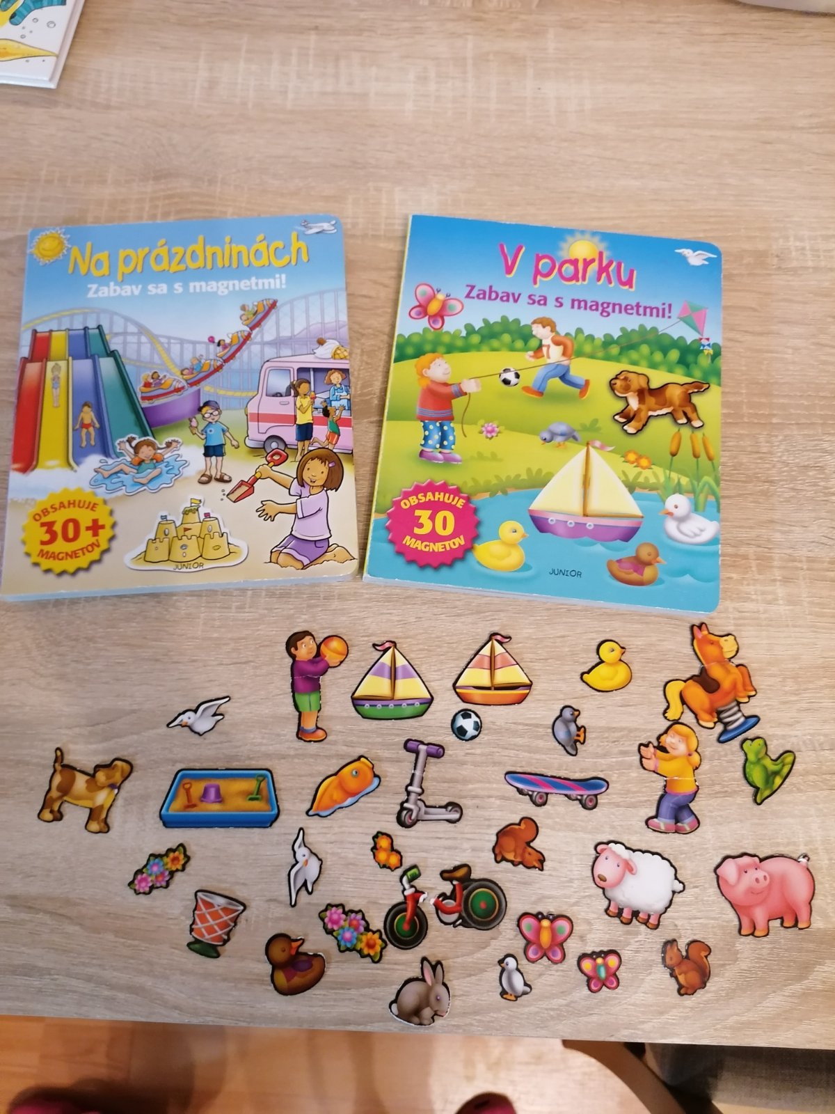Knižky s magnetkami, deti ich mali veľmi radi, čiže už tak všeobecne vidno na nich používanie, magnetky 30kusov sú len k tej jednej knižke, k tej druhej nemáme, ale dajú sa používať aj tam. Jedna magnetka roztrhnuta, cena spolu, spa.