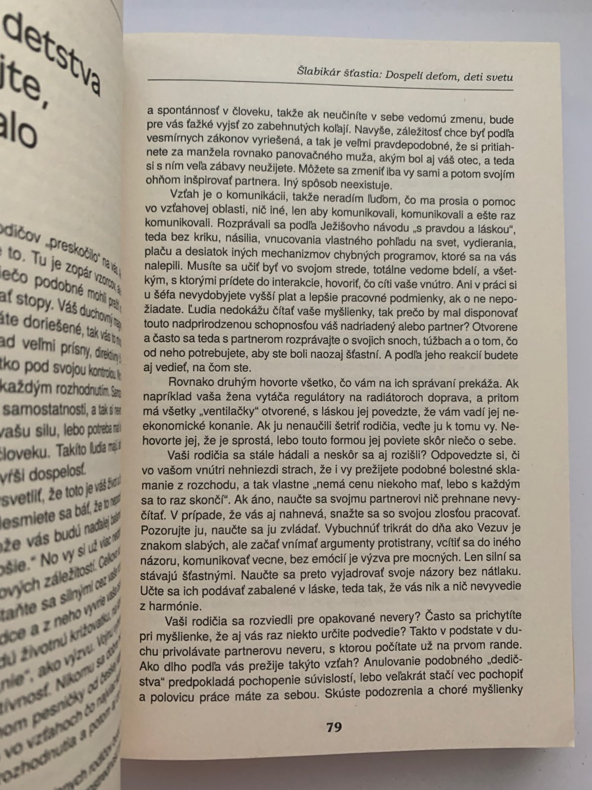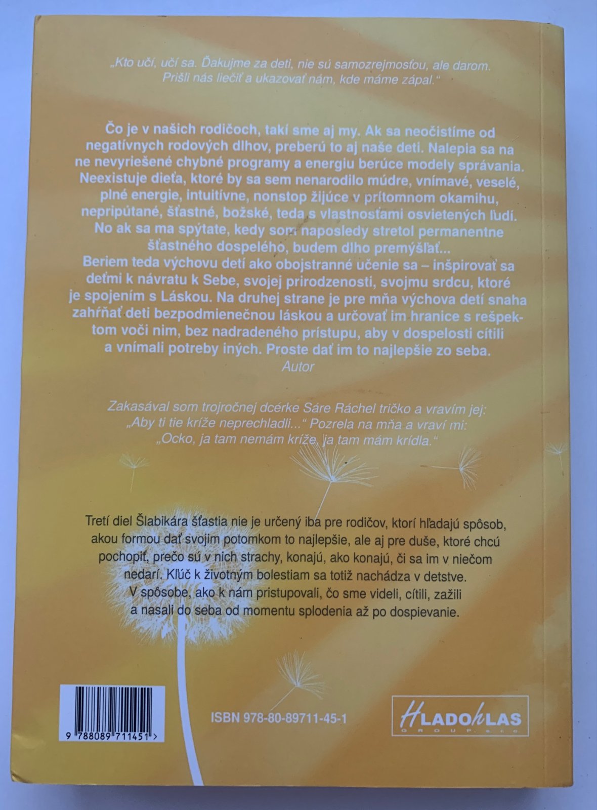 Tretí diel Šlabikára šťastia nie je určený iba pre rodičov, ktorí hľadajú spôsob, akou formou dať svojim potomkom to najlepšie, ale aj pre duše, ktoré chcú pochopiť, prečo sú v nich strachy, konajú ako konajú, či sa im v niečom nedarí. Kľúč k bôľom dneška sa totiž nachádza v detstve, v spôsobe, ako k vám bolo pristupované, čo ste videli, cítili a zažili od momentu splodenia až po dospievanie.
