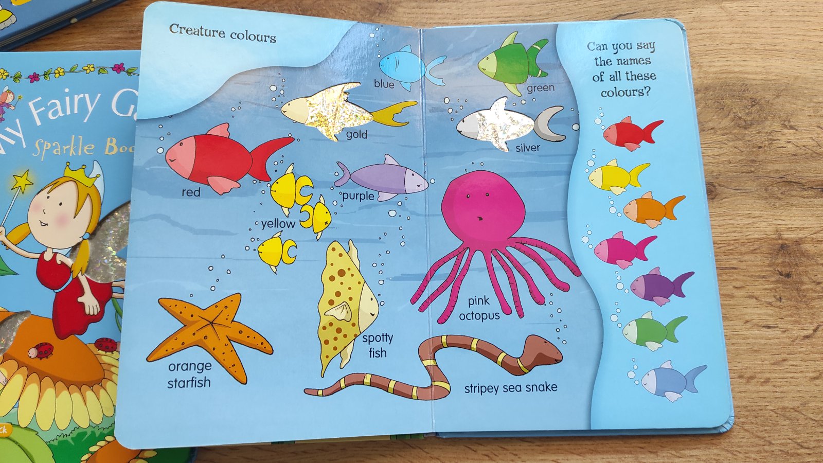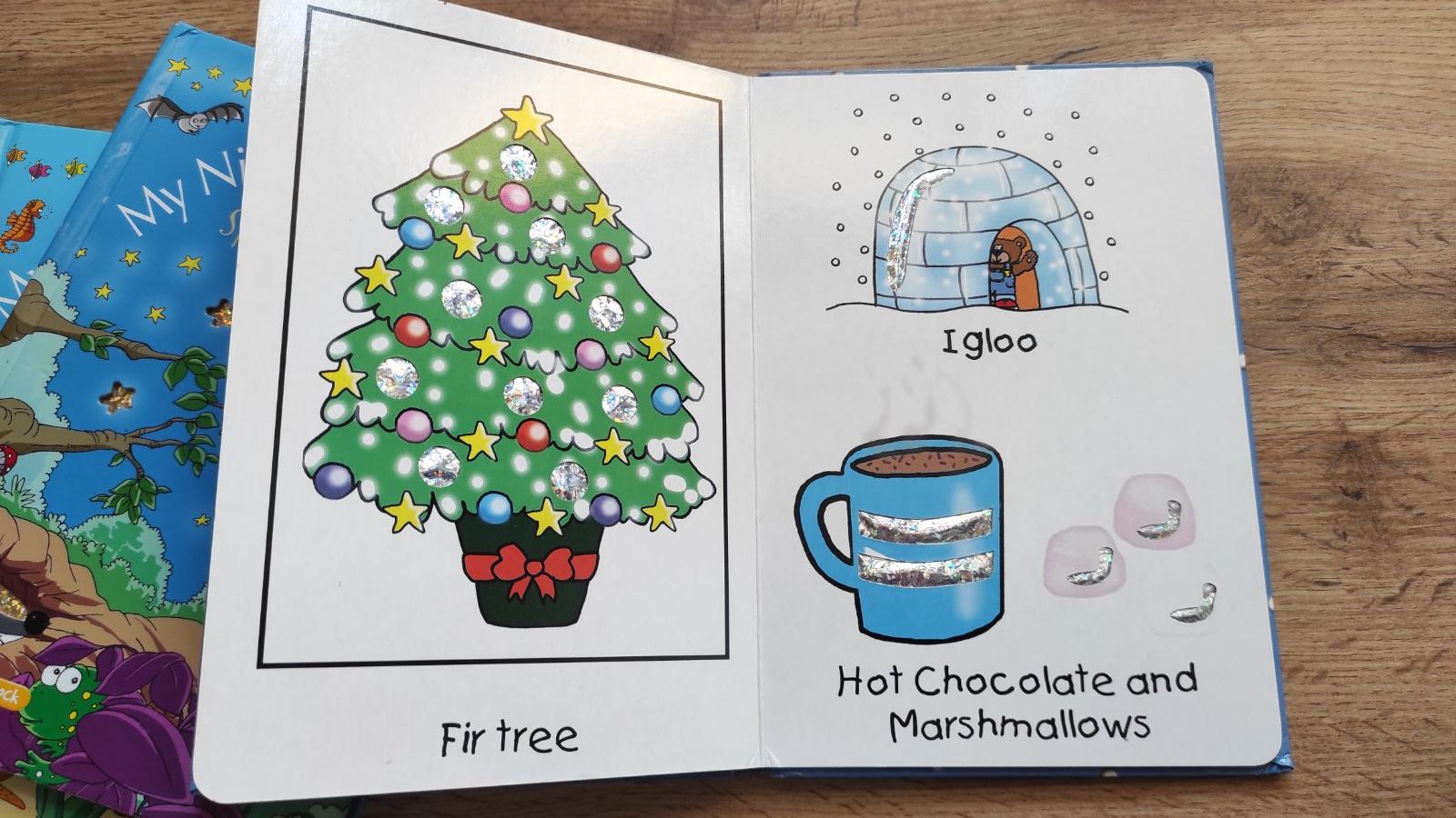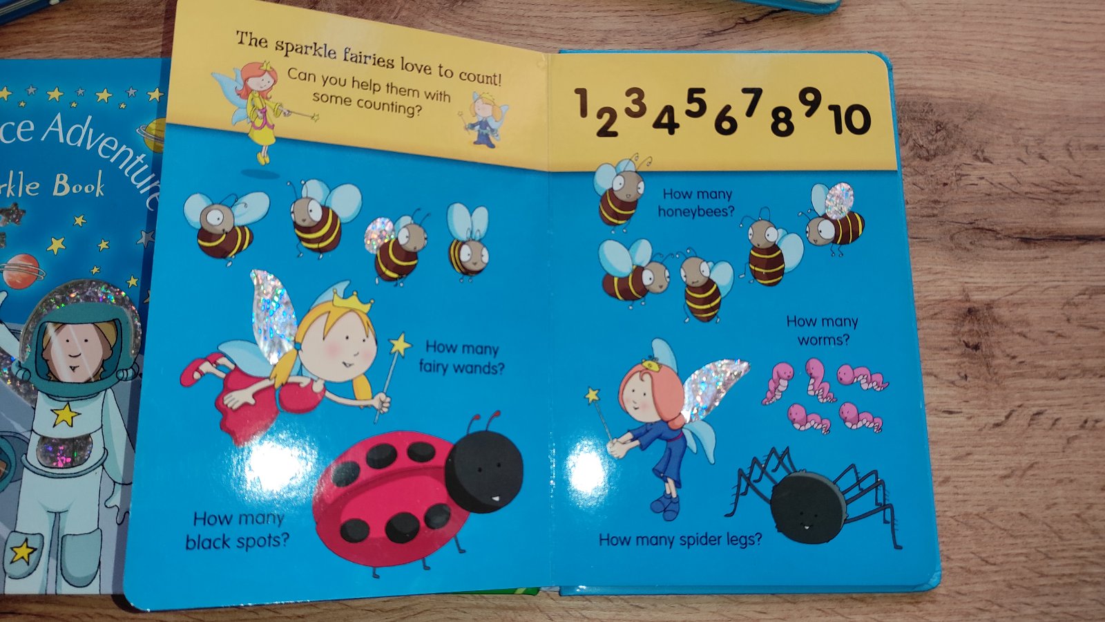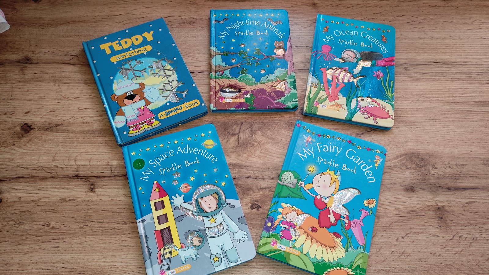 Ponúkam na predaj nádherné knižky pre deti. Knihy sú kupované v IE, u nás sa kúpiť nedajú. V top stave, boli cítané veľa krát ale vždy v mojej prítomnosti, dávala som na ne pozor. Je tam jednoduchá angličtina farby, čísla, základné slová, je na vás či ich použijete v angličtine alebo slovenčine. Sú tam milé úlohy, v každej knižke spocitaj koľko tam je...., hľadanie rozdielov, nájdi....,.... . Trblietavé detaily na stránkach, kt. majú deti radi. Knižka zimná je z inej edície tam sú len základné slovíčka a má poškodenie na dvoch stránkach a kusom zalepeny na obálke ( syn v nestráženej chvíľy chcel zobrať tie vločky :-) ) ale inak je tiež krásna. Určite potešia každé dieťa čo si radi prezerá knižky. Nie všade na foto vidno tie trblietavé časti, ale sú vsade. Cena 10 eur.