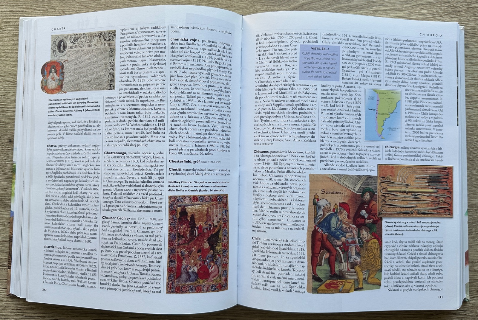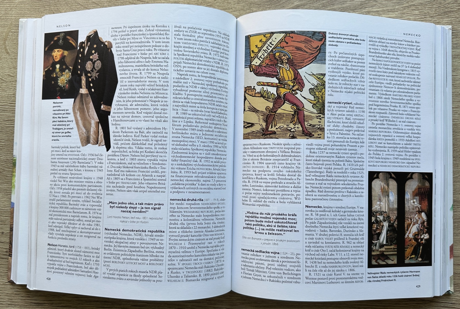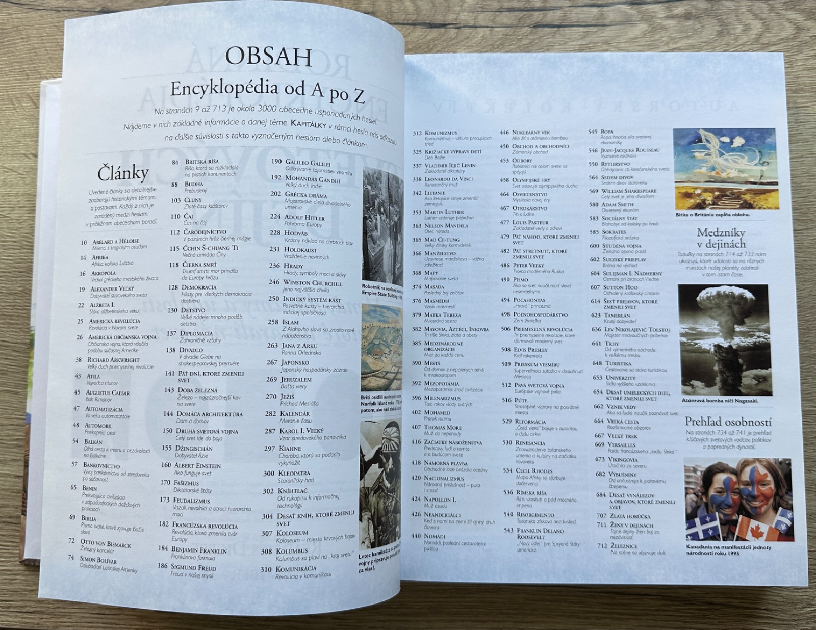 Okrem abecedne zoradených hesiel kniha ponúka viac než 140 článkov, ktoré sa detailnejšie zaoberajú historickými témami a postavami. Nájdete tu i chronologické tabuľky a prehľad kľúčových svetových vodcov, politikov a popredných dynastií.