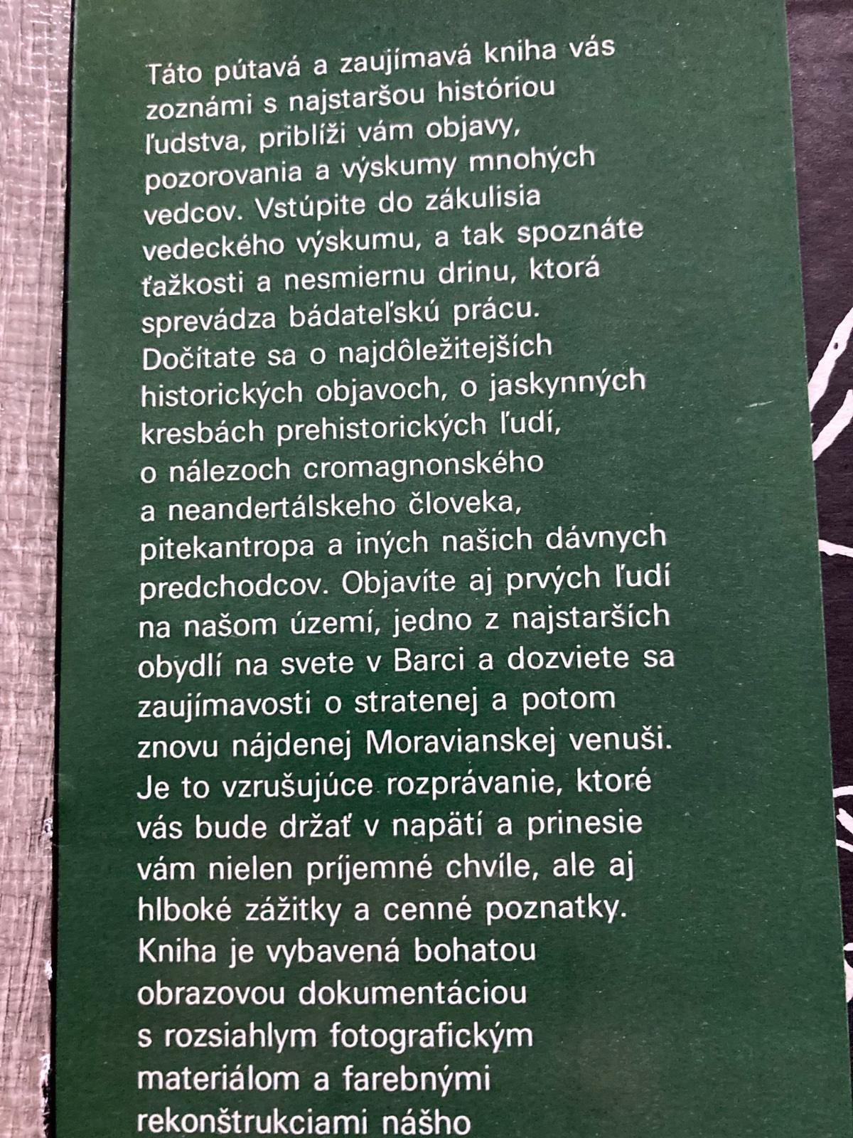 📌Populárno-náučna literatúra pre deti a mládež. Pútavá a zaujímava kniha ich oboznámi s najstaršou históriou ľudstva, priblíži objavy, pozorovania a výskumy mnohých vedcov. Dočítate sa o najdôležitejších historických objavoch, o jaskynných kresbách prehistorických ľudí, o nálezoch našich dávnych predchodcov. Objavíte aj prvých ľudí na našom území, jedno z najstarších obydlí na svete v Barci, zaujímavosti o Moravianskej venuši. Kniha je doplnená bohatou obrazovou dokumntáciou s rozsiahlym fotografickým materiálom a farebnými rekonštrukciami českého najznámejšieho maliara pravekého života Zdeňka Buriana...