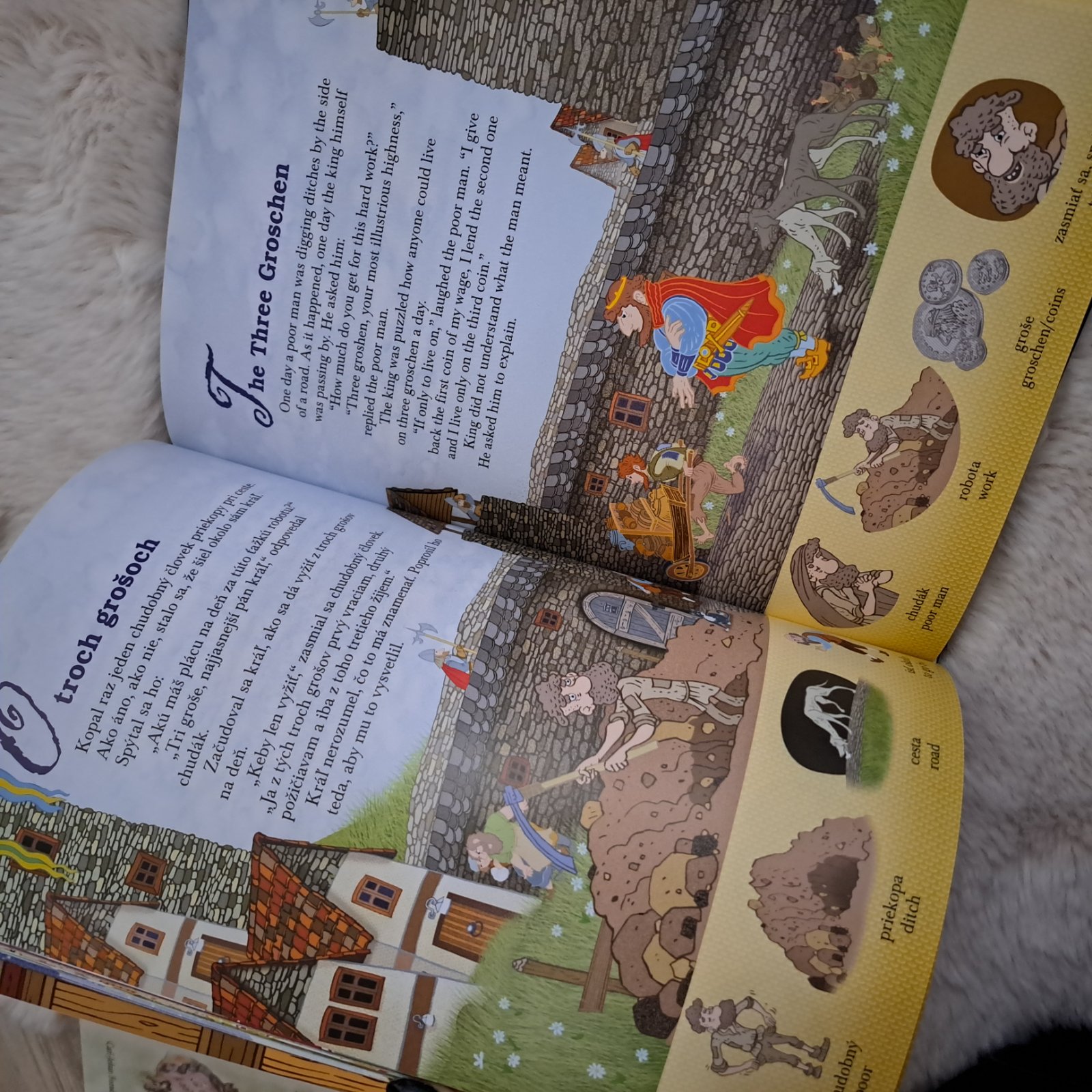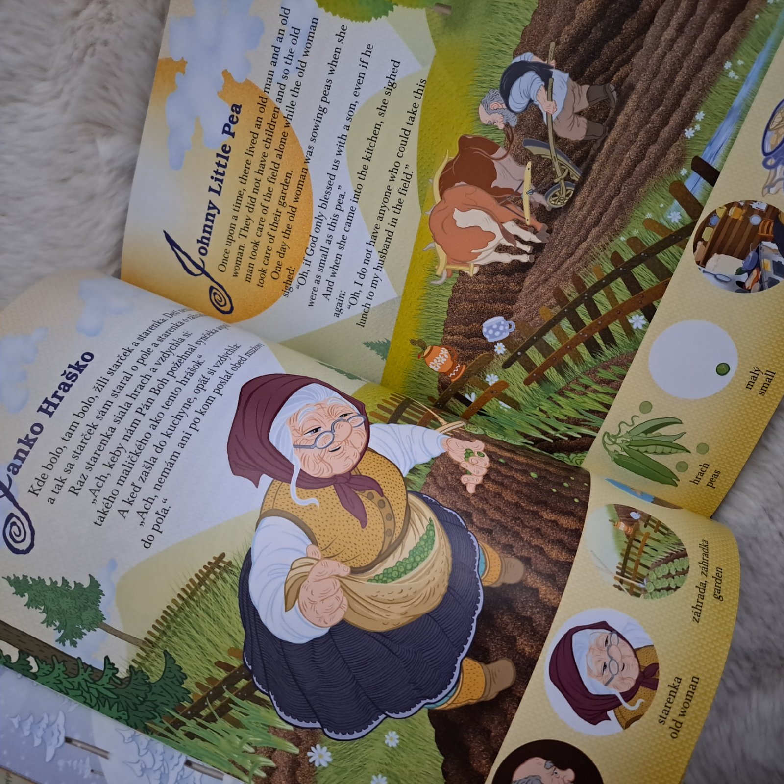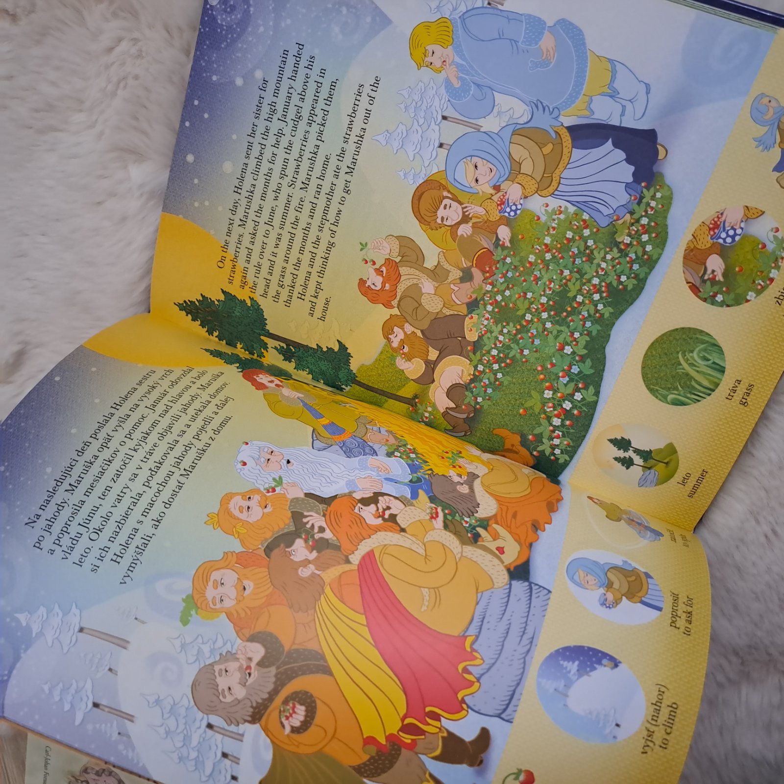 Krásne ilustrovaná detská rozprávková knižka s ôsmimi tradičnými rozprávkami preložená aj do angličtiny. Na spodku každej strany sú aj ilustrované slovíčka pre lepšie zapamätamie.