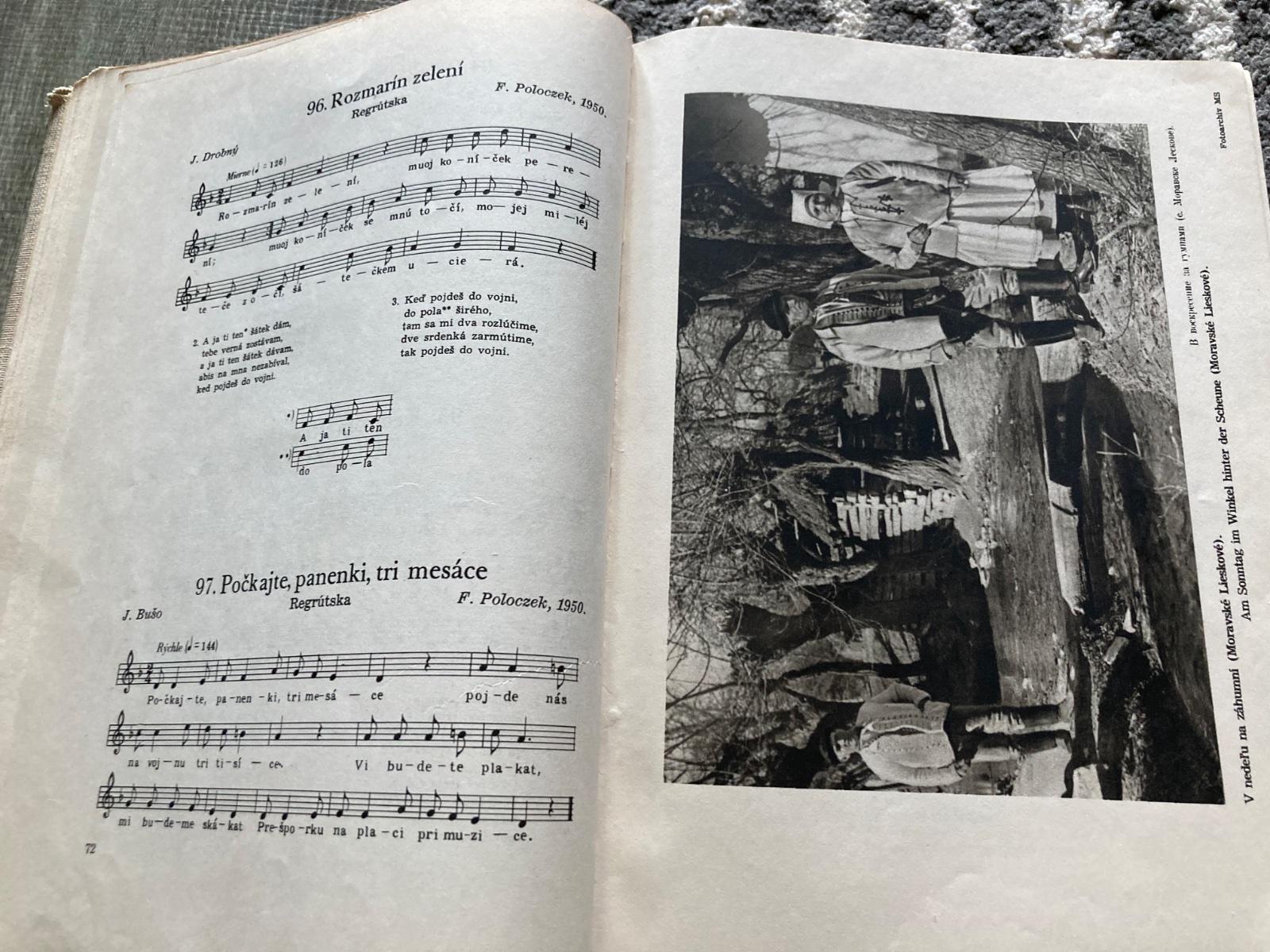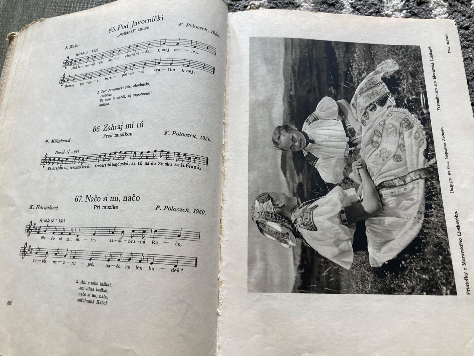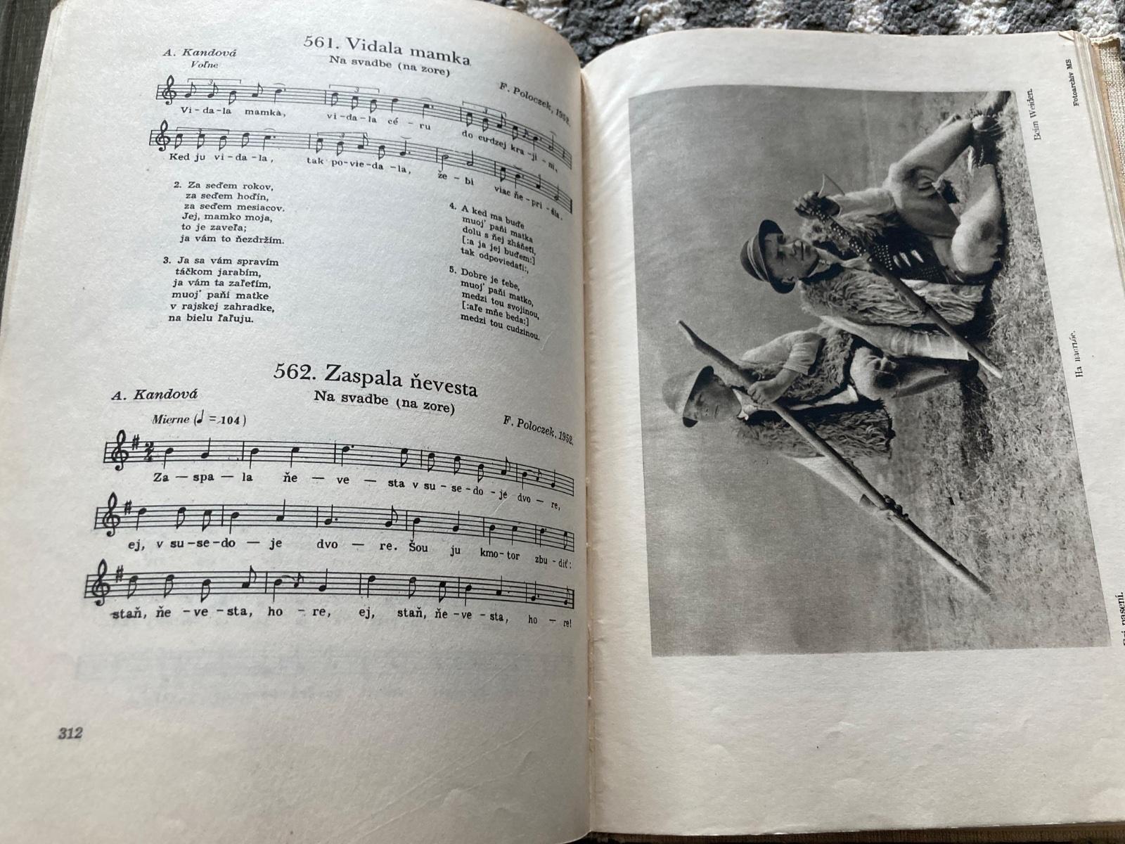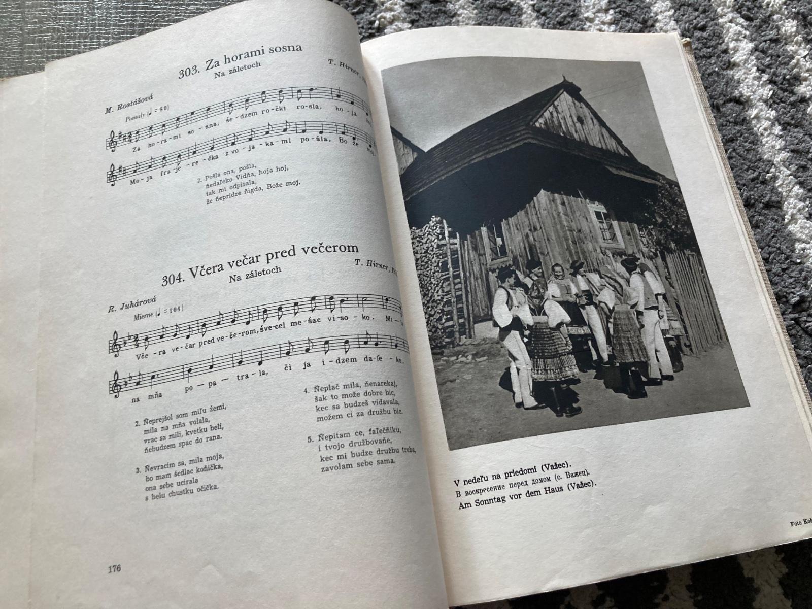 pekný stav, krásna retro kniha vo veľkom formáte, zachovalá s nádhernými fotografiami, vydanie z roku 1953, pekné strany, vpredu len jedna pečiatka a pri nej krátky vpis, vpredu dvakrát napísané číslo inak bez akýchkoľvek vpisov, chýba papierový prebal, obal mierne opotrebovaný, zriedkavý výskyt na trhu, obsahuje veľmi veľa ľudových piesní